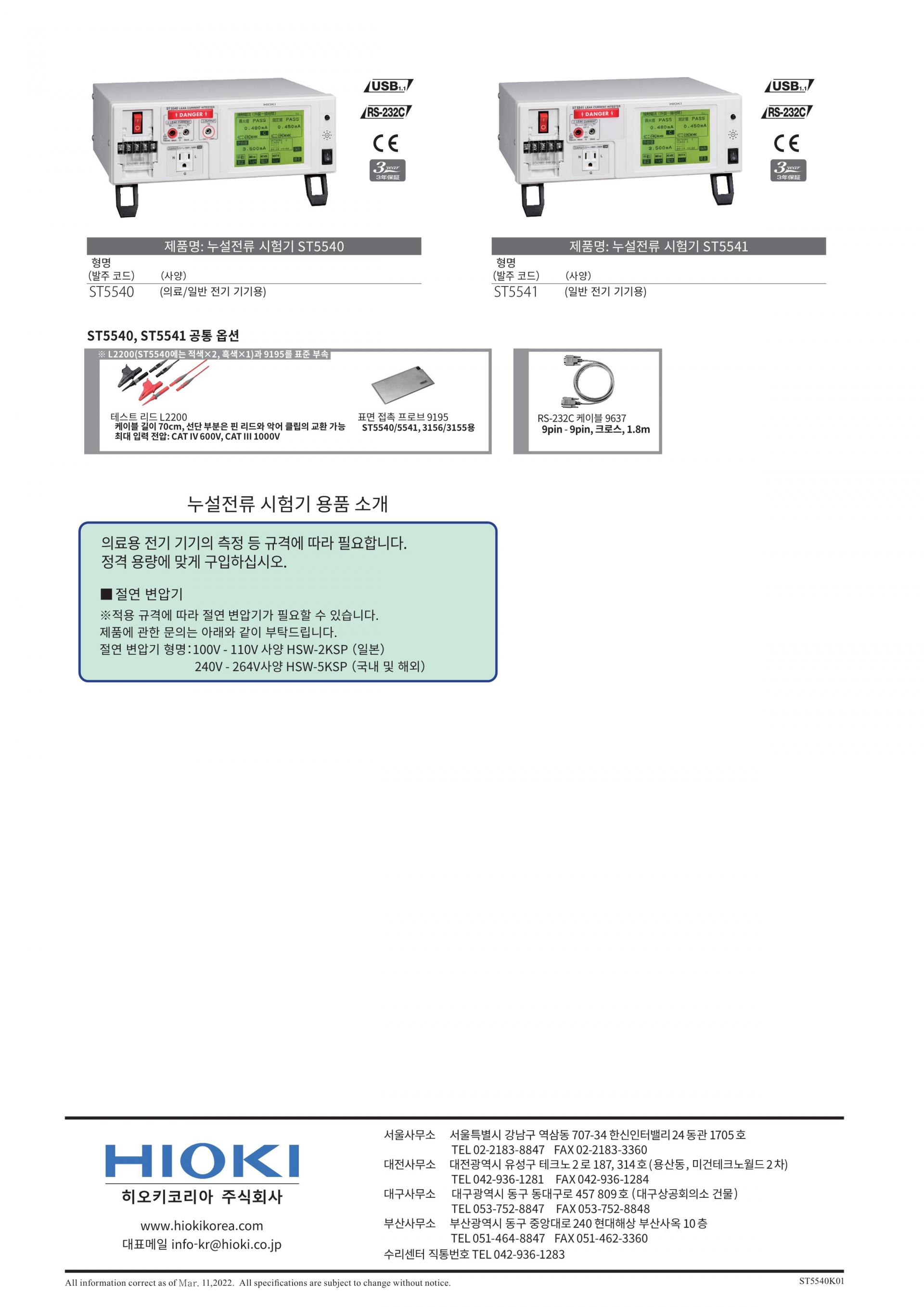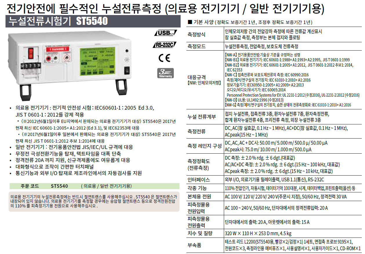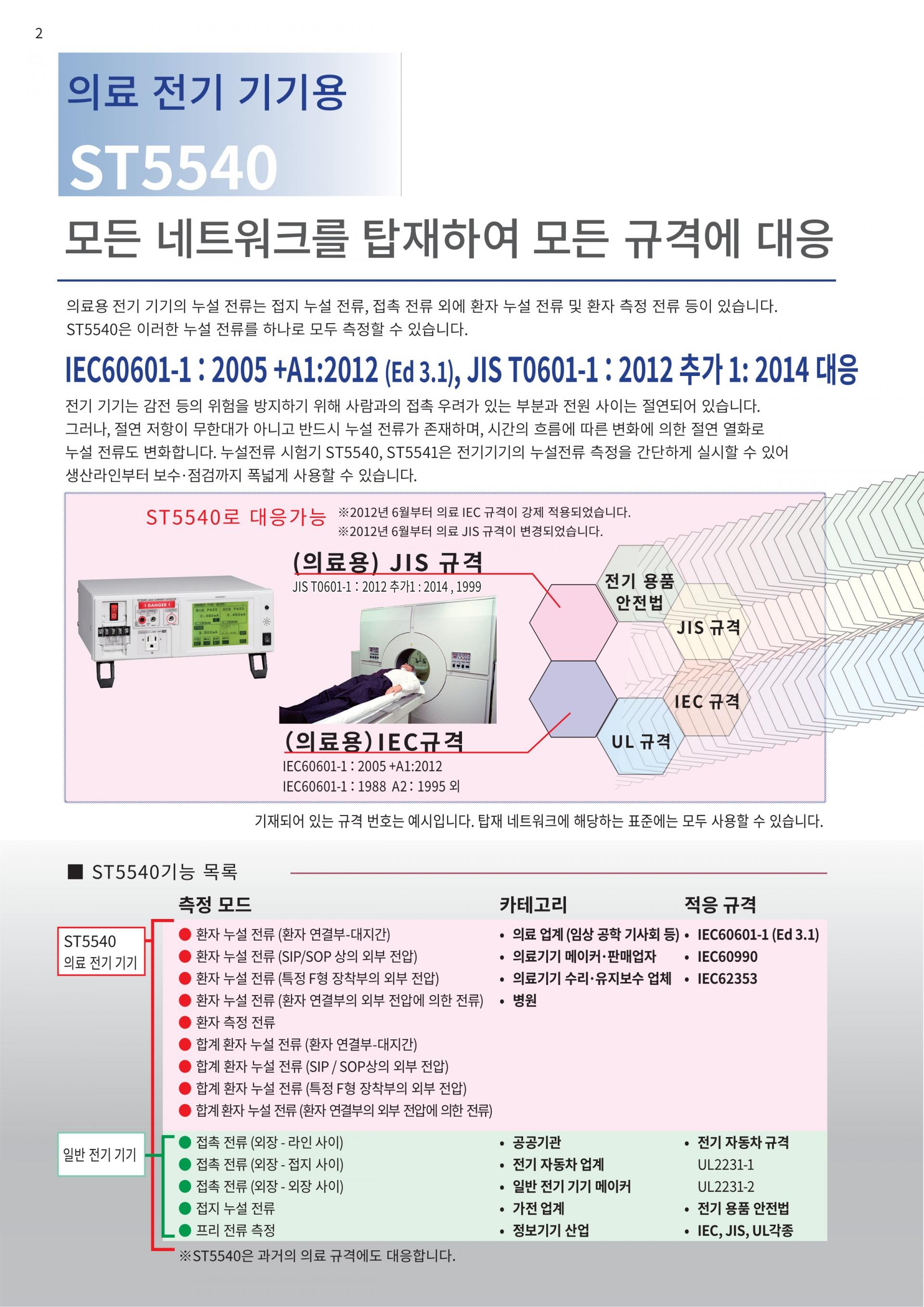 (※ 2017년 6월 1일 이후 일본에서 판매되는 의료기기 대상) ST5540은 2017년 현재 최신 JIS T 0601-1 : 2012 추가보충 1 : 2014에 대응 - 일반 전기기기 : 전기용품 안전법 / JIS / IEC / UL 규격에 대응
