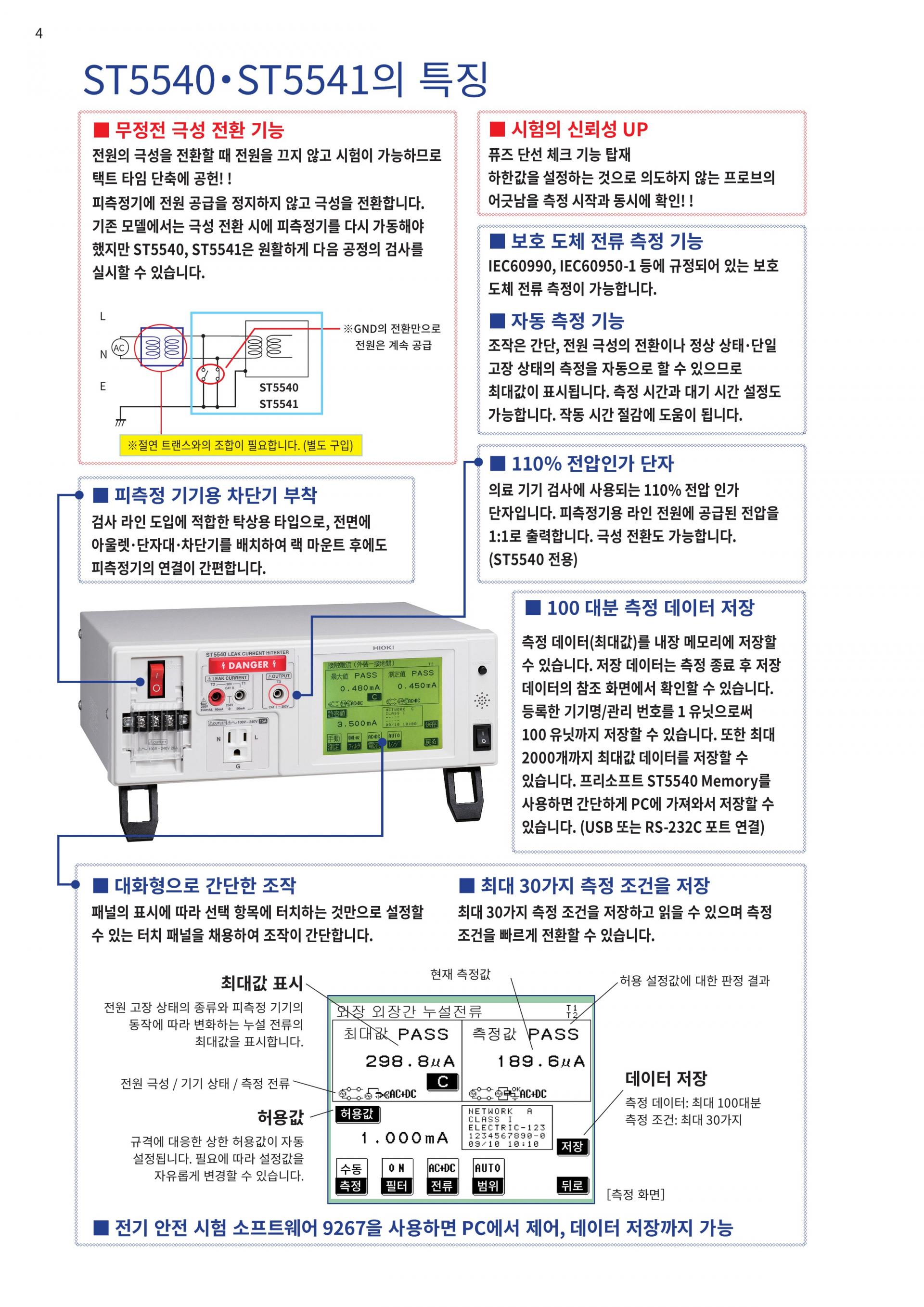 조작 시간 단축을 위한 자동 측정 기능전원 극성의 전환 및 정상 상태, 단일 고장 상채 측정이 자동으로 가능합니다. |