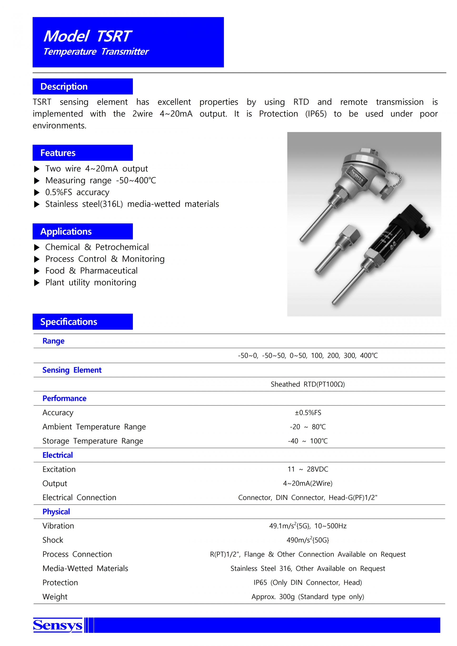 TSRT모델은 온도감지소자로 RTD를 사용하여 특성이 우수하며, 2선 4~20mA출력으로 원거리전송이 가능하다.