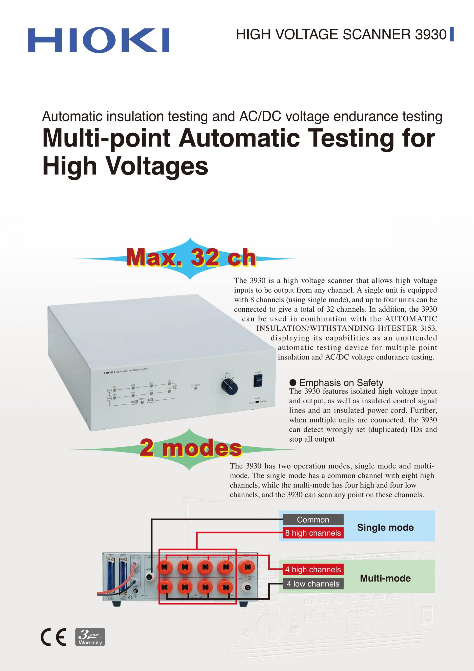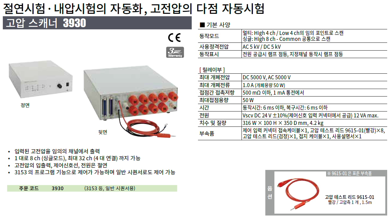 고전압의 다점 자동 시험3930은 입력된 고전압을 임의의 채널에서 출력하는 고압 스캐너입니다. 1대 8채널(싱글 모드)로 최대 4대(32 채널)까지 연결할 수 있습니다. HIOKI 자동 절연 내압 시험기 3153과의 조합하면 다점의 절연 내압 시함의 자동화가 실현됩니다. | ![]() |