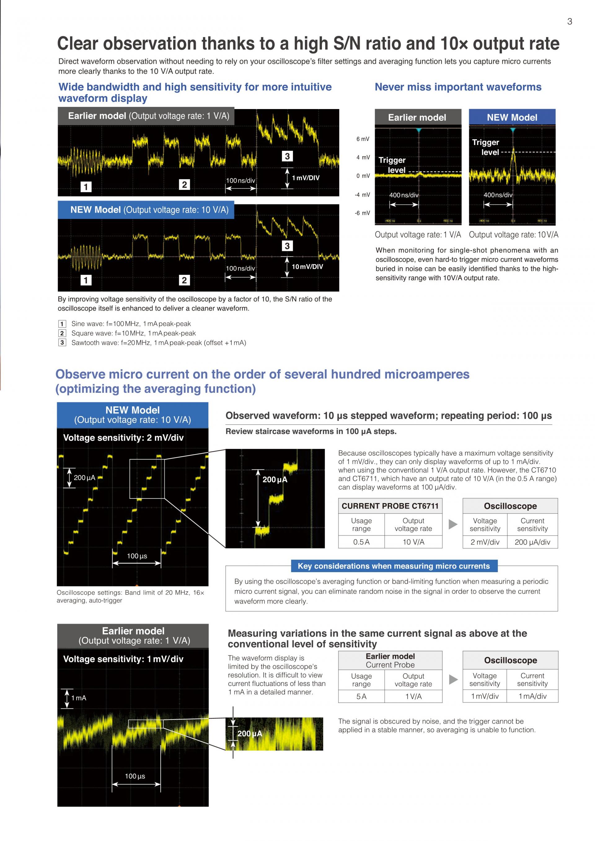 - 높은 S/N비와 10배의 출력율 : 오실로스코프의 최고 전압 감도 1mV/div 설정 시 100μA/div로 파형 표시 가능