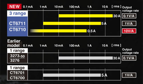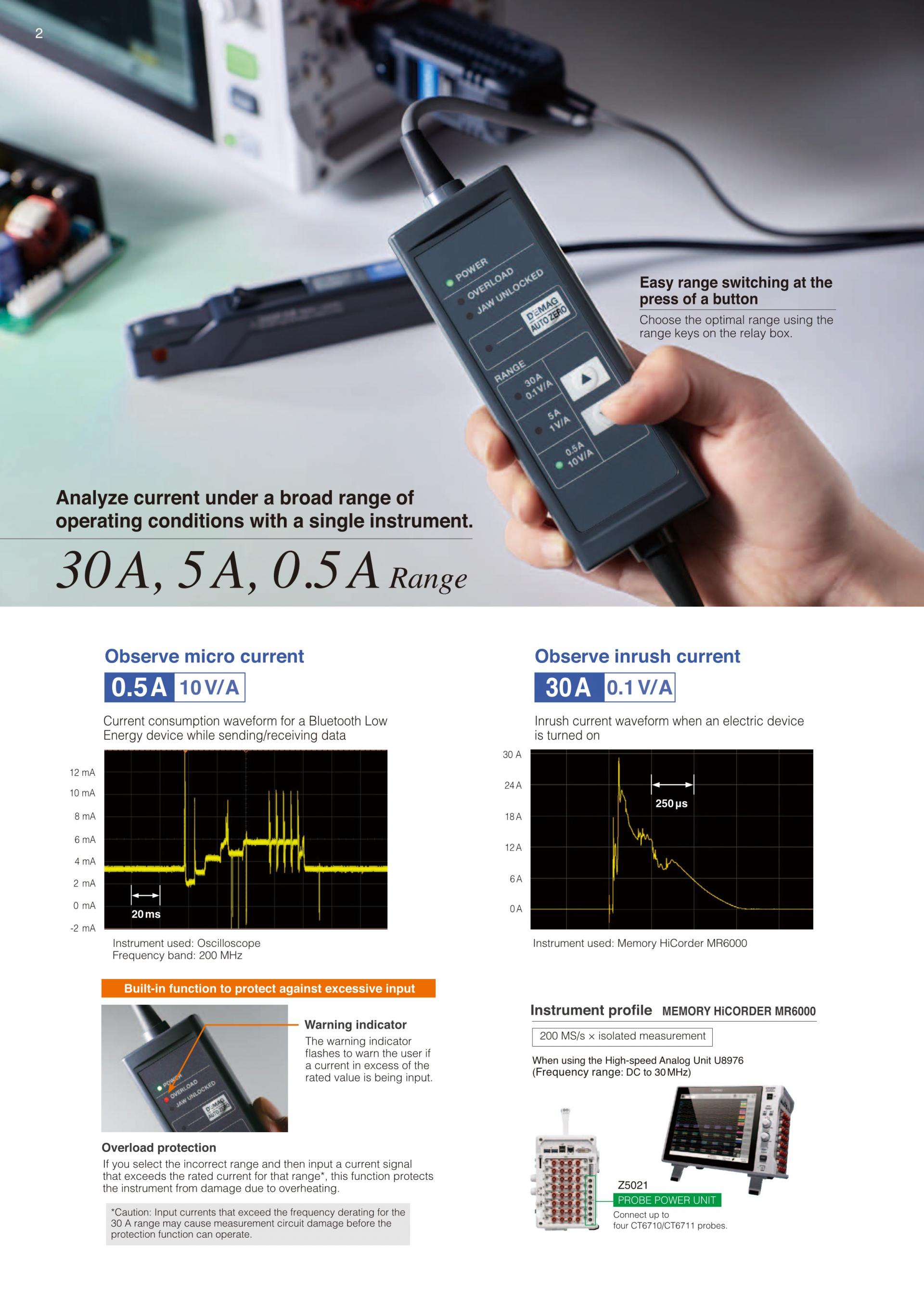 - 30A, 5A, 0.5A의 3레인지 탑재, 1대로 대전류 30A부터 미소전류까지 폭 넓게 파형 관측