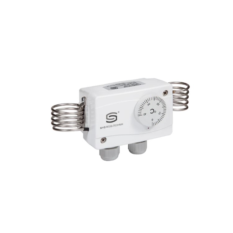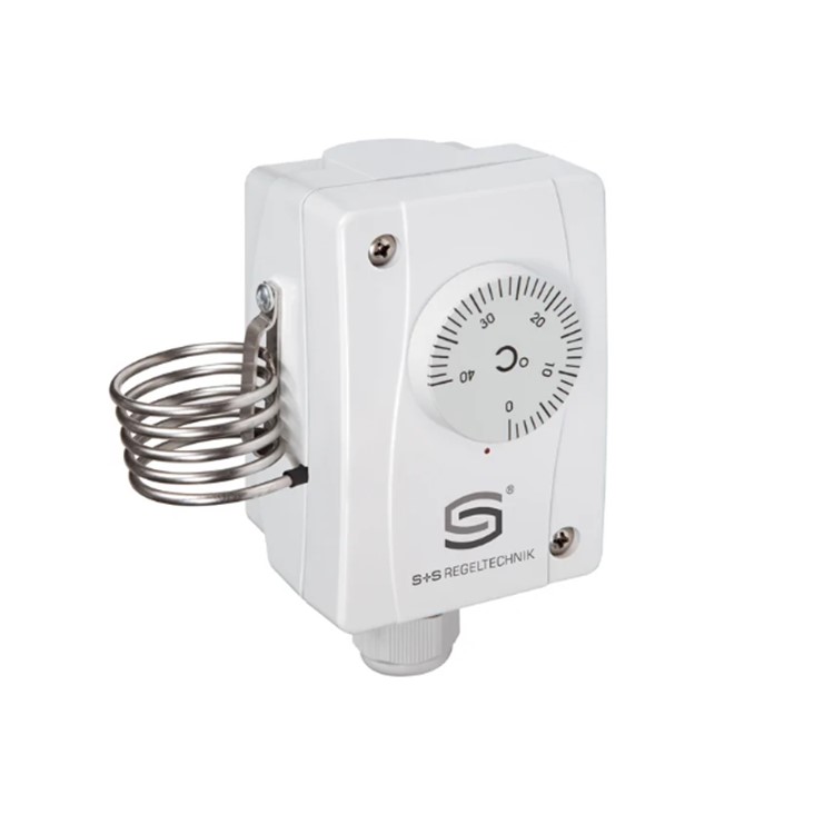 기계식 THERMASREG® TR 040 / TR 060 온도 또는 습식 실내 온도 컨트롤러(스위칭 출력(1단계)) 및 외부 전압 없이 작동하는 스테인리스 스틸 모세관(나선형 코일 센서).