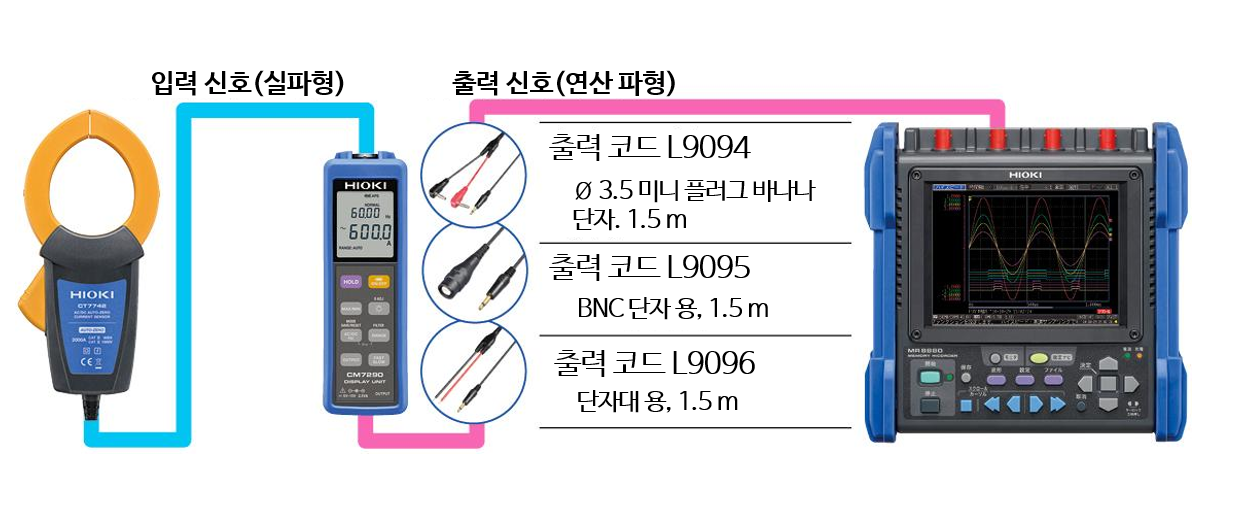 기록계 등에 출력 연결 방법※ AC 플렉시블 커런트 센서 CT7000 시리즈는 단품만으로는 사용할 수 없습니다. 메모리 하이코더 / 로거 등의 연결 사용에 있어서는 디스플레이 유닛 CM7290, CM7291와 세트로 사용하십시오. | ![]() |