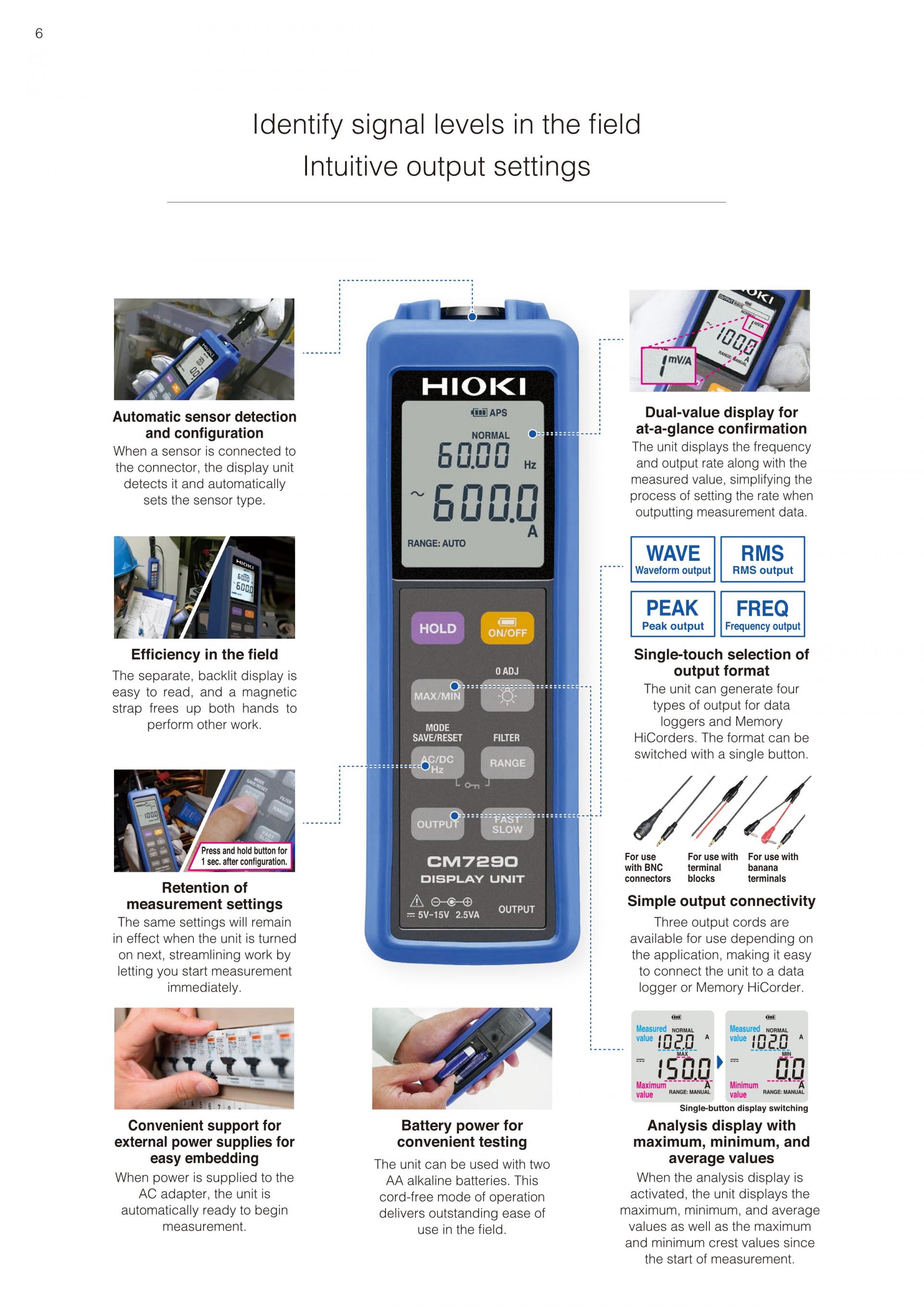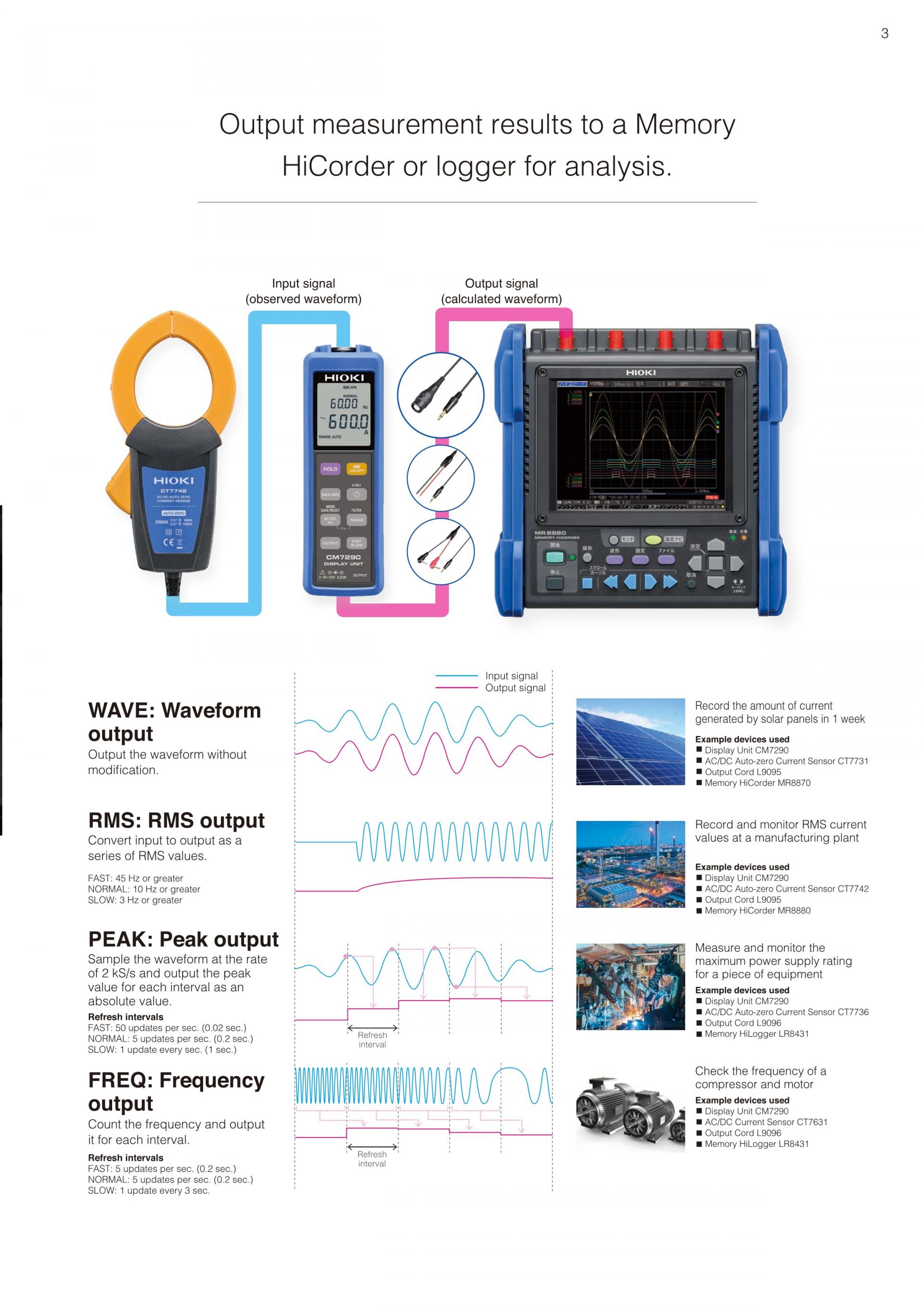 - 로거 및 메모리 하이코더에 4 개 형식으로 출력 가능 (파형, 실효값, 피크, 주파수)