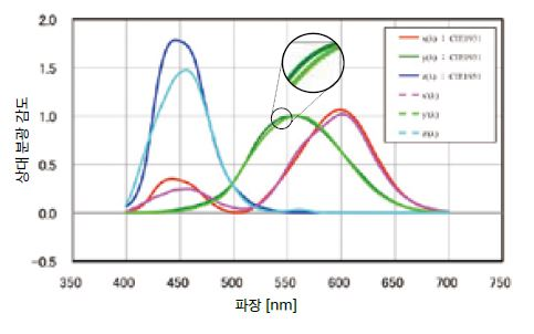 레이저 측광의 과제 "등색 함수와의 근사 한계"삼자극치 방식인 색채계와 같은 일반적인 측색계는 광학필터를 조합해 등색 함수와의 근사를 수행합니다 . 하지만 광학필터 ( 물리 필터) 에 의한 등색 함수로의 근사에는 한계가 있습니다 . 단색 레이저의 스펙트럼 폭은 매우 좁기 때문에 등색 함수에 대한 근사 오차뿐만 아니라 , 필터의 편차 ( 개체차) 가 측정값의 차이로 나타나게 됩니다. | ![]() |