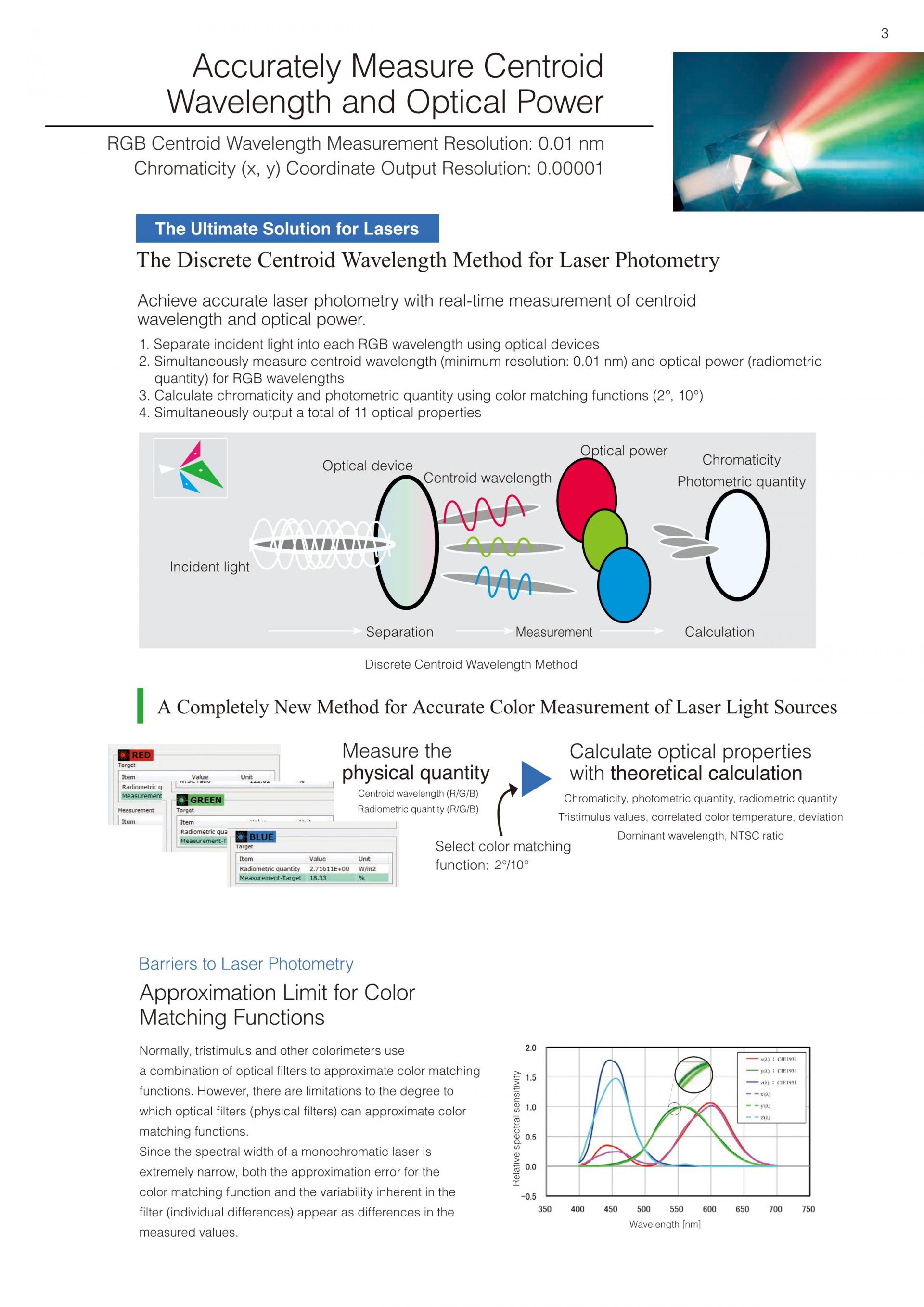 레이저 측광을 위해 개발된 "분리중심파장방식"삼자극치 방식인 색채계와 같은 일반적인 측색계는 광학필터를 조합해 등색 함수와의 근사를 수행합니다 . 하지만 광학필터 ( 물리 필터) 에 의한 등색 함수로의 근사에는 한계가 있습니다 . 단색 레이저의 스펙트럼 폭은 매우 좁기 때문에 등색 함수에 대한 근사 오차뿐만 아니라 , 필터의 편차 ( 개체차) 가 측정값의 차이로 나타나게 됩니다. | ![]() |
