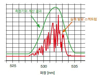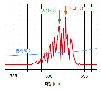 레이저 측광의 주의점 여러 피크 파장과 중심 파장400nm 부터 700nm 의 가시광 파장영역에 비해 레이저광은 매우 폭이 좁은 스펙트럼을 가지고 있습니다 . 하지만 단색 레이저의 파장영역만 측정하면 복잡한 스펙트럼으 | ![]() |