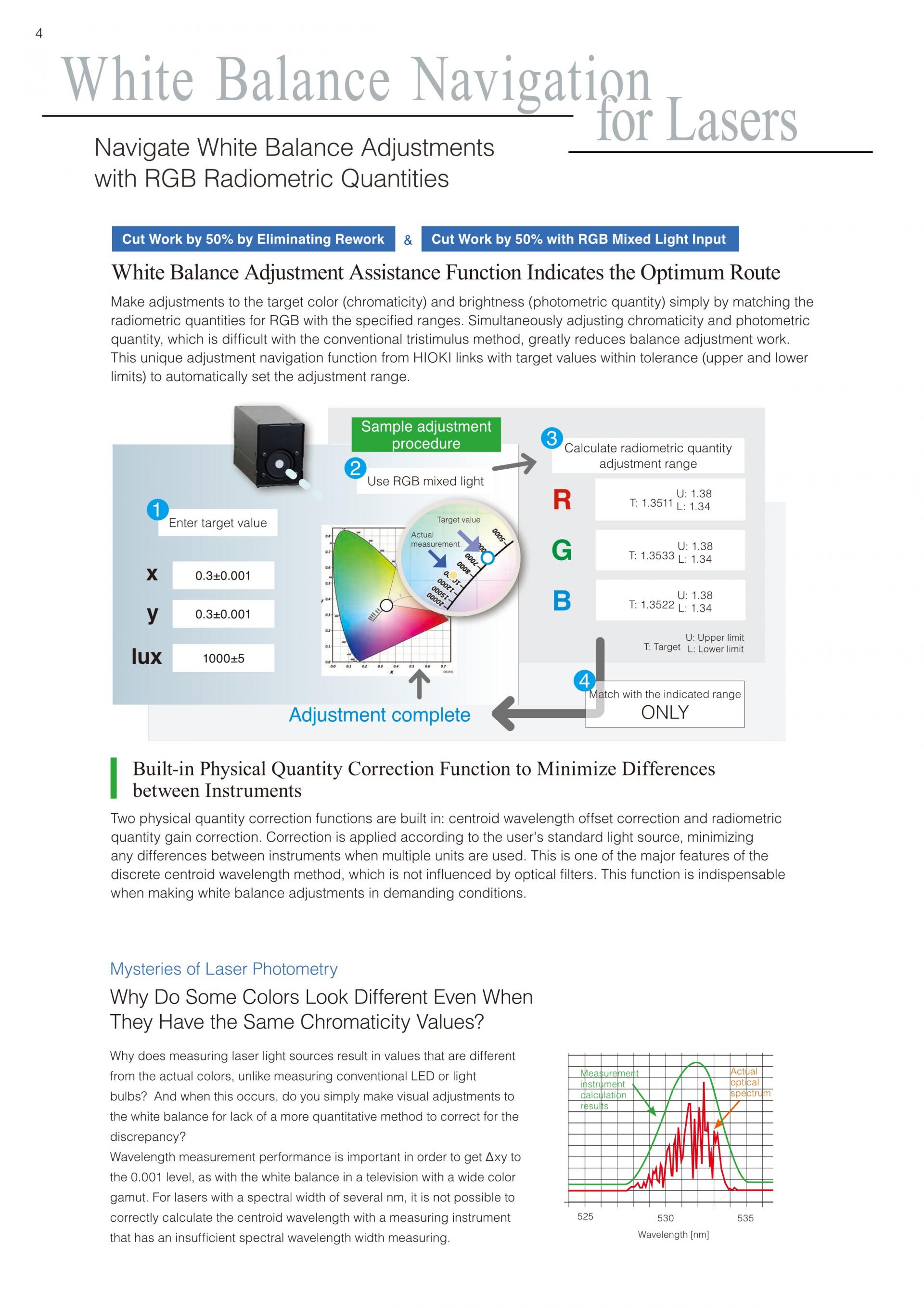 화이트 밸런스 조정 보조기능으로 최적의 루트를 지시화이트 밸런스 조정 보조기능으로 레이저 디스플레이가 목표하는 "White"로의 최적의 루트를 지시합니다. RGB 합성 측정만으로 RGB 각 광원의 최적 방사량을 산출하므로 작업공정 (단색 측정 불필요)과 조정 공수 (재작업 없음)가 줄어듭니다. | ![]() |