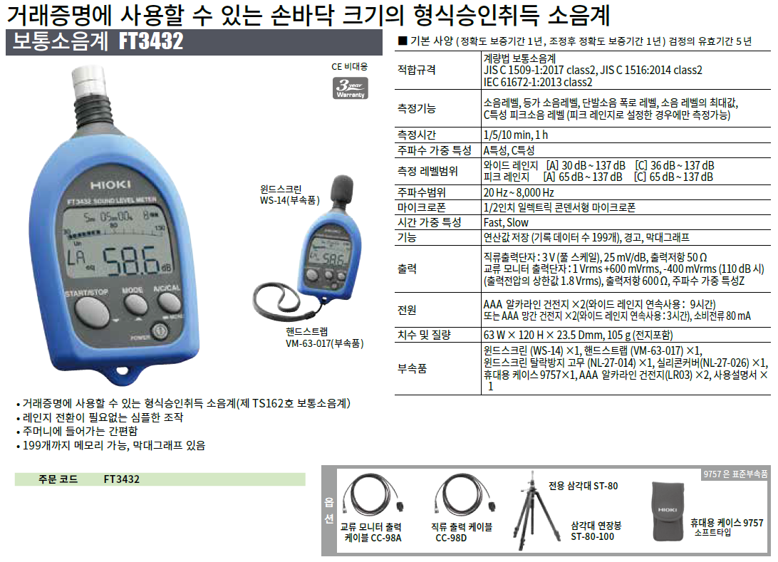 (검정의 유효 기간은 5 년) 보통 소음계 검정 완료 FT3432은 검정 합격품입니다.