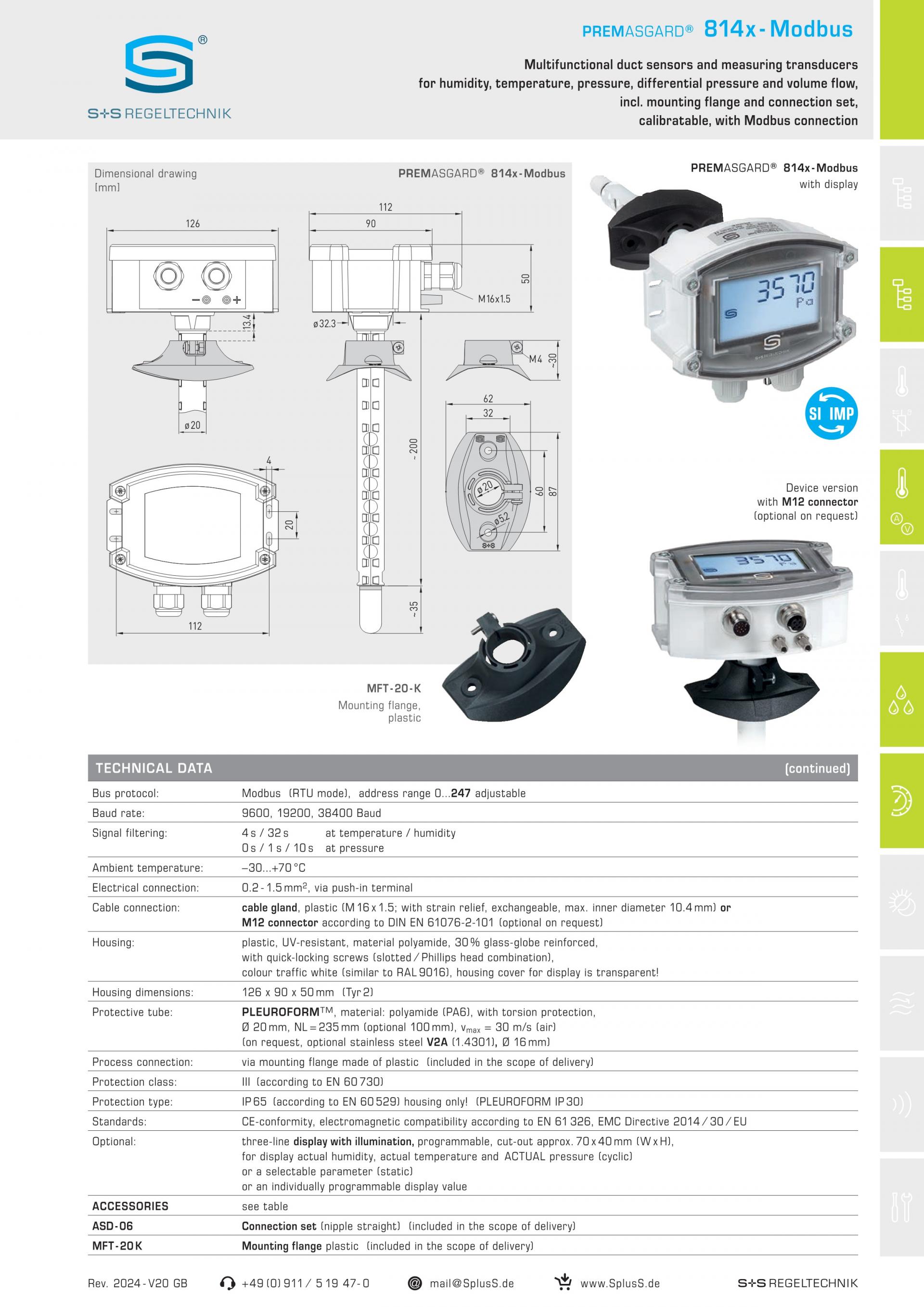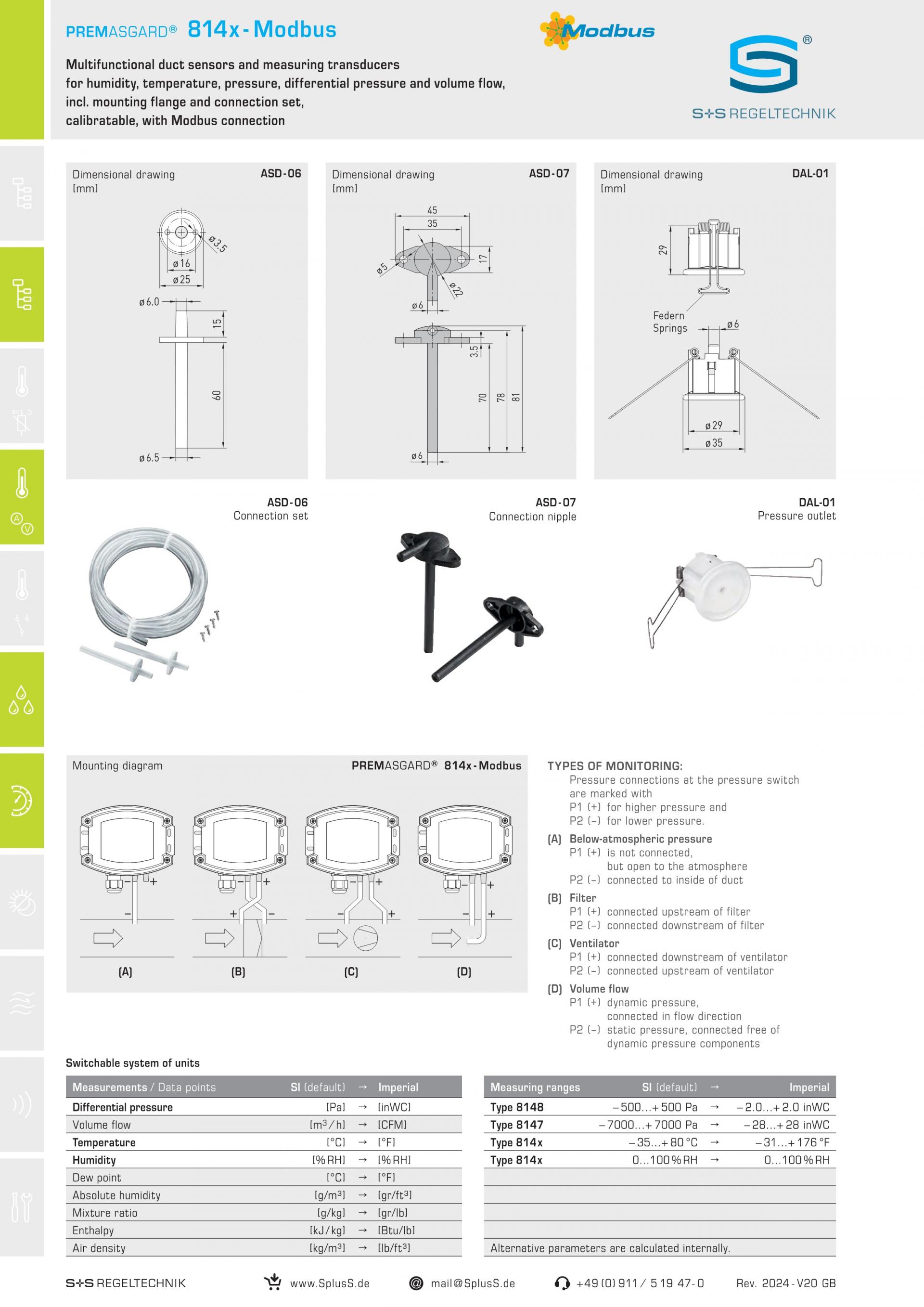 S+S 8147-Modbus Duct humidity and temperature sensors with integrated pressure and differential pressure measuring transducer
