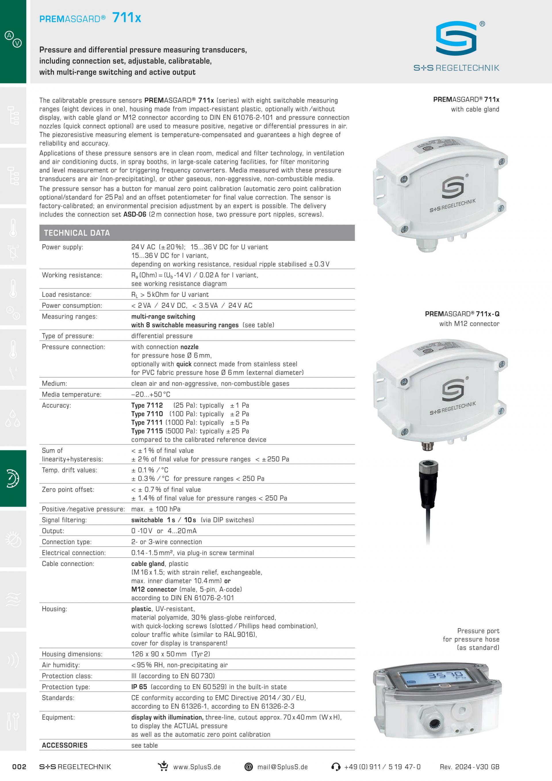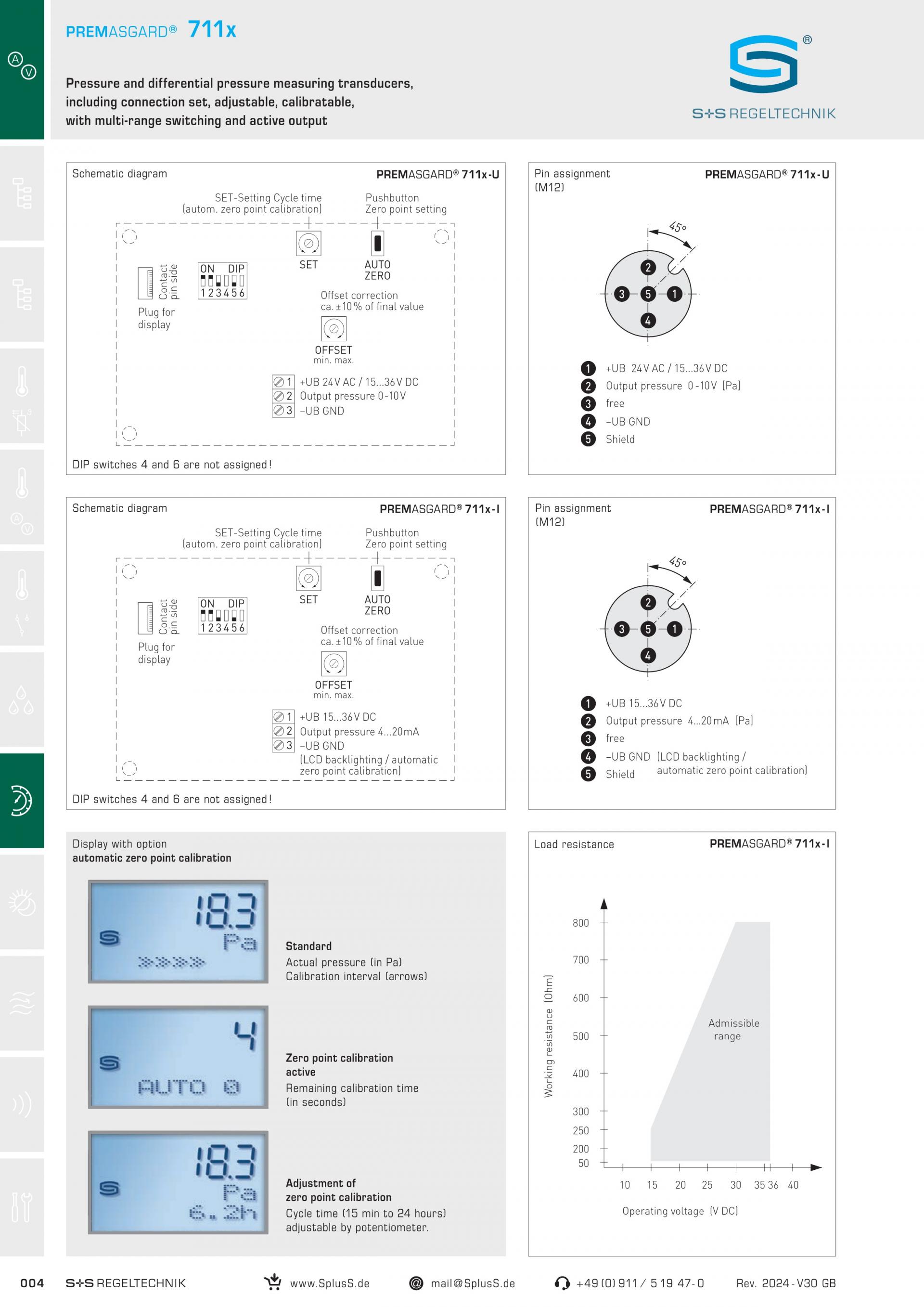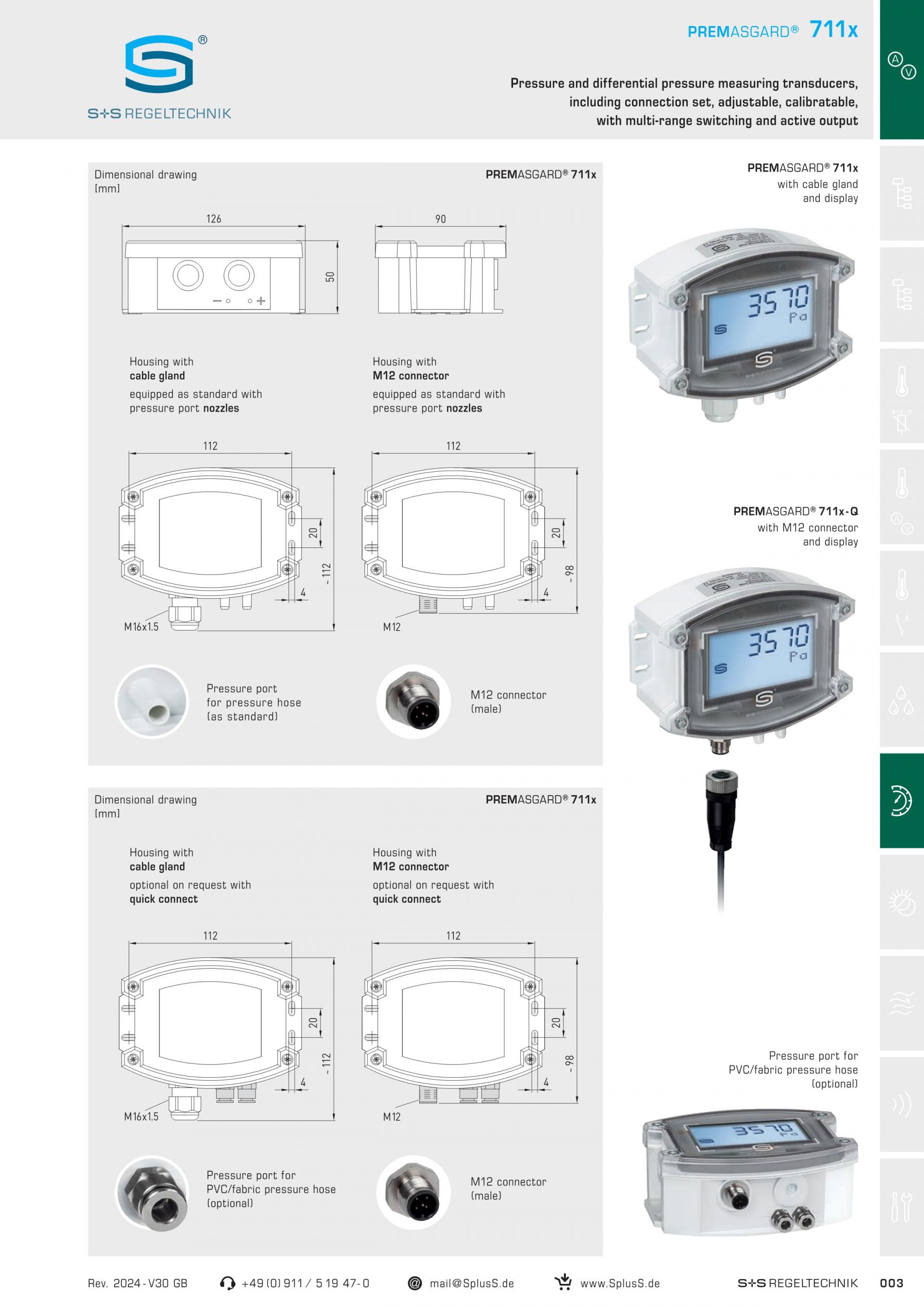 8개의 전환 가능한 측정 범위(하나에 8개의 장치)가 있는 교정 가능한 압력 센서 PREMASGARD® 711x(시리즈), 내충격성 플라스틱으로 제작된 하우징, 선택적으로 디스플레이 포함/미포함, 케이블 글랜드 또는 DIN EN 61076-2-에 따른 M12 커넥터 포함 101 및 압력 연결 노즐(빠른 연결 옵션)은 공기의 양압, 음압 또는 차압을 측정하는 데 사용됩니다. 압저항 측정 요소는 온도 보상되며 높은 수준의 신뢰성과 정확성을 보장합니다.