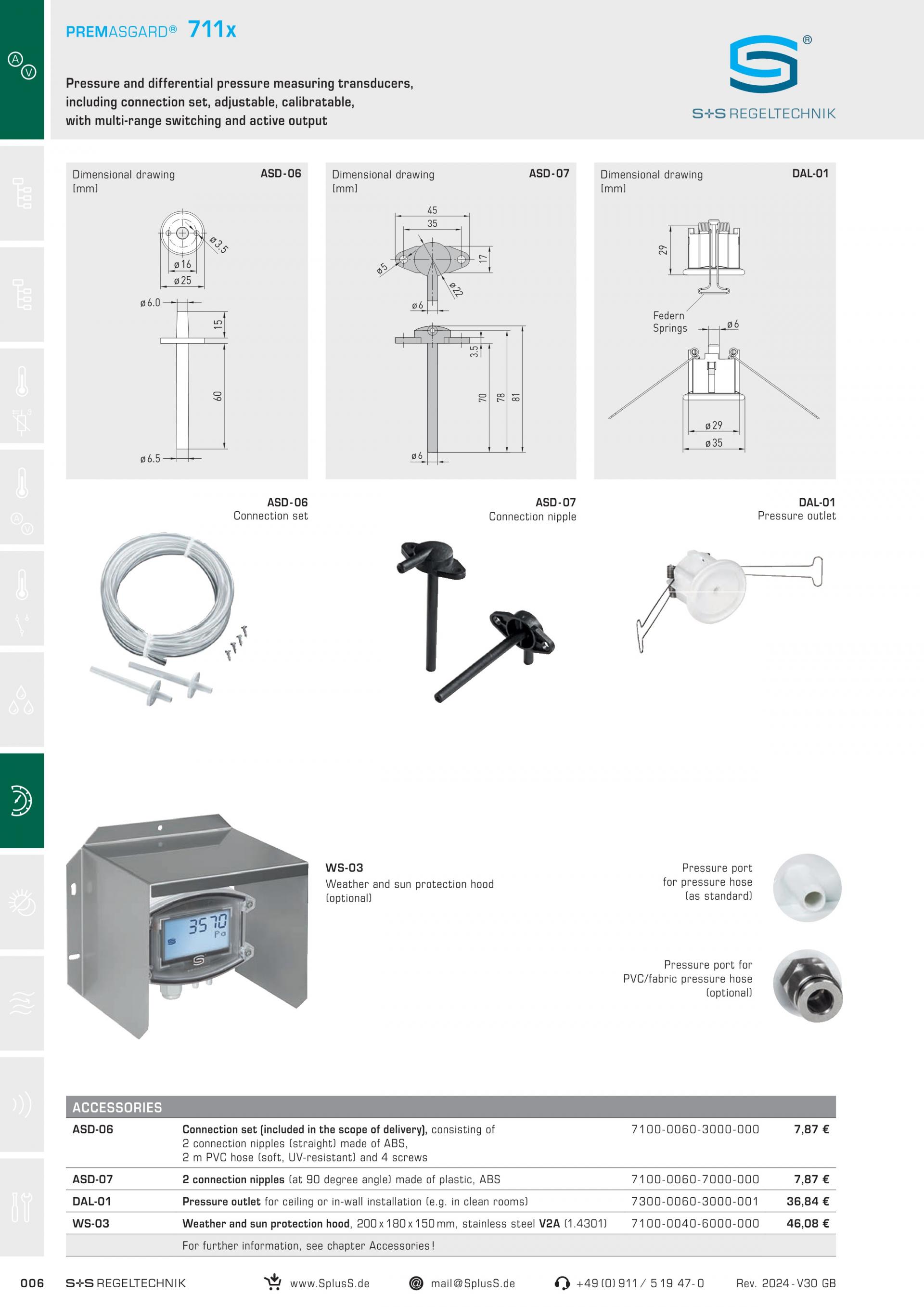 이러한 압력 센서는 클린룸, 의료 및 필터 기술, 환기 및 공조 덕트, 스프레이 부스, 대규모 케이터링 시설, 필터 모니터링 및 레벨 측정 또는 주파수 변환기 트리거에 적용됩니다. 이러한 압력 변환기로 측정되는 매체는 공기(비침전) 또는 기타 기체, 비공격성, 불연성 매체입니다. 압력 센서에는 수동 영점 교정을 위한 버튼(자동 영점 교정 옵션/25 Pa의 경우 표준)과 최종 값 수정을 위한 오프셋 전위차계가 있습니다. 센서는 공장에서 교정되었습니다. 전문가에 의한 환경 정밀 조정이 가능합니다. 배송에는 연결 세트 ASD-06(2m 연결 호스, 2개의 압력 포트 니플, 나사)이 포함됩니다.