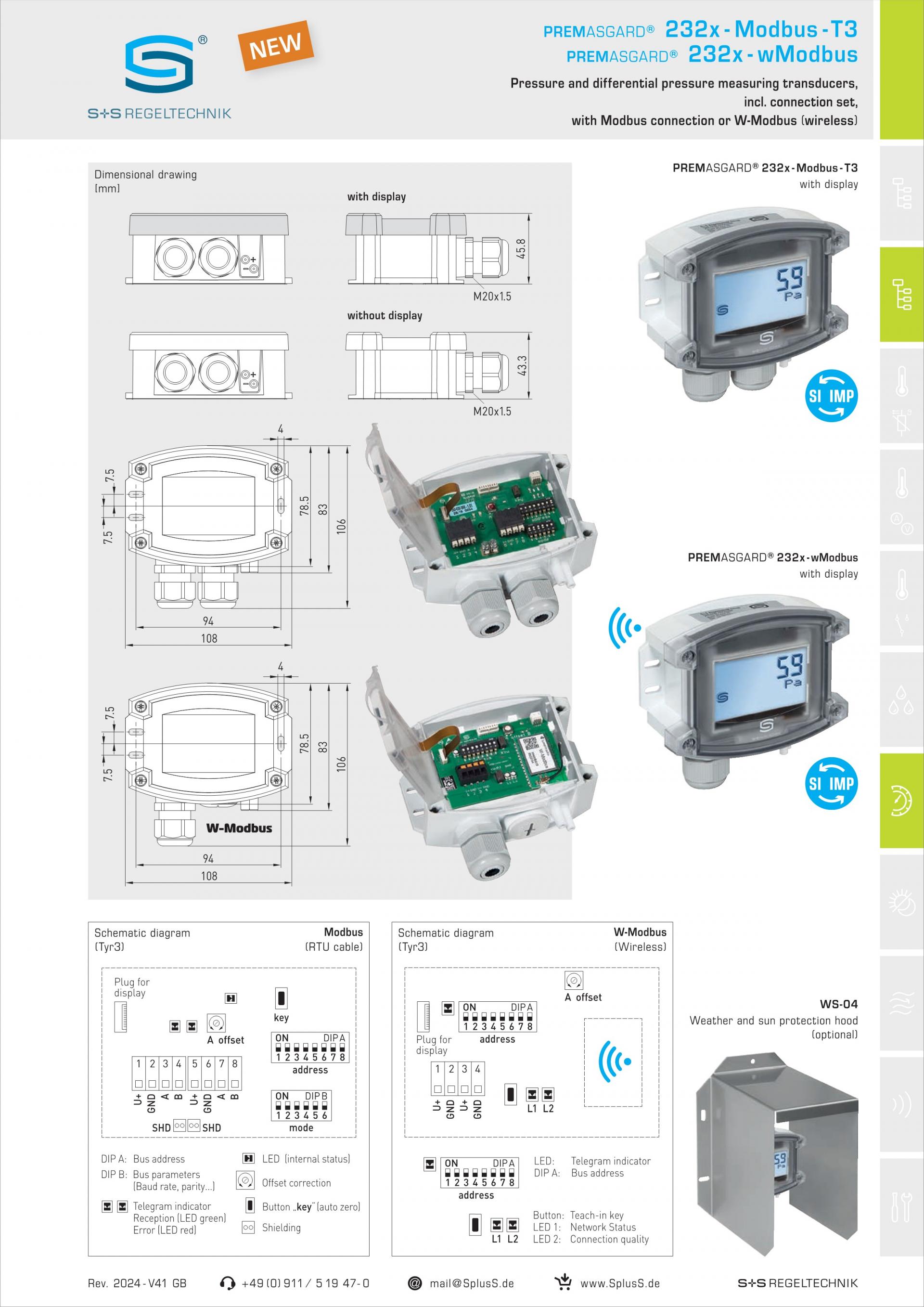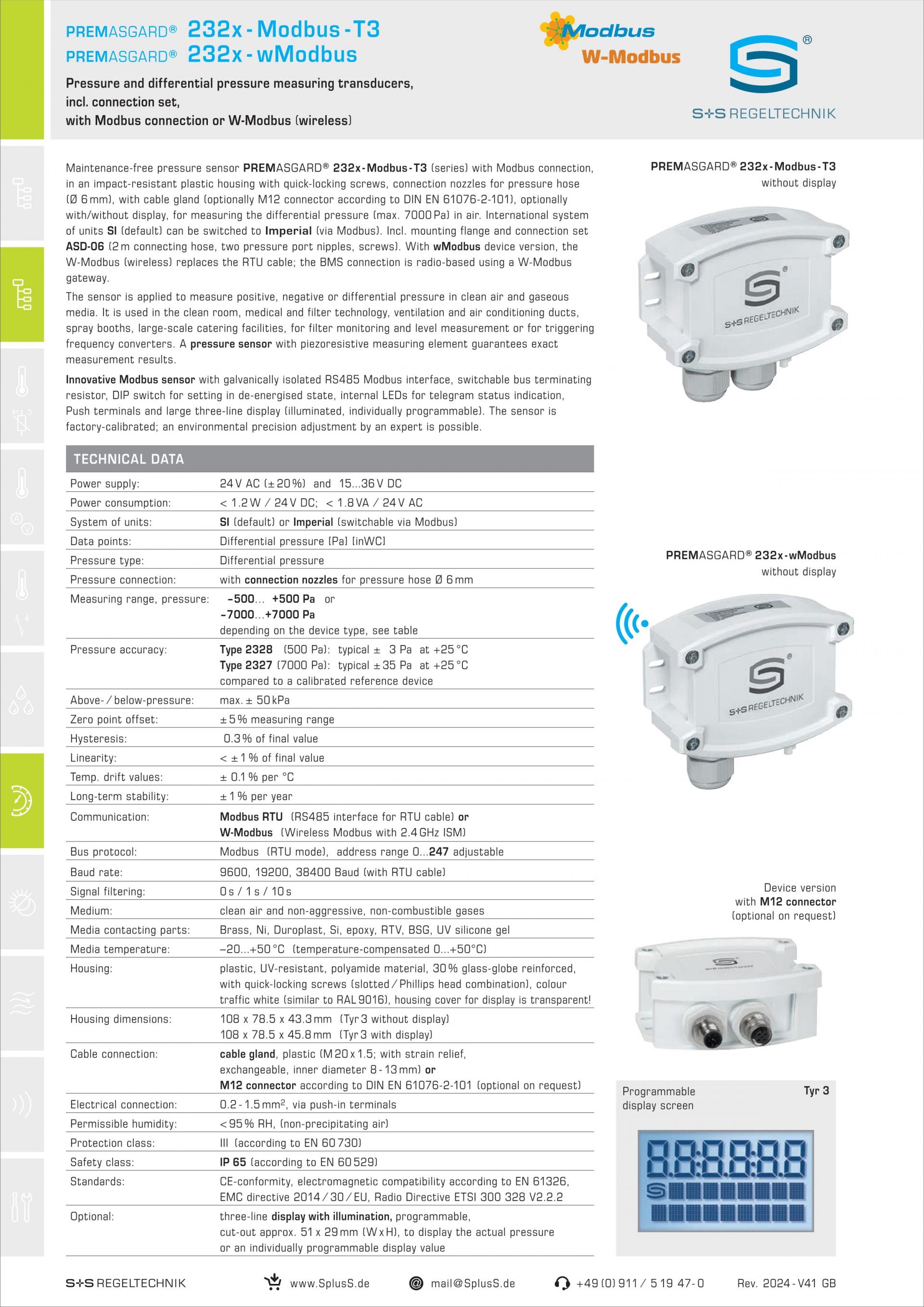 유지 관리가 필요 없는 압력 센서 PREMASGARD® 232x - Modbus - Modbus 연결이 있는 T3(시리즈), 빠른 잠금 나사가 있는 내충격성 플라스틱 하우징, 압력 호스(Ø 6 mm)용 연결 노즐, 케이블 글랜드(선택적으로 M12 커넥터 포함) DIN EN 61076-2-101에 따름), 선택적으로 디스플레이 포함/미포함, 공기 중 차압(최대 7000 Pa) 측정용. 국제 단위계 SI(기본값)를 영국식 단위(Modbus를 통해)로 전환할 수 있습니다. 포함. 장착 플랜지 및 연결 세트 ASD-06(2m 연결 호스, 2개의 압력 포트 니플, 나사).
