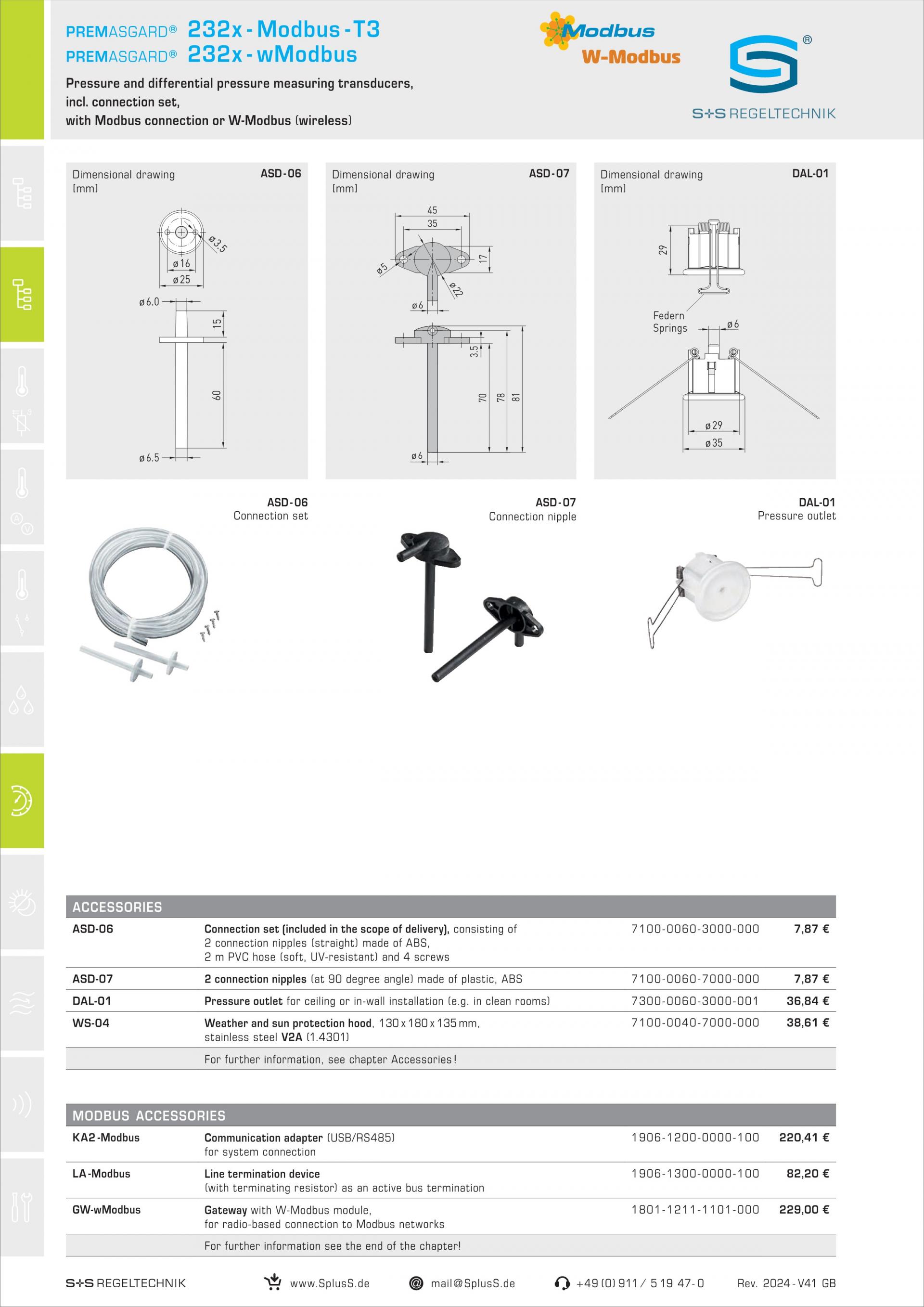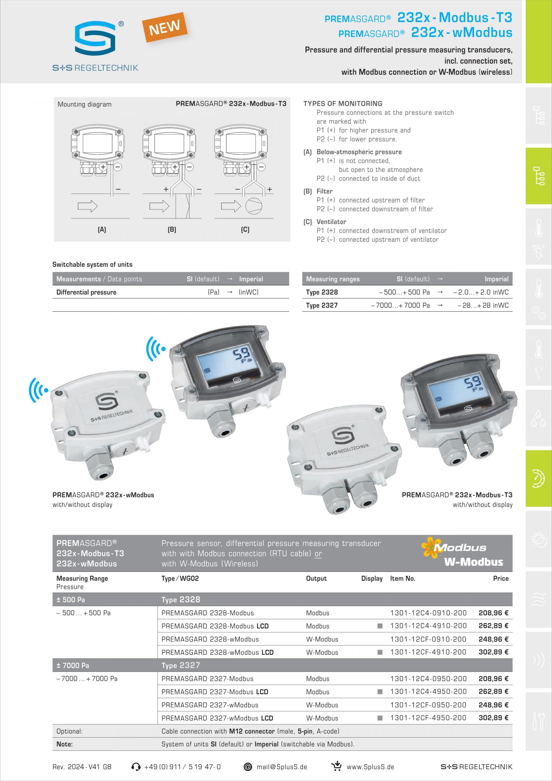 유지 관리가 필요 없는 압력 센서 PREMASGARD® 232x - Modbus - Modbus 연결이 있는 T3(시리즈), 빠른 잠금 나사가 있는 내충격성 플라스틱 하우징, 압력 호스(Ø 6 mm)용 연결 노즐, 케이블 글랜드(선택적으로 M12 커넥터 포함) DIN EN 61076-2-101에 따름), 선택적으로 디스플레이 포함/미포함, 공기 중 차압(최대 7000 Pa) 측정용. 국제 단위계 SI(기본값)를 영국식 단위(Modbus를 통해)로 전환할 수 있습니다. 포함. 장착 플랜지 및 연결 세트 ASD-06(2m 연결 호스, 2개의 압력 포트 니플, 나사).