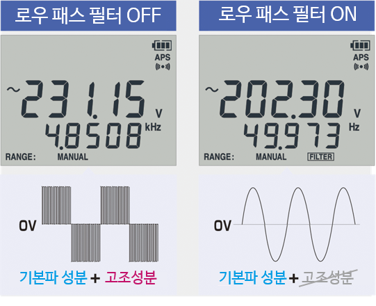 고조파 성분을 커트, 인버터 2차측 출력전압을 정확히 측정로우패스 필터 기능으로 고조파 성분을 차단, 기본파만을 정확하게 측정할 수 있습니다. | ![]() |