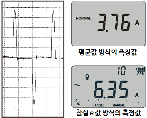 왜곡된 파형도 정확하게 측정할 수 있는 True RMS 측정디지털 멀티 미터의 측정 방식에는, 평균 방식과 True RMS 방식 2 가지가 있습니다.왜곡이 많은 전류 파형의 경우 측정 방식에 따라 측정 결과가 크게 달라집니다. 정확한 측정을 위해서는 True RMS 방식의 측정기를 사용해야합니다. | ![]() |