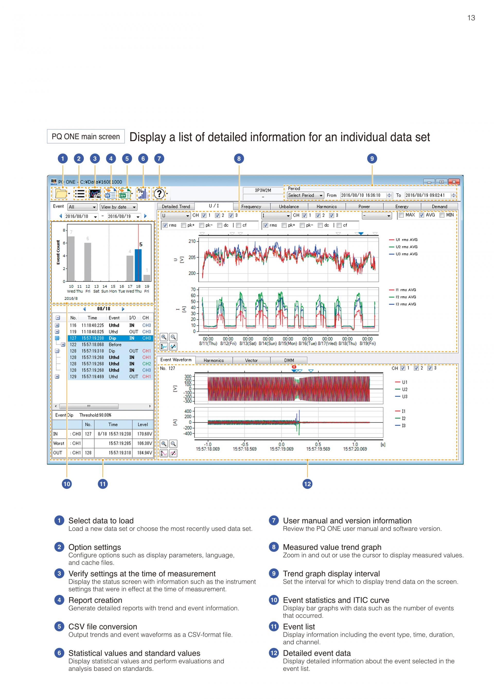 - 최장 이벤트 발생 전 1 초, 발생 후 10 초의 파형을 기록 가능