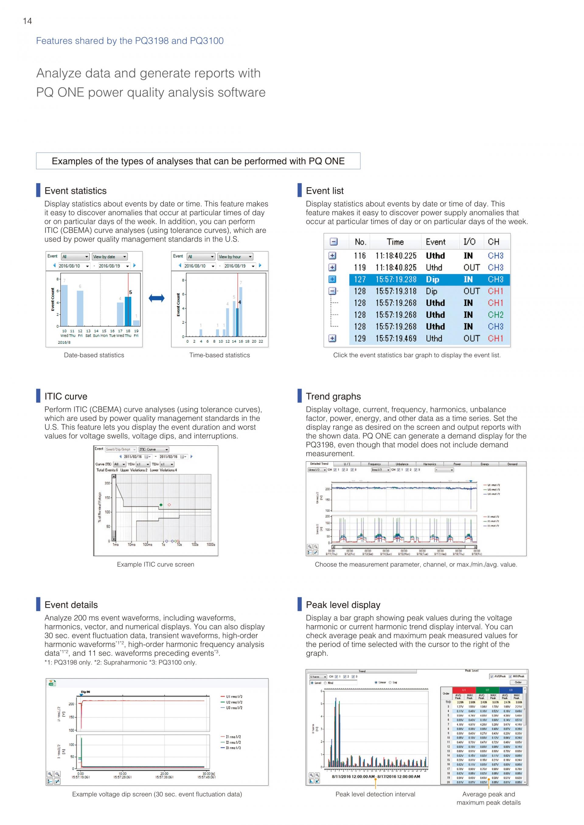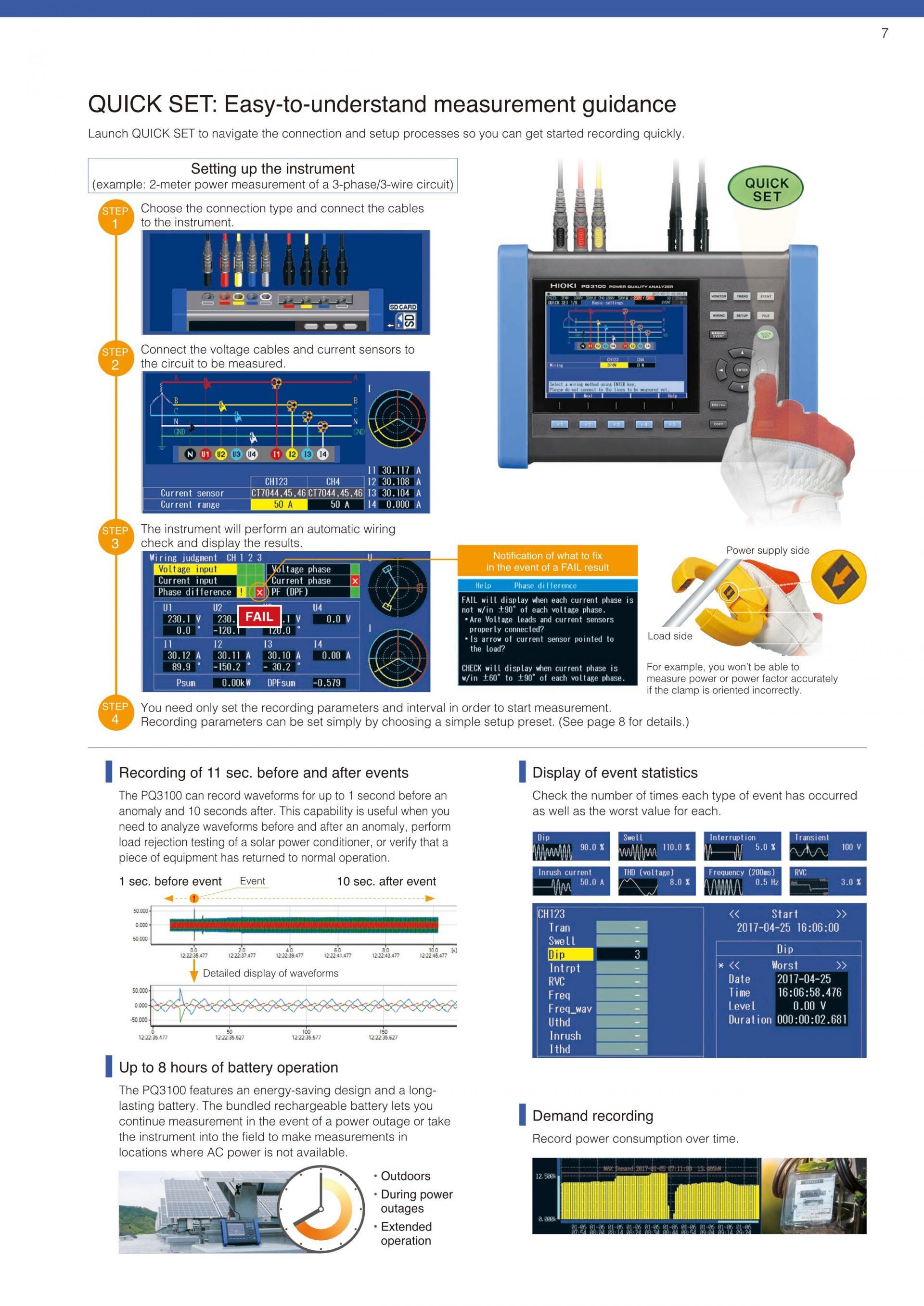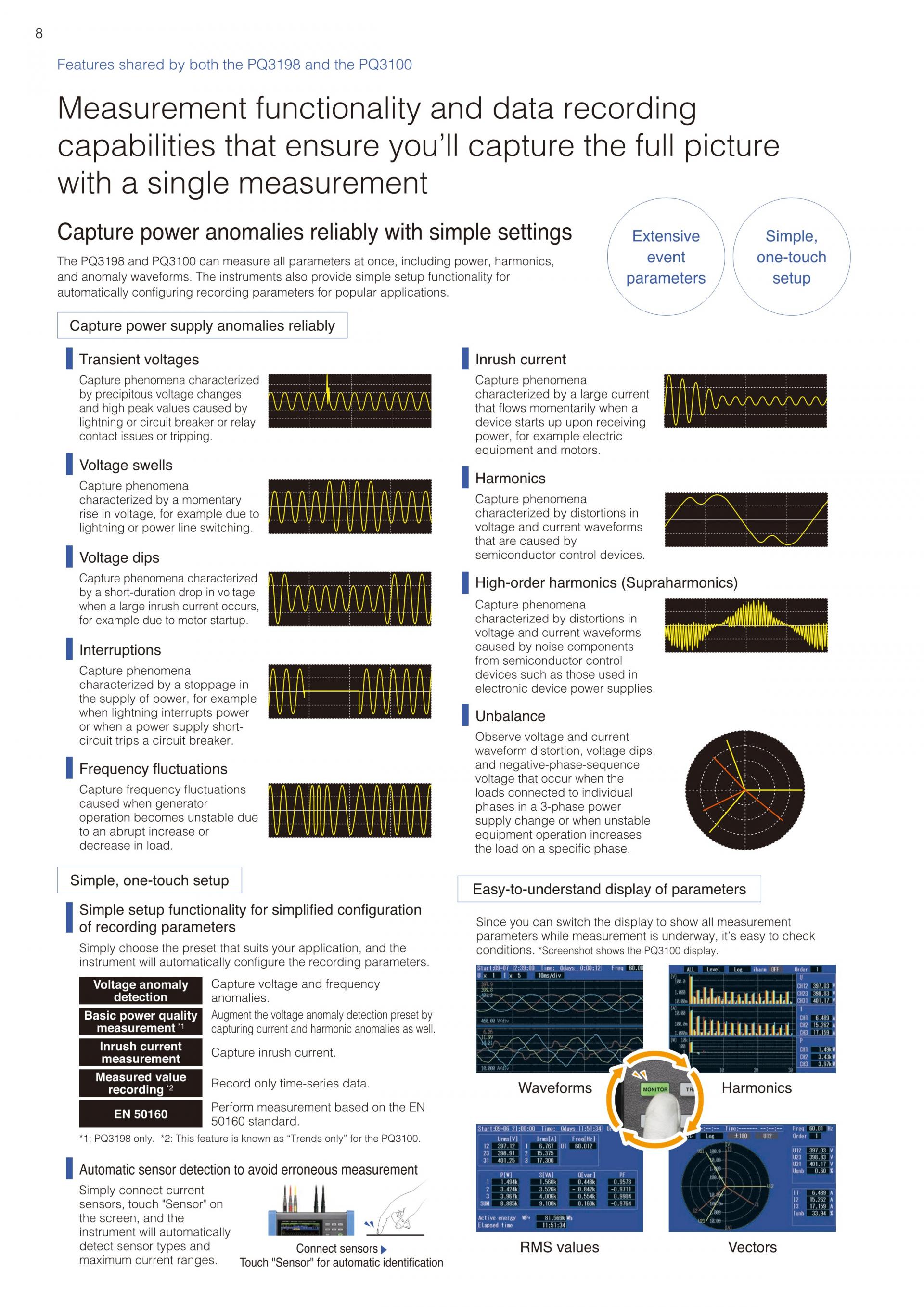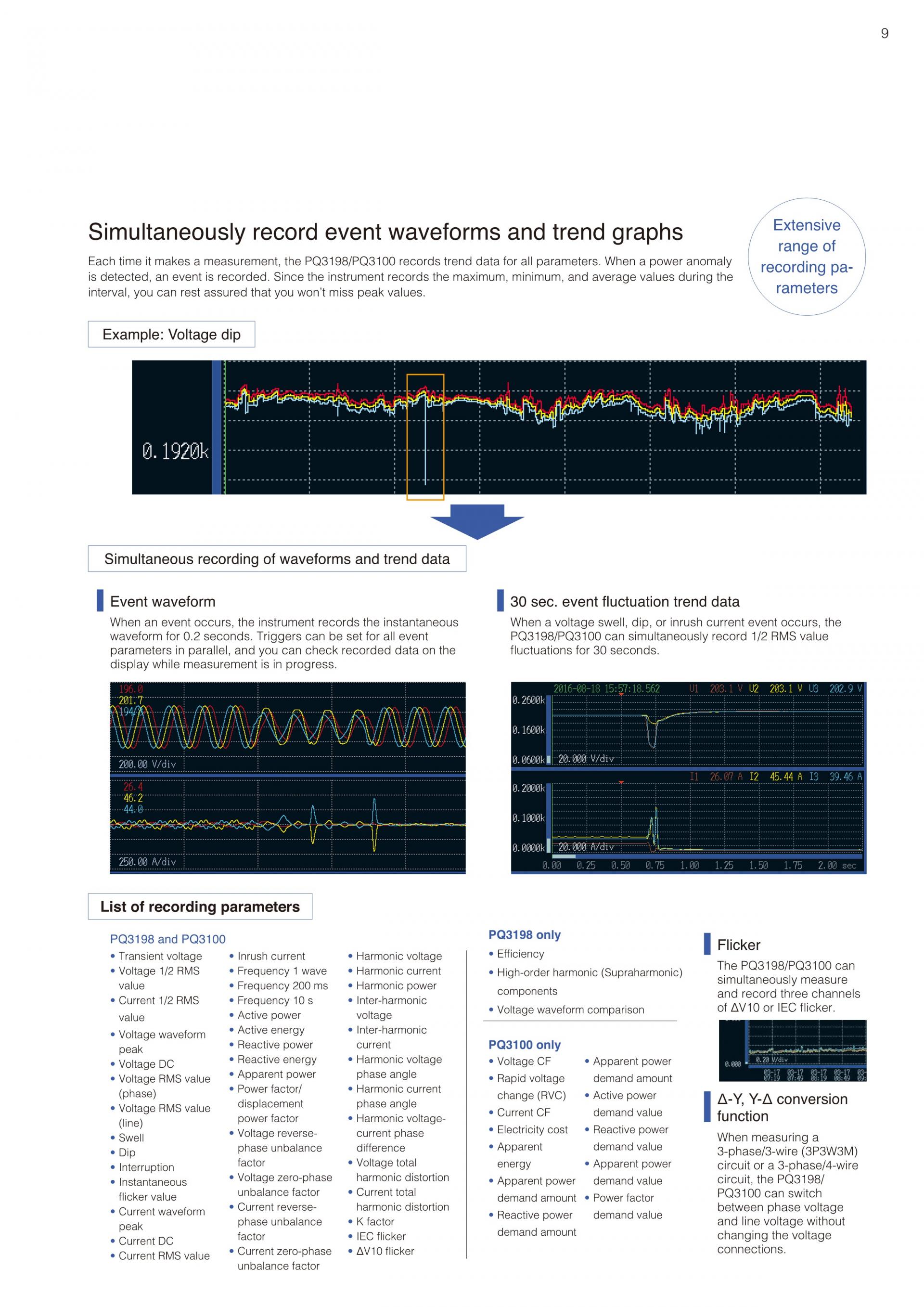 - 트렌드 기록과 동시에 순간정전, 전압 강하, 주파수 변동 등 모든 전원 이상을 포착