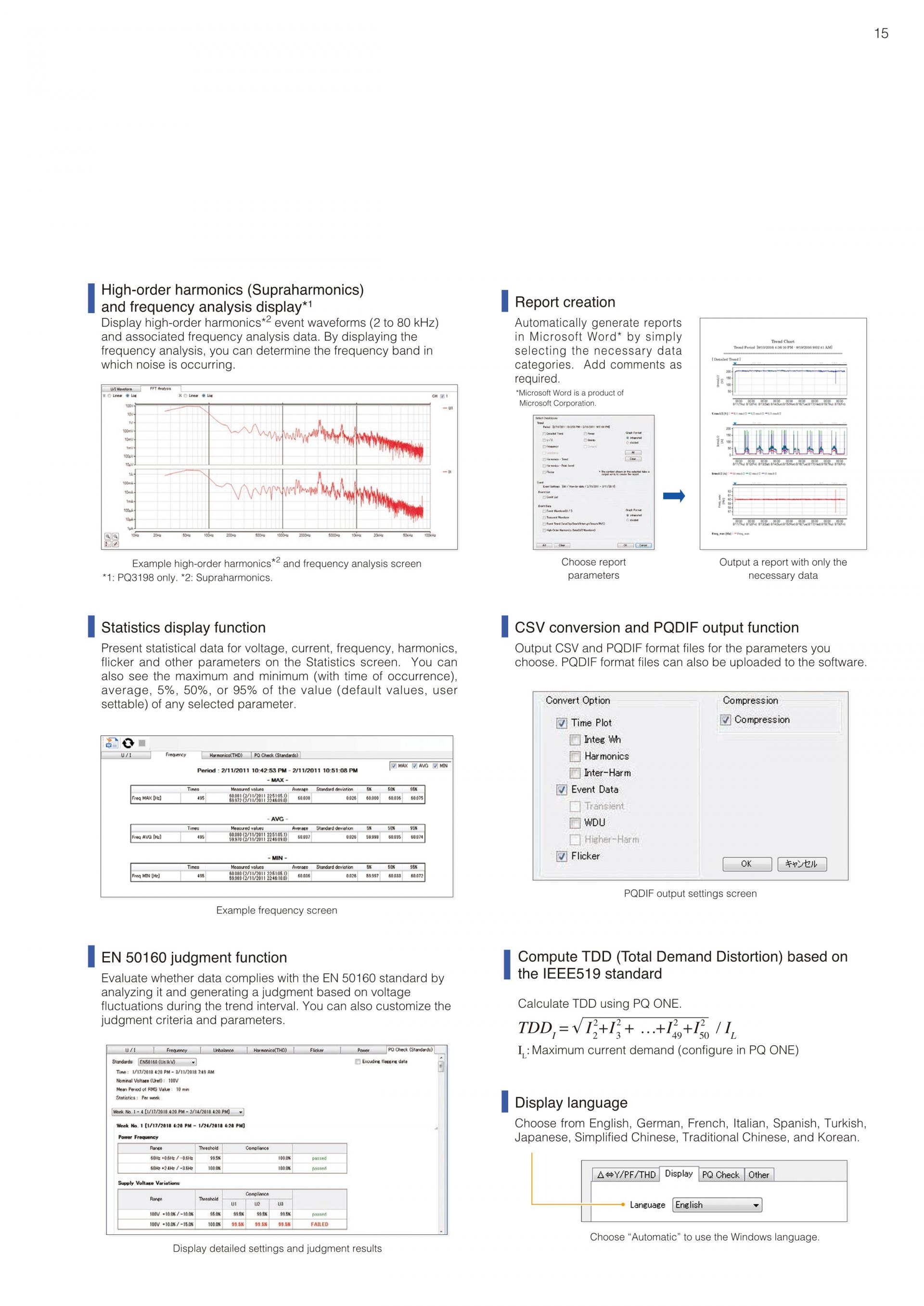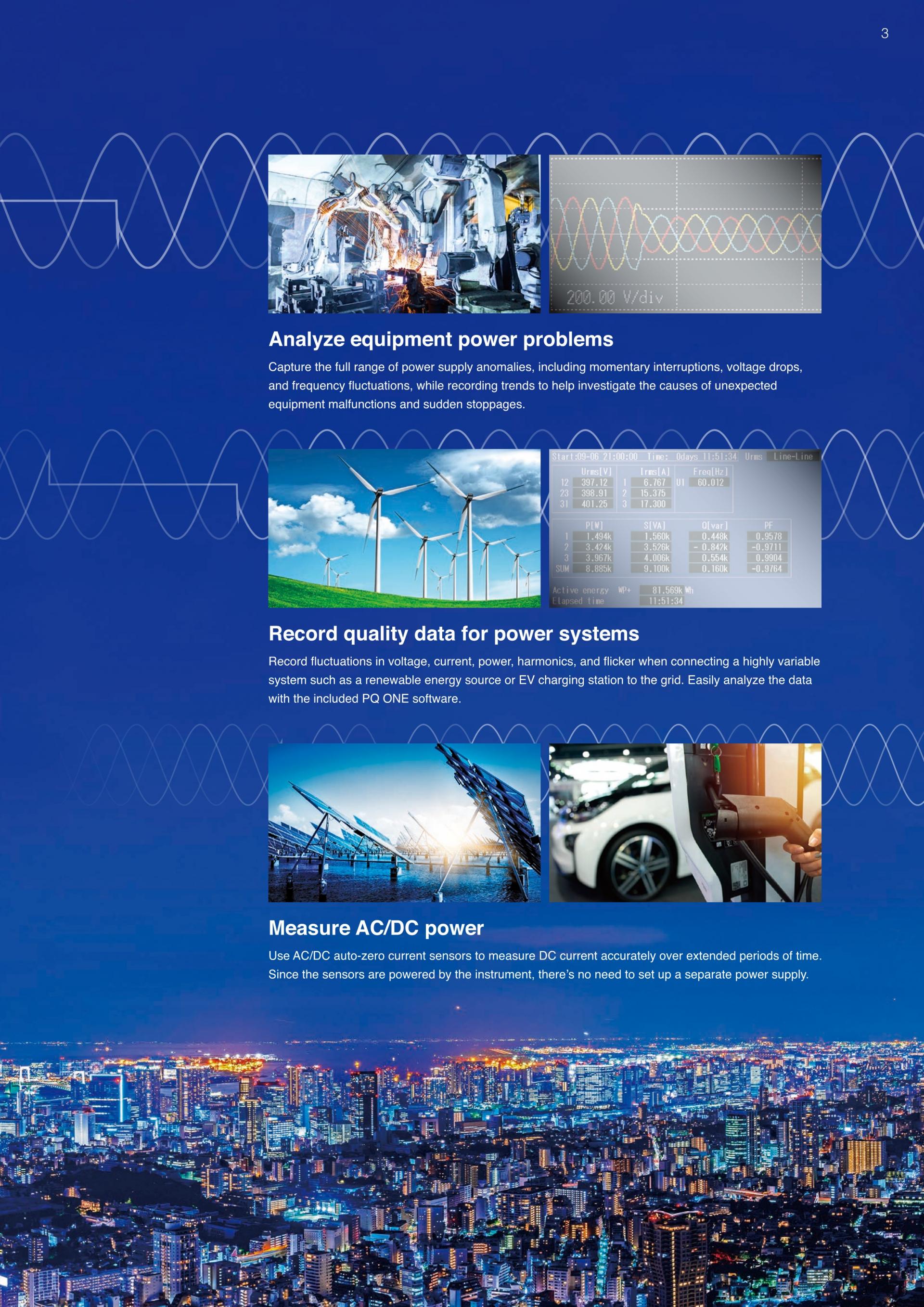 전원 품질 분석기의 사용방법 : 전력 계통의 전원 품질 기록전압, 전류, 전력, 고조파, 플리커 등 모두를 동시에 시계열로 측정. 트랜드 기록과 동시에 순시 정전, 전압 강하, 주파수 변동 등 모든 전원 이상을 포착합니다. |