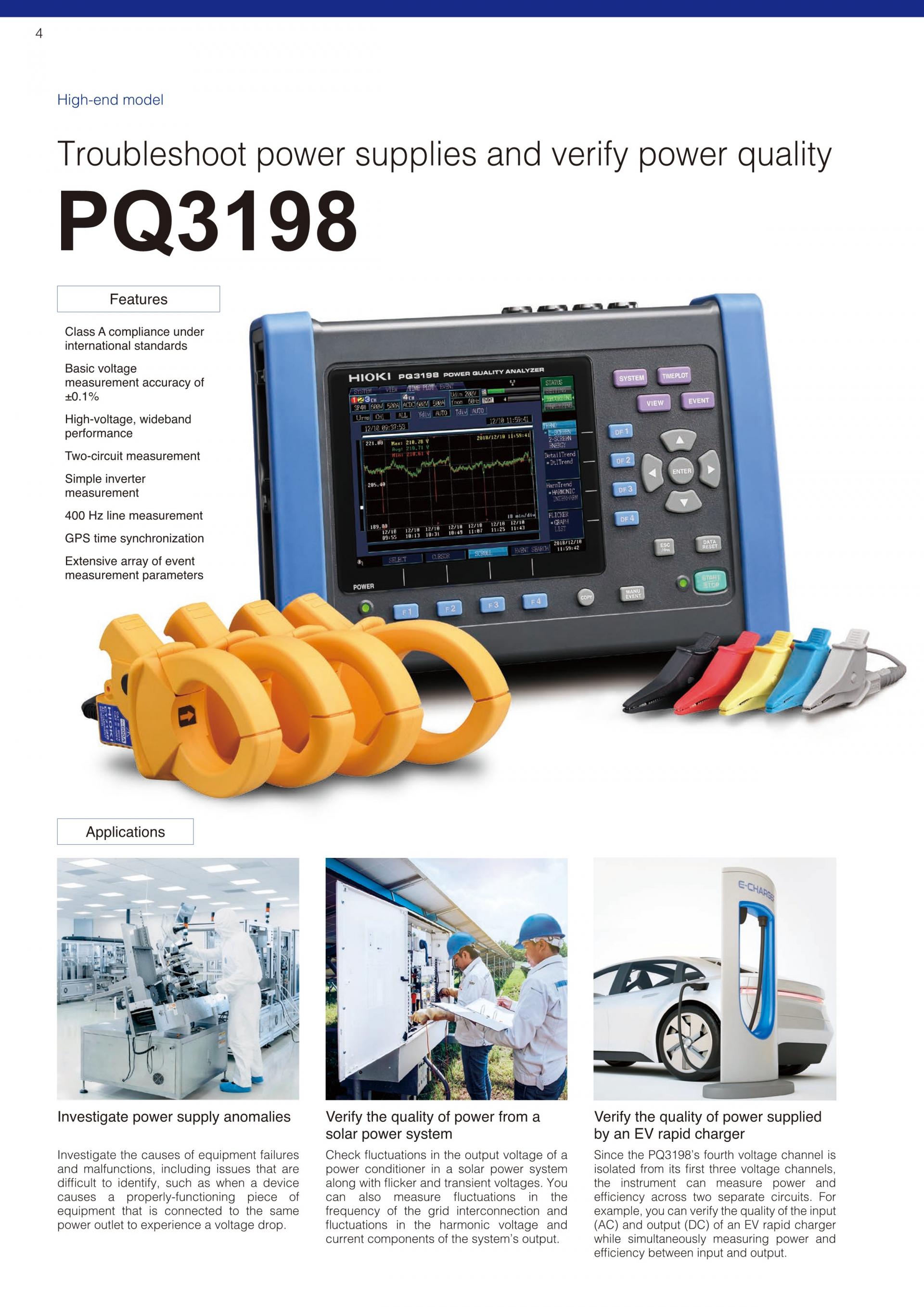 제품명 : 전원품질 아날라이저 세트 PQ3100-94형명(발주 코드) PQ3100-94 내용물 : AC 플렉시블 커런트 센서 CT7045 (6000A) × 4, PQ3100 본체, SD 메모리 카드 2GB Z4001, 휴대용 케이스 C1009 각 1 | ![]() |