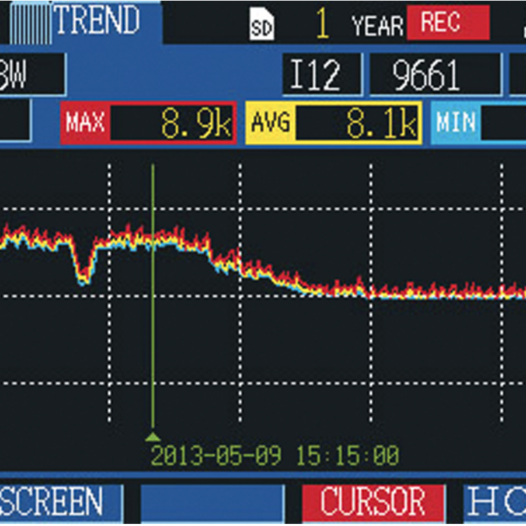 클램프 전력계의 측정값을 그래프로 표시, 한눈에 결과를 확인 가능측정값을 전력 관리에 편리한 그래프로 바꿔서 표시합니다. 그 순간의 측정값 뿐만 아니라 디맨드값의 추이 및 시계열 그래프 표시로 최대/최소/평균값을 커서로 확인할 수 있습니다. | ![]() |