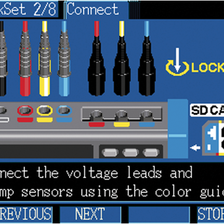 그래픽으로 클램프 전력계의 결선 순서를 알기 쉽게 안내설정 안내 기능으로 측정까지의 순서를 그래픽으로 안내하기 때문에 삼상 전력 측정도 간단히 설치 작업할 수 있습니다. 만약 결선 과정에 실수가 있어도 FAIL 표시로 알려주기 때문에 측정 오류를 방지할 수 있습니다. | ![]() |