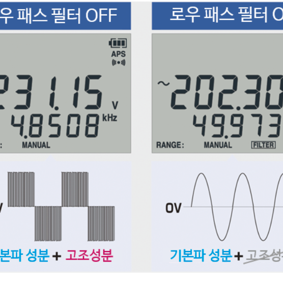 고조파 성분을 커트, 인버터 2차측 출력전압을 정확히 측정로우패스 필터 기능으로 고조파 성분을 차단, 기본파만을 정확하게 측정할 수 있습니다. | ![]() |