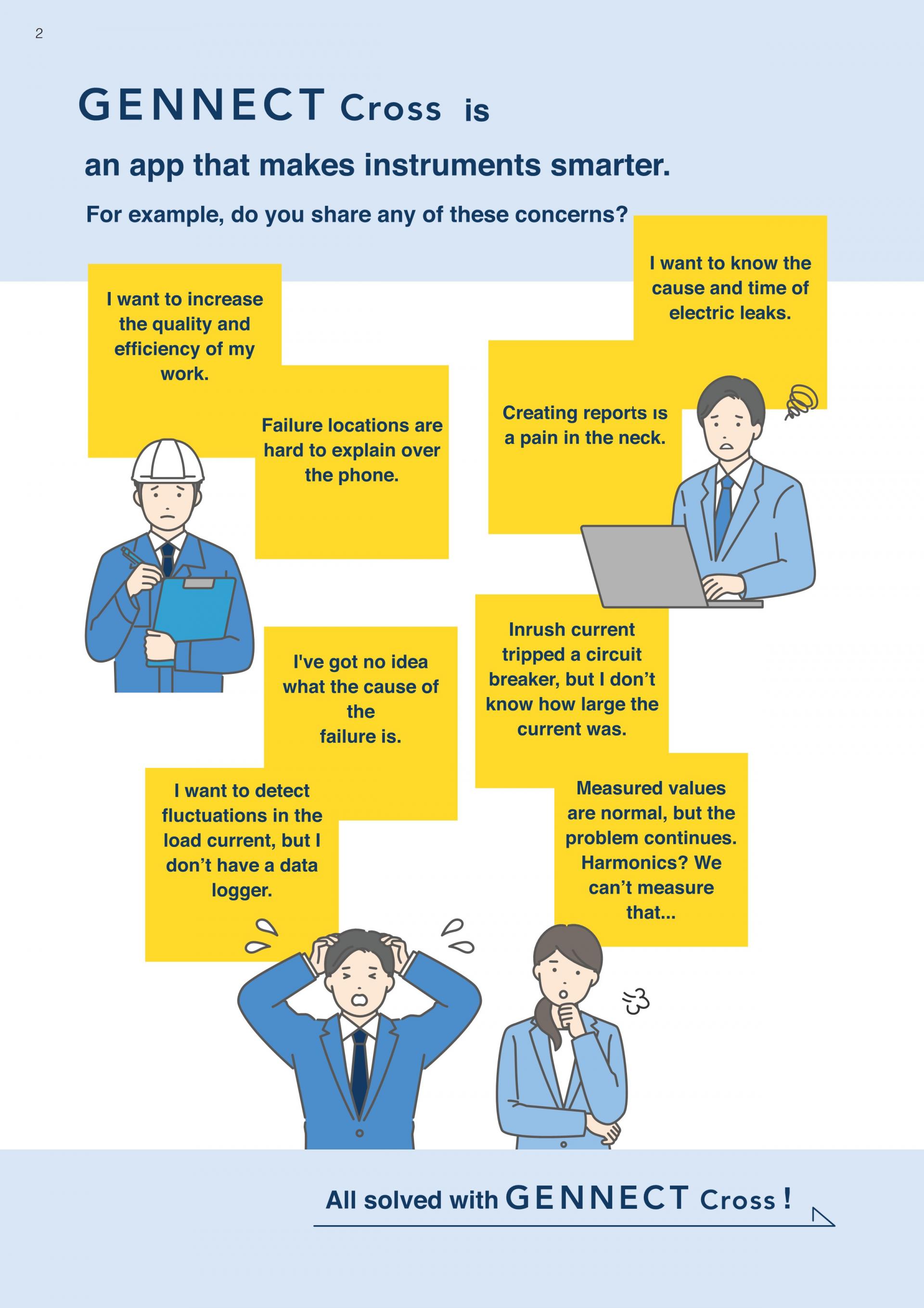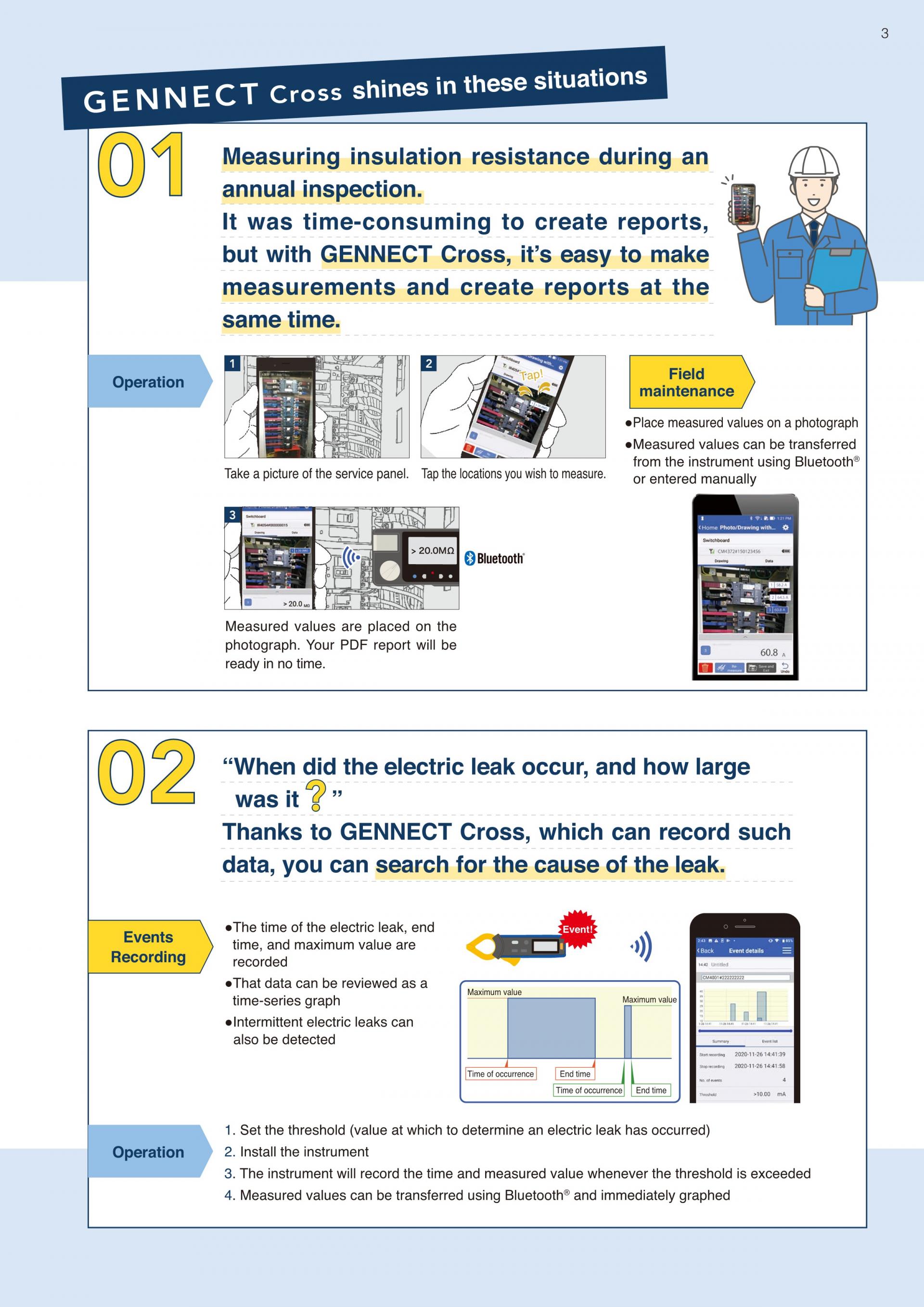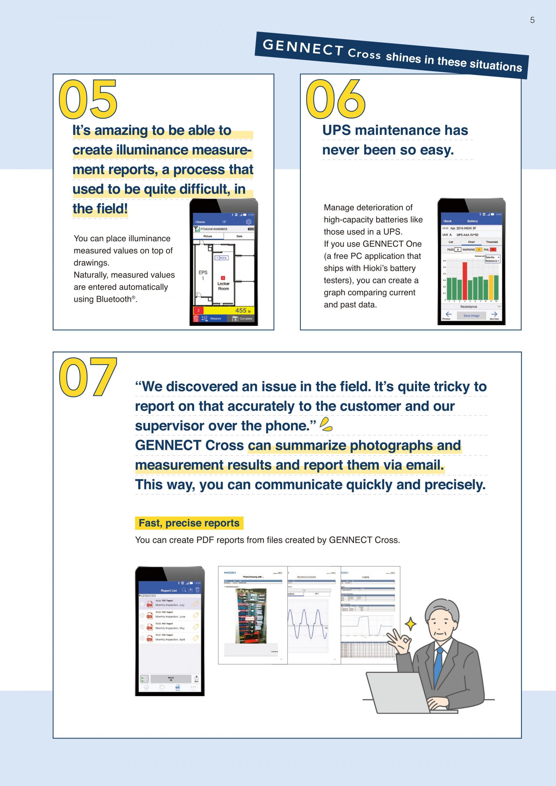 측정기와 연계가 가능한 기능 "현장 멘테넌스"조도계 FT3425와 GENNECT Cross의 조합으로 조도의 검사, 기록, 보고서 작성까지의 작업 시간을 대폭 단축할 수 있습니다. "다점 검사를 단시간에 끝내고 싶다" "방대한 기록 데이터를 간단하고 정확하게 보고서에 정리하고 싶다"는 요구에 대응합니다. |