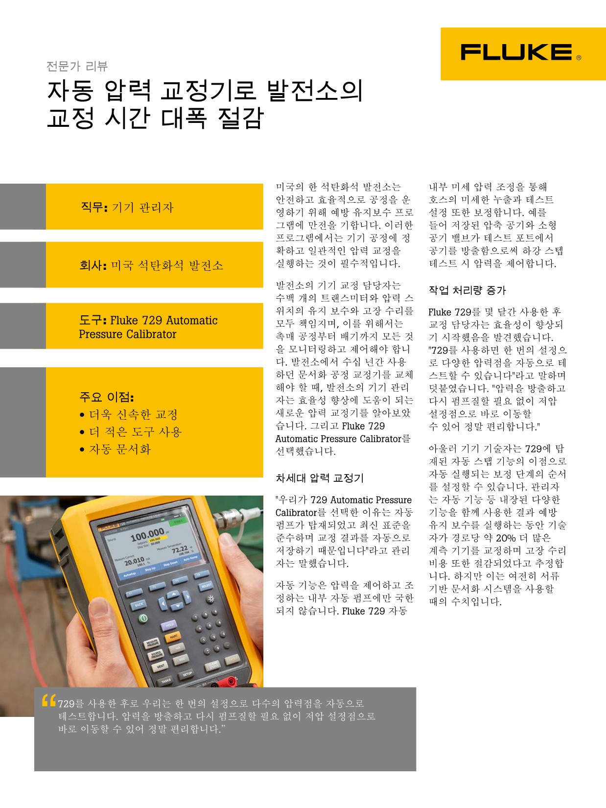 Fluke 729 자동 압력 교정기