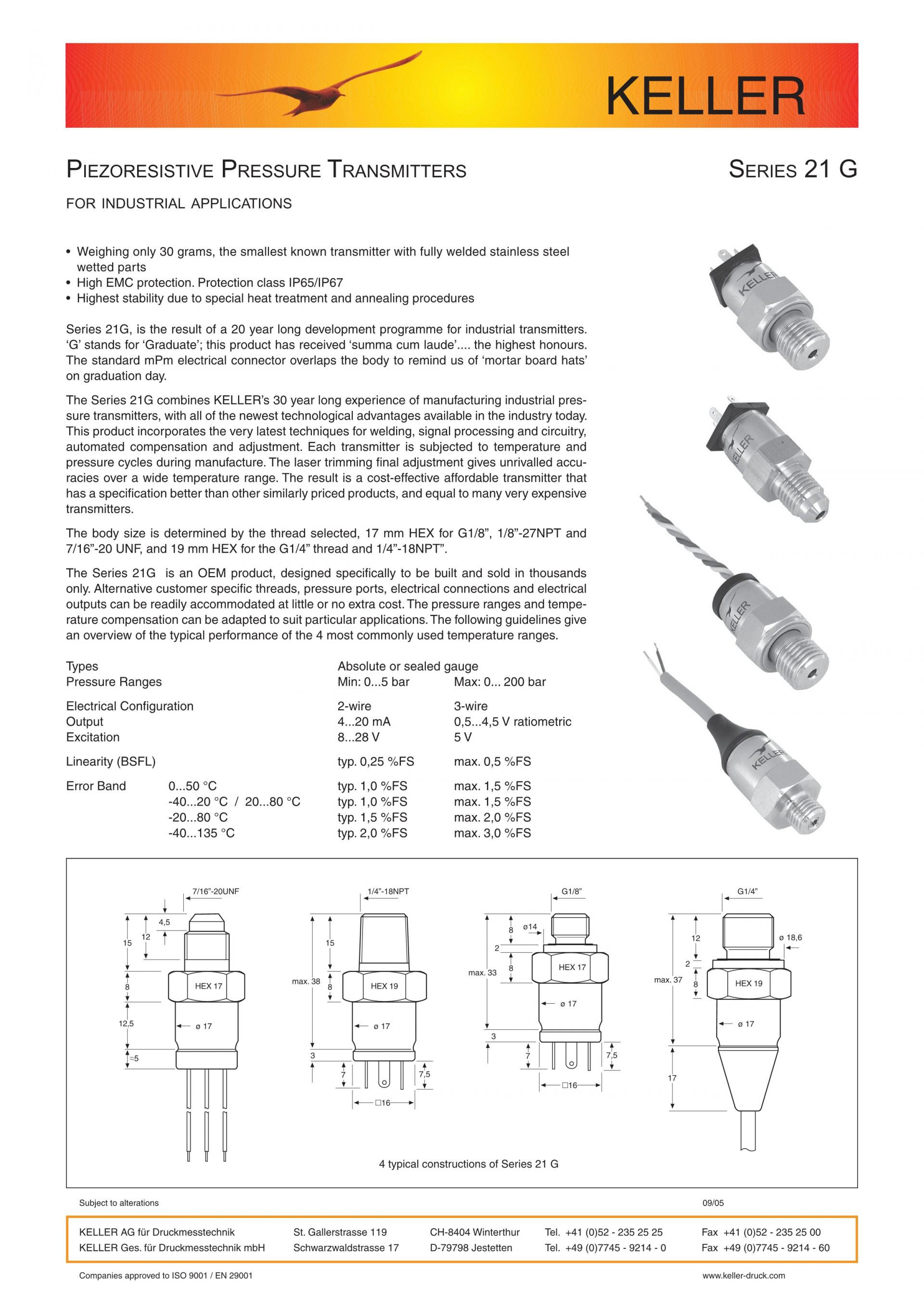 21G PIEZORESISTIVE PRESSURE TRANSMITTERS FOR INDUSTRIAL APPLICATIONS
