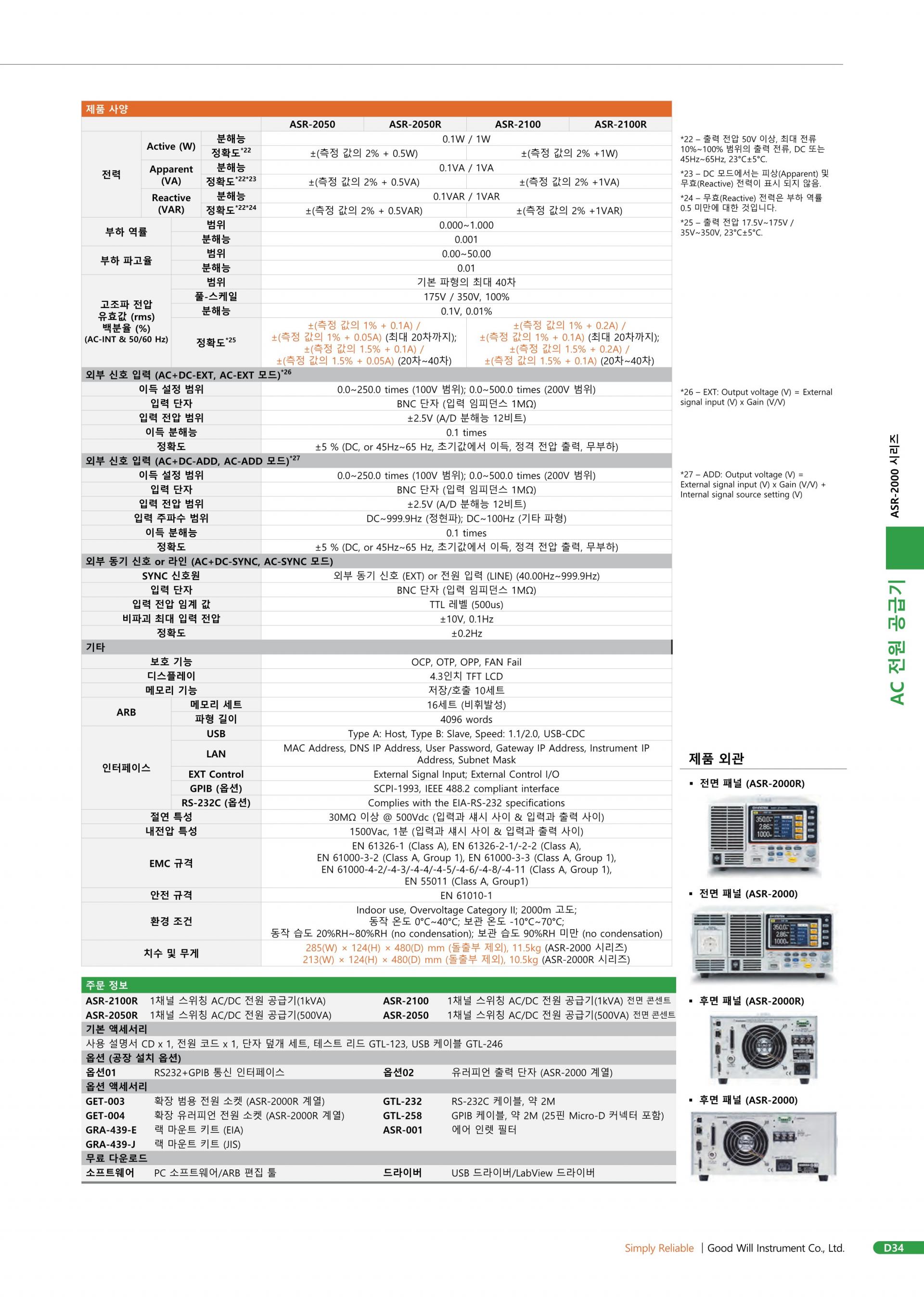 - 출력 전력 : 500VA(ASR-2050)/1kVA(ASR-2100)