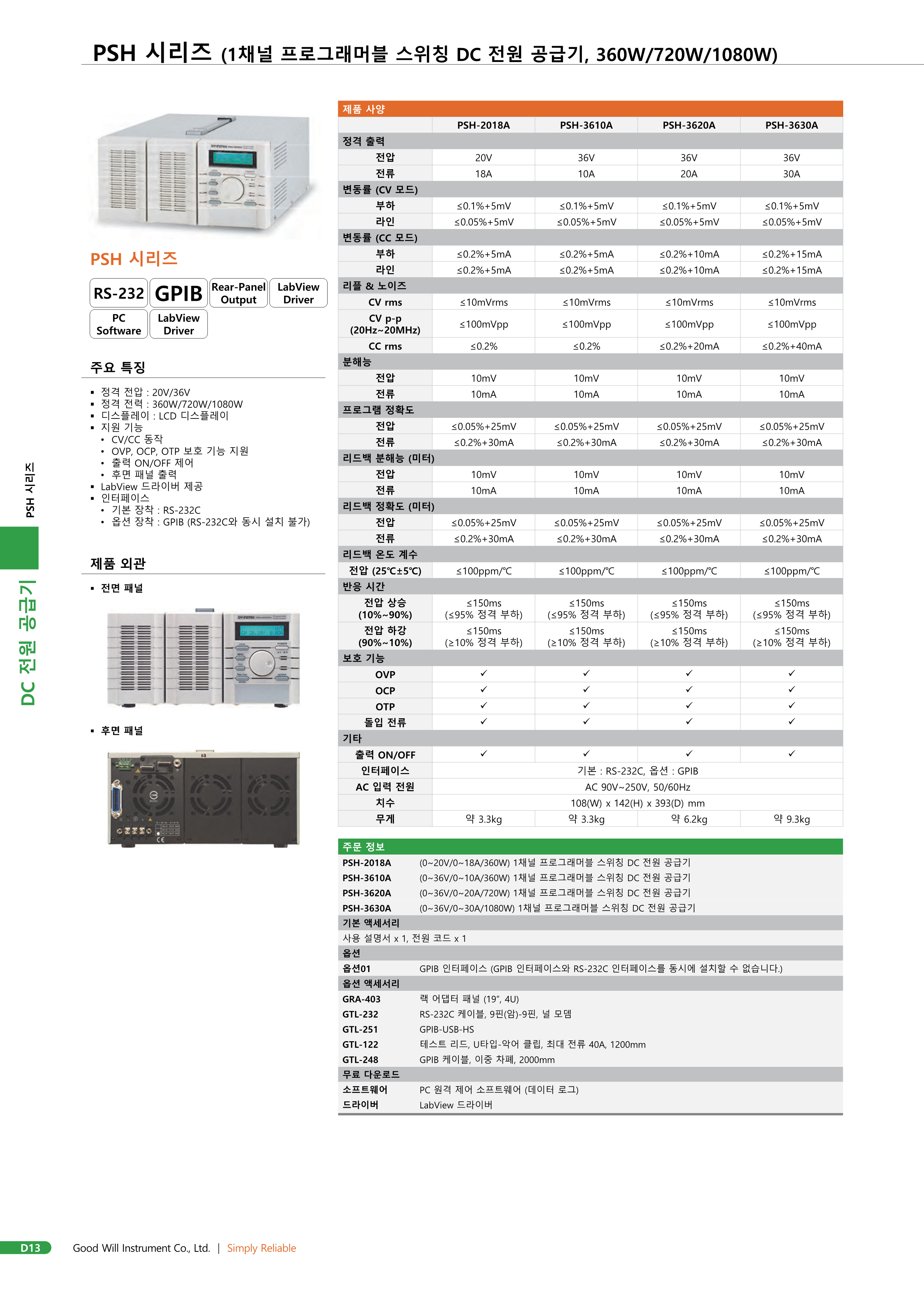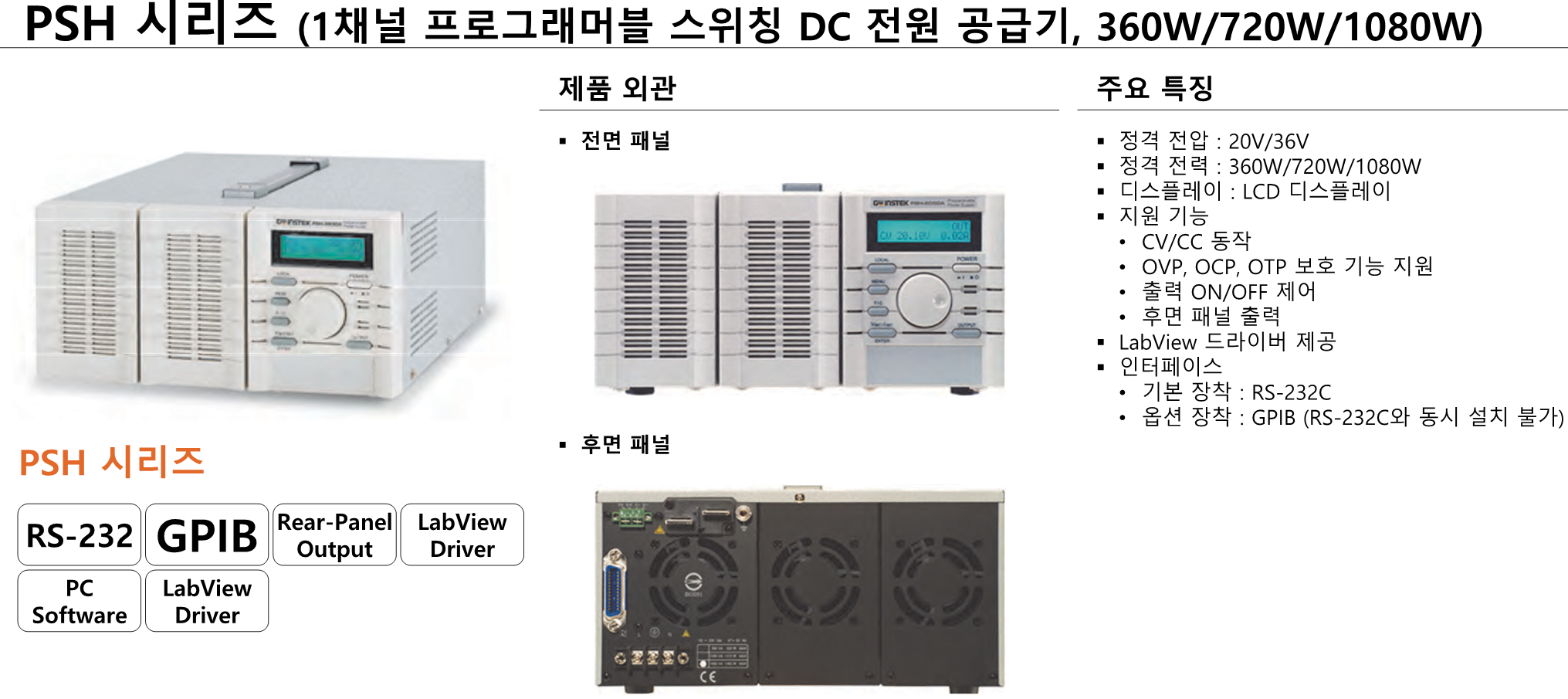 PSH 시리즈는 360W ~ 1080W의 단일 출력, 프로그래밍 가능한 스위칭 DC 전원 공급 장치입니다. OVP, OCP 및 OTP는 전원 공급 장치와 부하를 예기치 않은 조건으로부터 보호합니다. 원격 감지는 부하 간의 케이블 손실을 보상하여 정밀도를 한 차원 더 높입니다. 동시 매개변수 출력이 있는 밝은 LCD로 손쉬운 작동이 가능합니다. 자체 테스트 및 소프트웨어 보정 기능도 유지 관리 노력을 줄여줍니다. RS-232C 또는 옵션인 GPIB 인터페이스를 통한 SCPI 명령 및 LabVIEW 드라이버 액세스를 통해 원격 제어 및 ATE 소프트웨어 개발이 가능합니다. 모듈식 아키텍처, 전용 후면 패널 출력 및 19인치 4U 랙 마운팅 옵션은 PSH 시리즈가 대형 시스템에 최적화되도록 합니다.