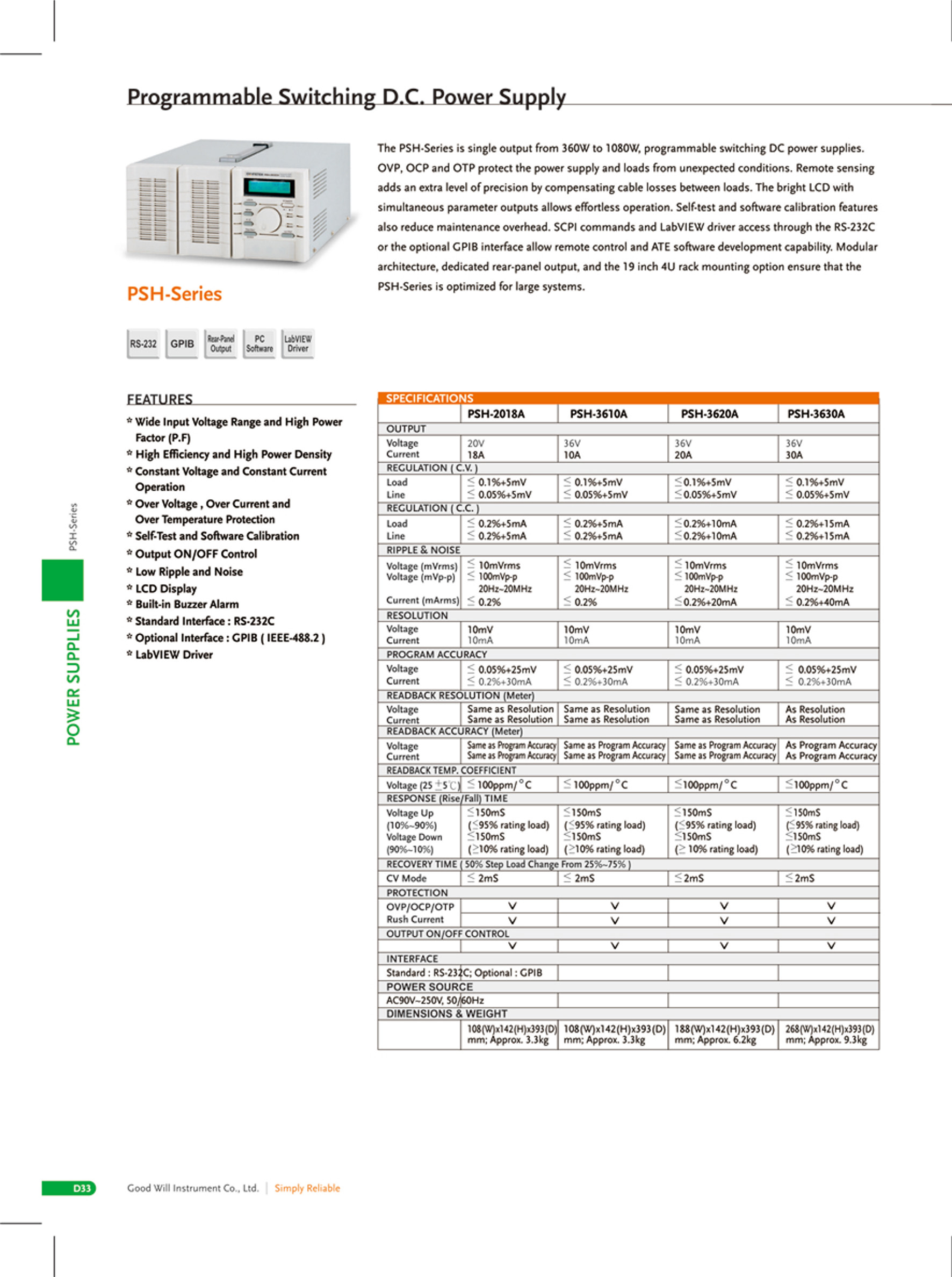 PSH-3630A | 1080W | 0~36V | 0~30A | 9.3kg |