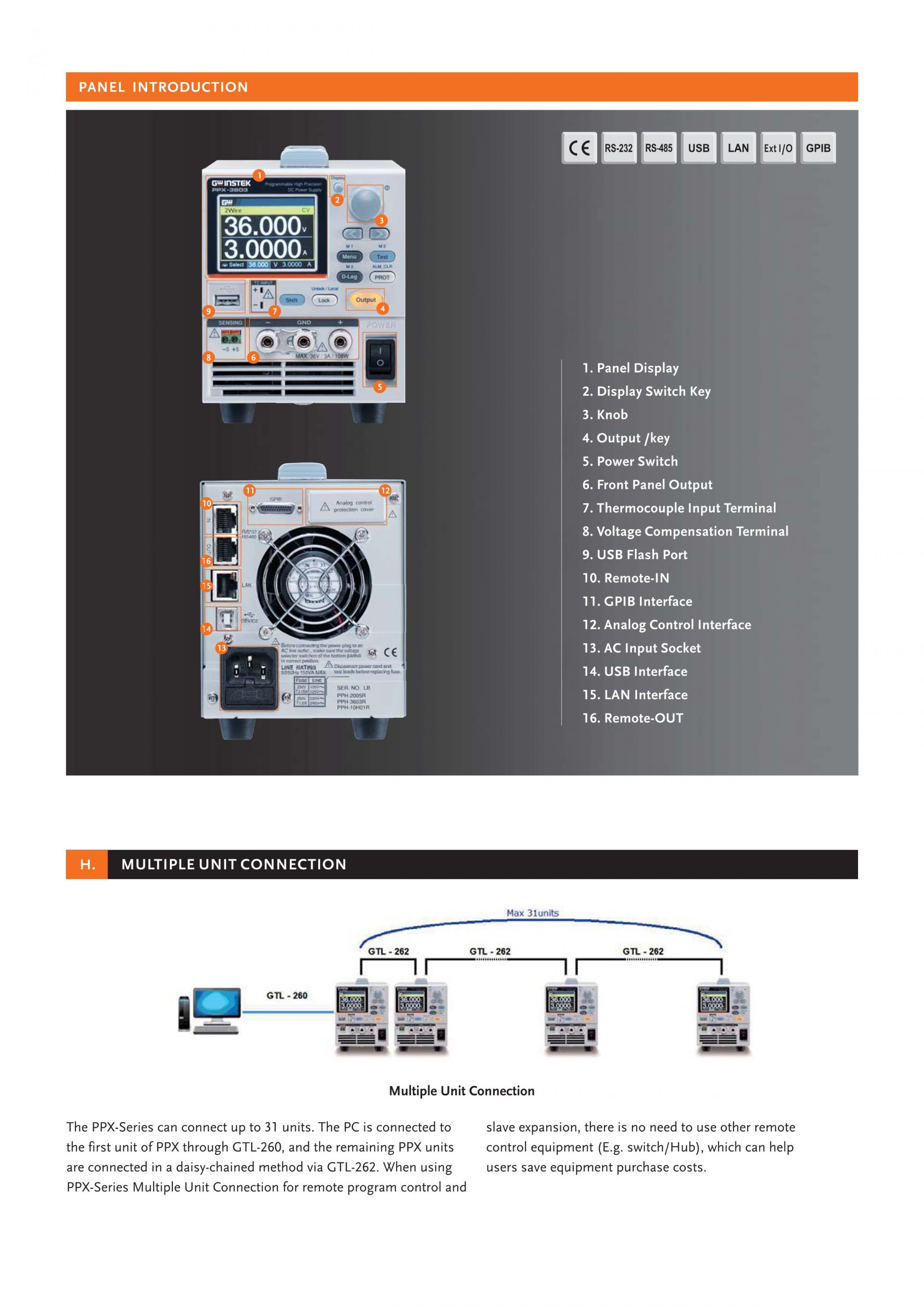 - Interfaces: USB, LAN, RS-232, RS-485, Analog Control; Opt: GPIB
