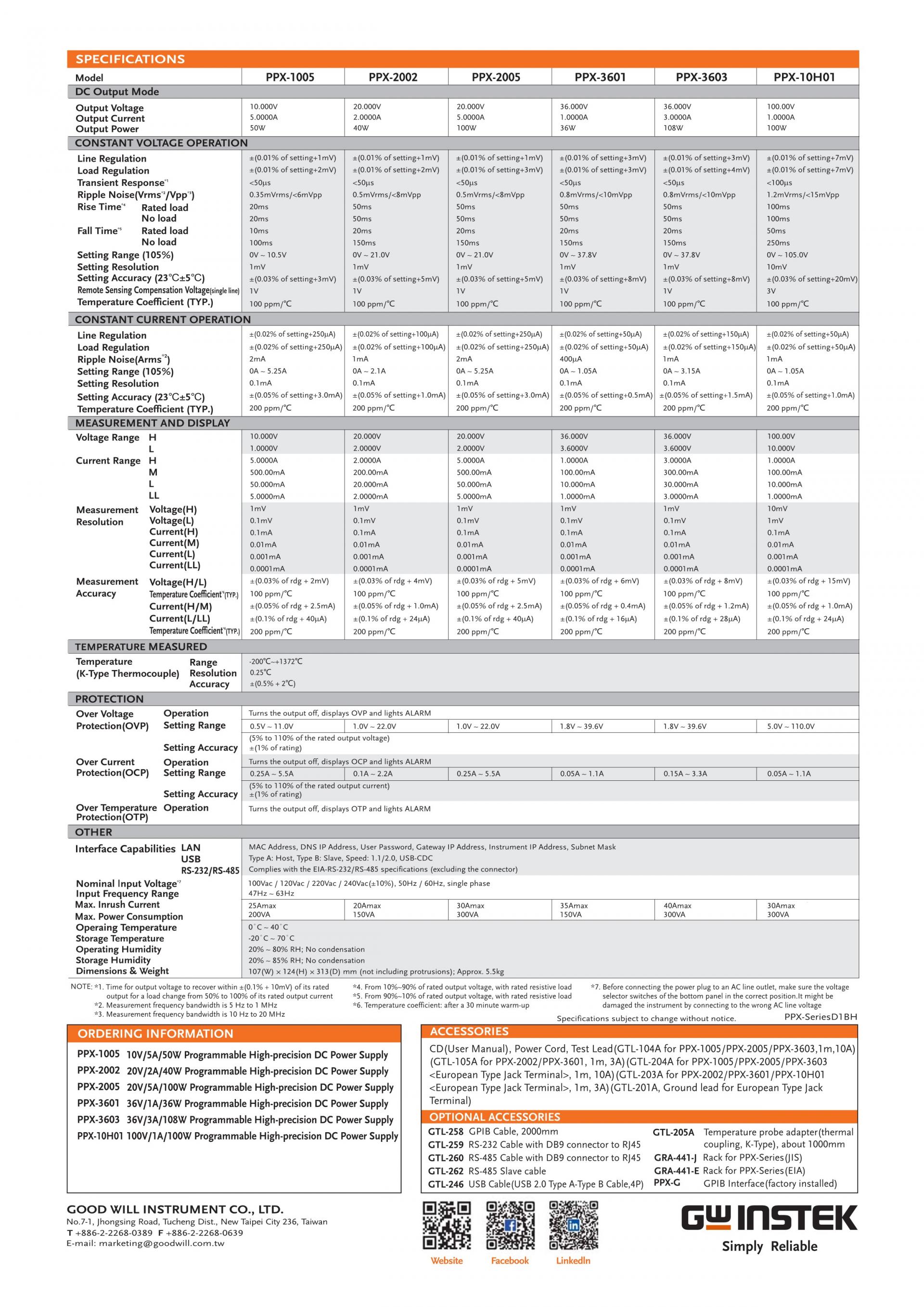 The PPX series programmable high-precision DC power supplies include six models; PPX- 1005(10V/5A/50W), PPX-2002(20V/2A/40W), PPX-2005(20V/5A/100W) ), PPX- 3601(36V/1A/36W), PPX-3603(36V/3A/108W), and PPX-10H01(100V/1A/100W). This series has the output low noise (0.35mVrms) and fast transient response characteristics (<50μs) of conventional linear power supplies.