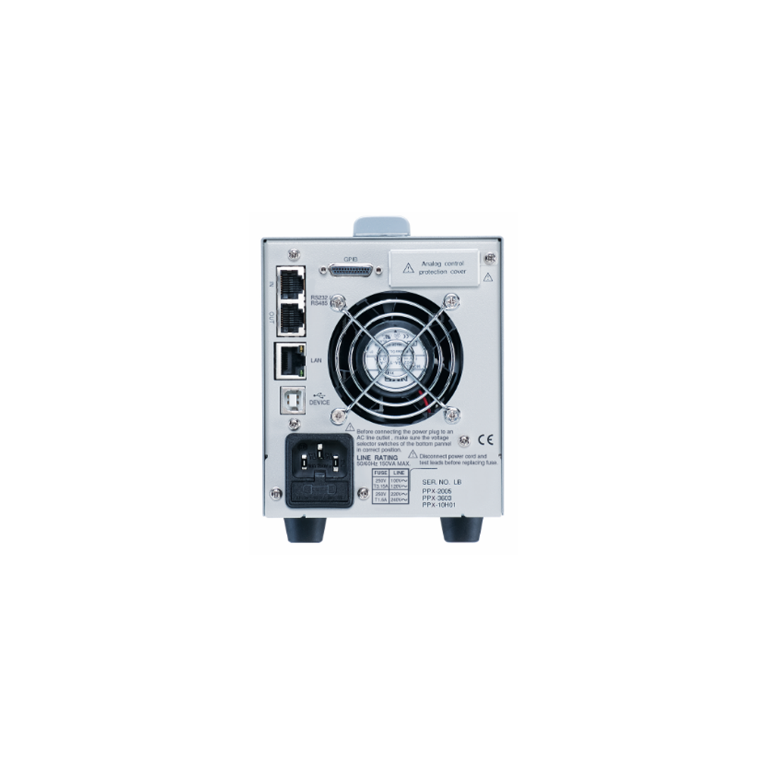 The PPX series programmable high-precision DC power supplies include six models; PPX- 1005(10V/5A/50W), PPX-2002(20V/2A/40W), PPX-2005(20V/5A/100W) ), PPX- 3601(36V/1A/36W), PPX-3603(36V/3A/108W), and PPX-10H01(100V/1A/100W). This series has the output low noise (0.35mVrms) and fast transient response characteristics (<50μs) of conventional linear power supplies.