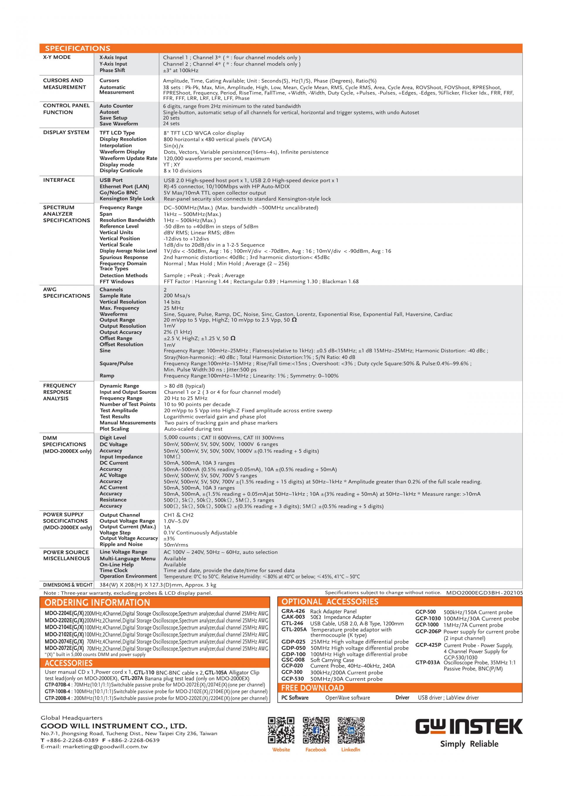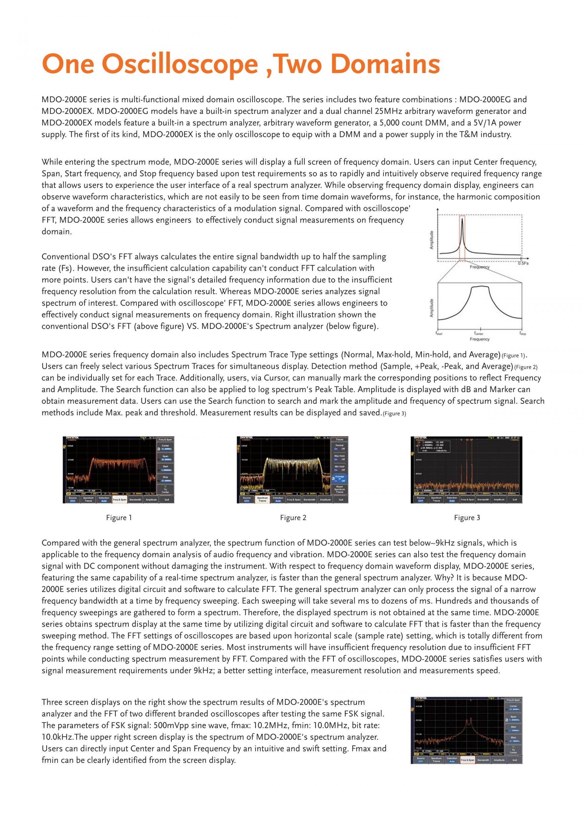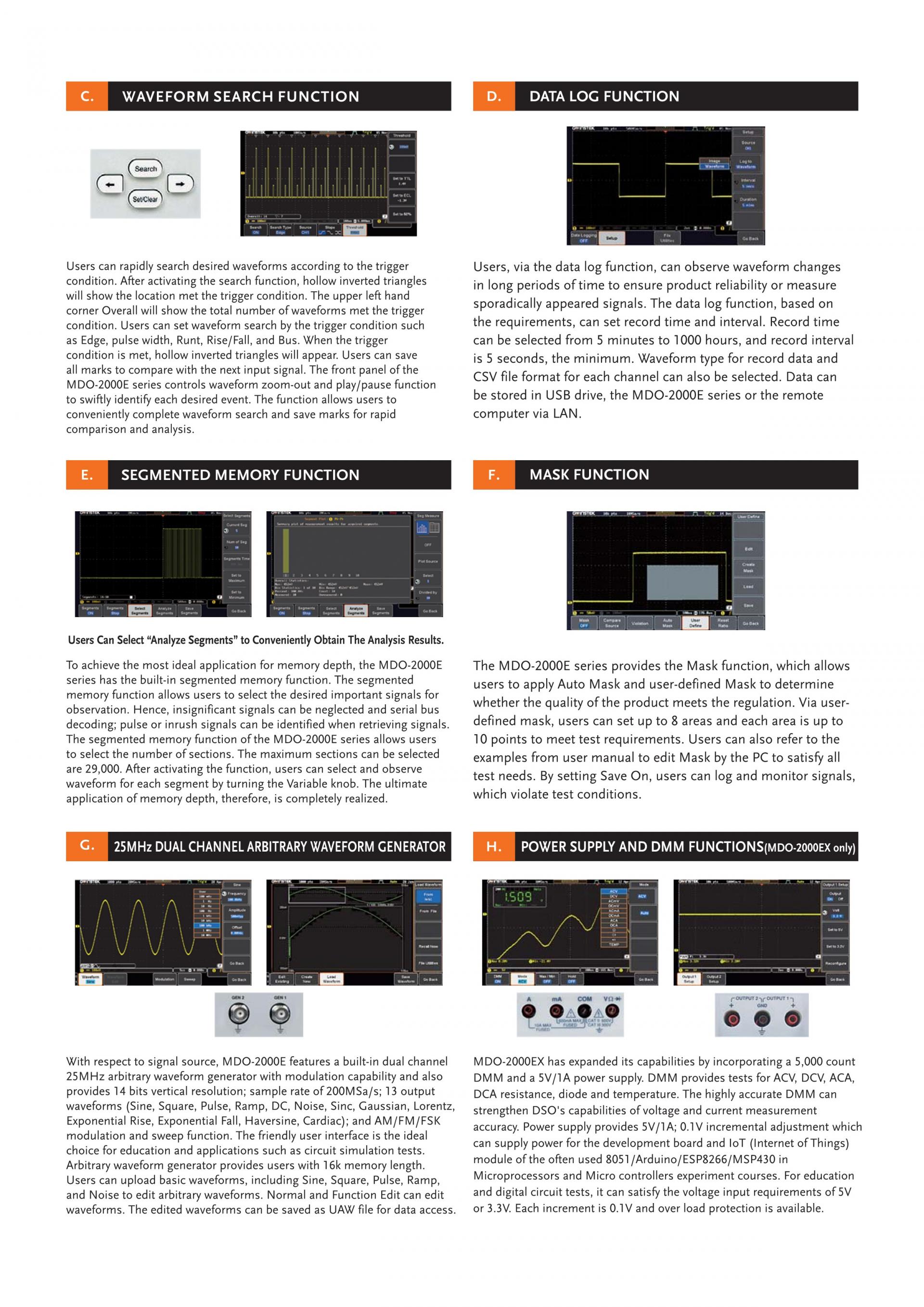 MDO-2000E series is multi-functional mixed domain oscilloscope. The series includes two feature combinations : MDO-2000EG and MDO-2000EX. MDO-2000EG models have a built-in spectrum analyzer and a dual channel 25MHz arbitrary waveform generator and MDO-2000EX models feature a built-in a spectrum analyzer, arbitrary waveform generator, a 5,000 count DMM, and a 5V/1A power supply. The first of its kind, MDO-2000EX is the only oscilloscope to equip with a DMM and a power supply in the T&M industry.