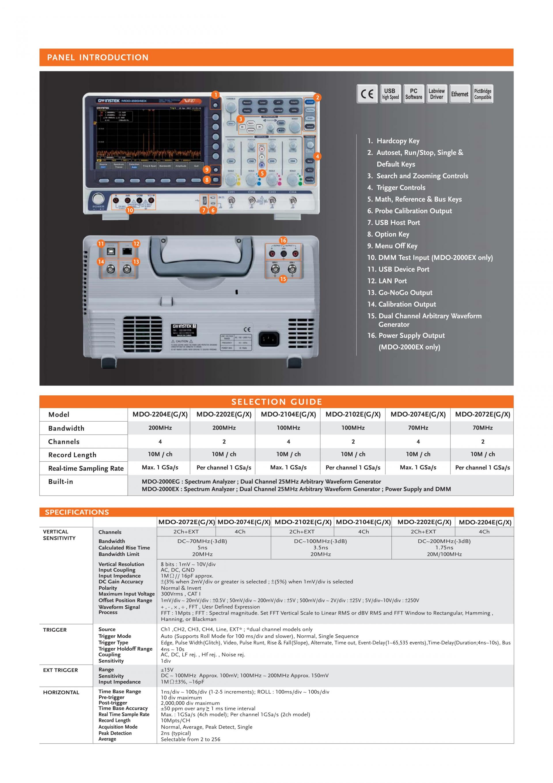 - MDO-2000EG equips with a spectrum analyzer and a dual channel 25MHz AWG MDO-2000EX equips with a spectrum analyzer ; a dual channel 25MHz AWG; DMM and power supply.