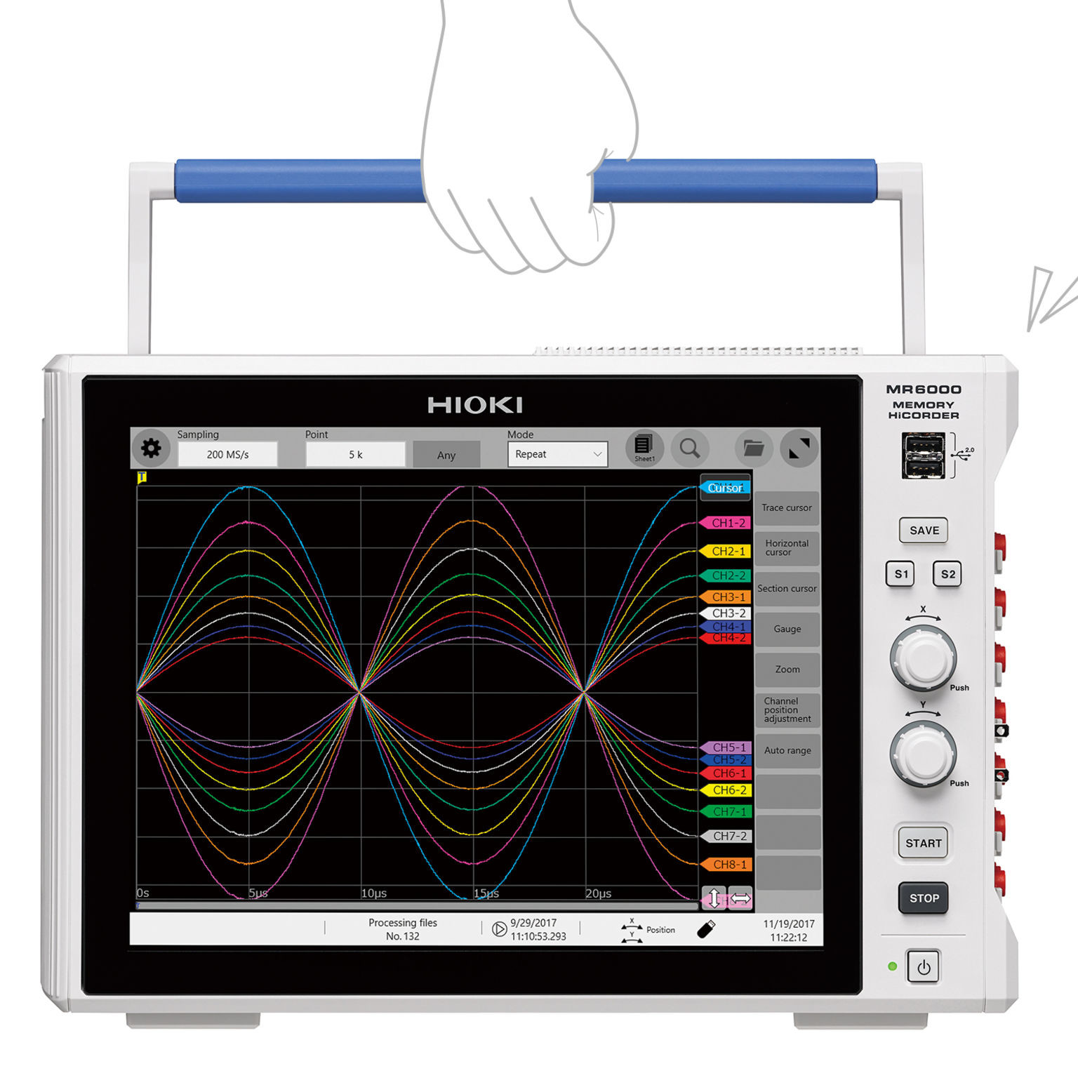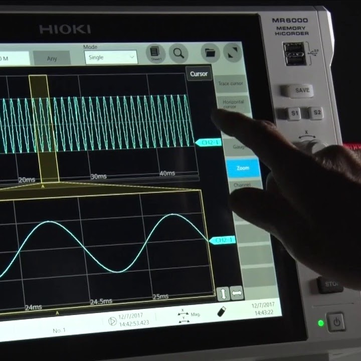12.1인치 정전 용량식 터치 패널을 채택. 미끄러지듯 부드럽고 직감적인 조작을 실현했습니다. 방대한 측정 데이터 중 보고싶은 파형을 간단하게 검색할 수 있는 ‘파형 검색 기능’을 탑재. 측정한 모든 데이터 중에서 이상 파형을 자동 검색합니다.