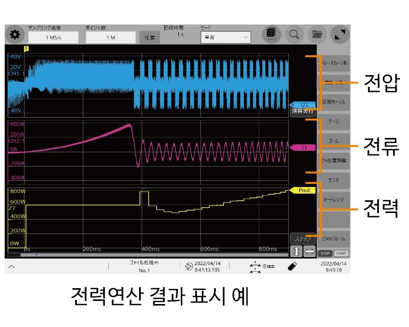 전압 ・ 전류 ・ 전력을 트렌드 표시 전력연산 설정 후에 전압과 전류를 측정하면 파형연산이 자동 실행되어 전력을 표시합니다. 또한 측정 후에라도 전력연산 설정을 실행하면 연산결과를 표시합니다.