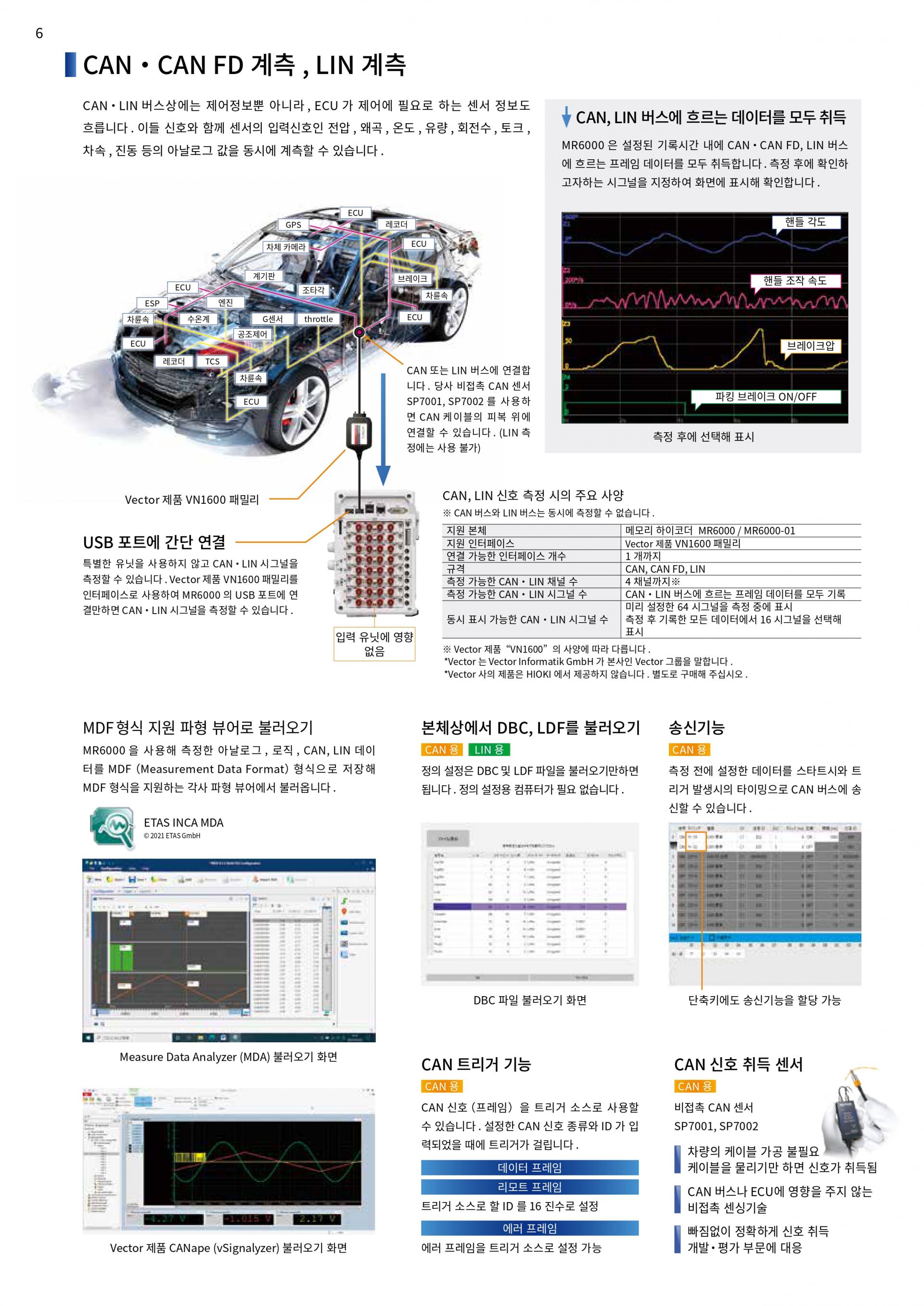 CAN · LIN 버스상에는 제어정보뿐 아니라, ECU 가 제어에 필요로 하는 센서 정보도 흐릅니다. 이들 신호와 함께 센서의 입력신호인 전압 · 왜곡 온도 · 유량 · 회전수 · 토크 · 차속 · 진동 등의 아날로그 값을 동시에 계측할 수 있습니다.