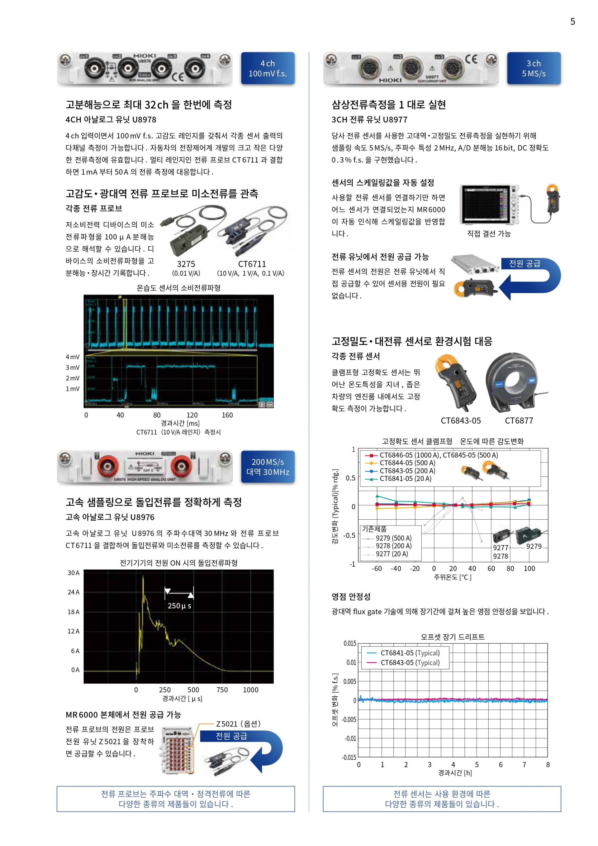 전류 센서 클램프형 고정확도 센서는 뛰어난 온도특성을 지녀, 좁은 차량의 엔진룸 내에서도 고정확도 측정이 가능합니다. 3CH 전류 유닛 U8977을 사용하면 전류 센서를 직접 연결할 수 있고, MR6000 본체에서 전원 공급과 스케일링을 자동으로 수행할 수 있습니다.