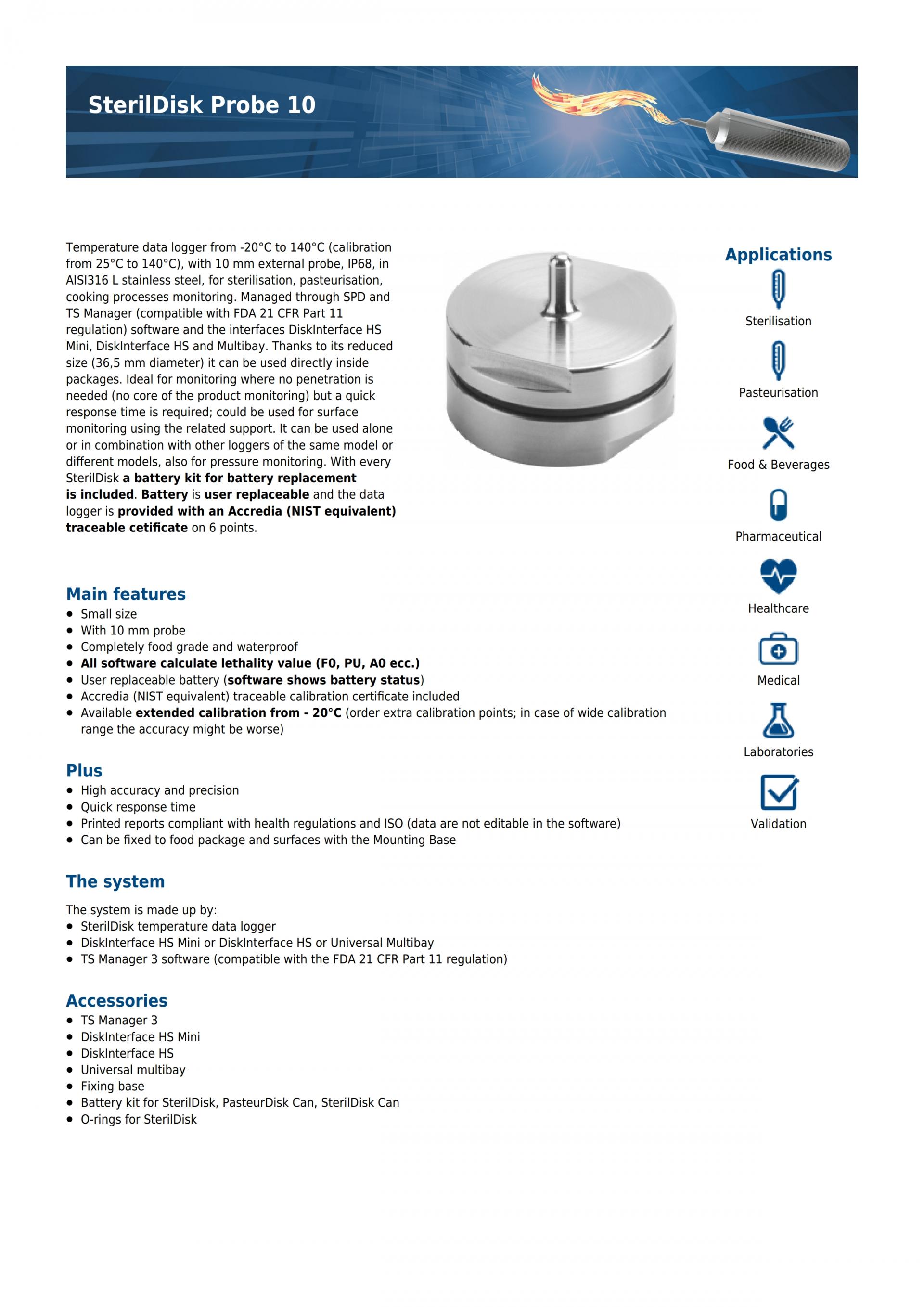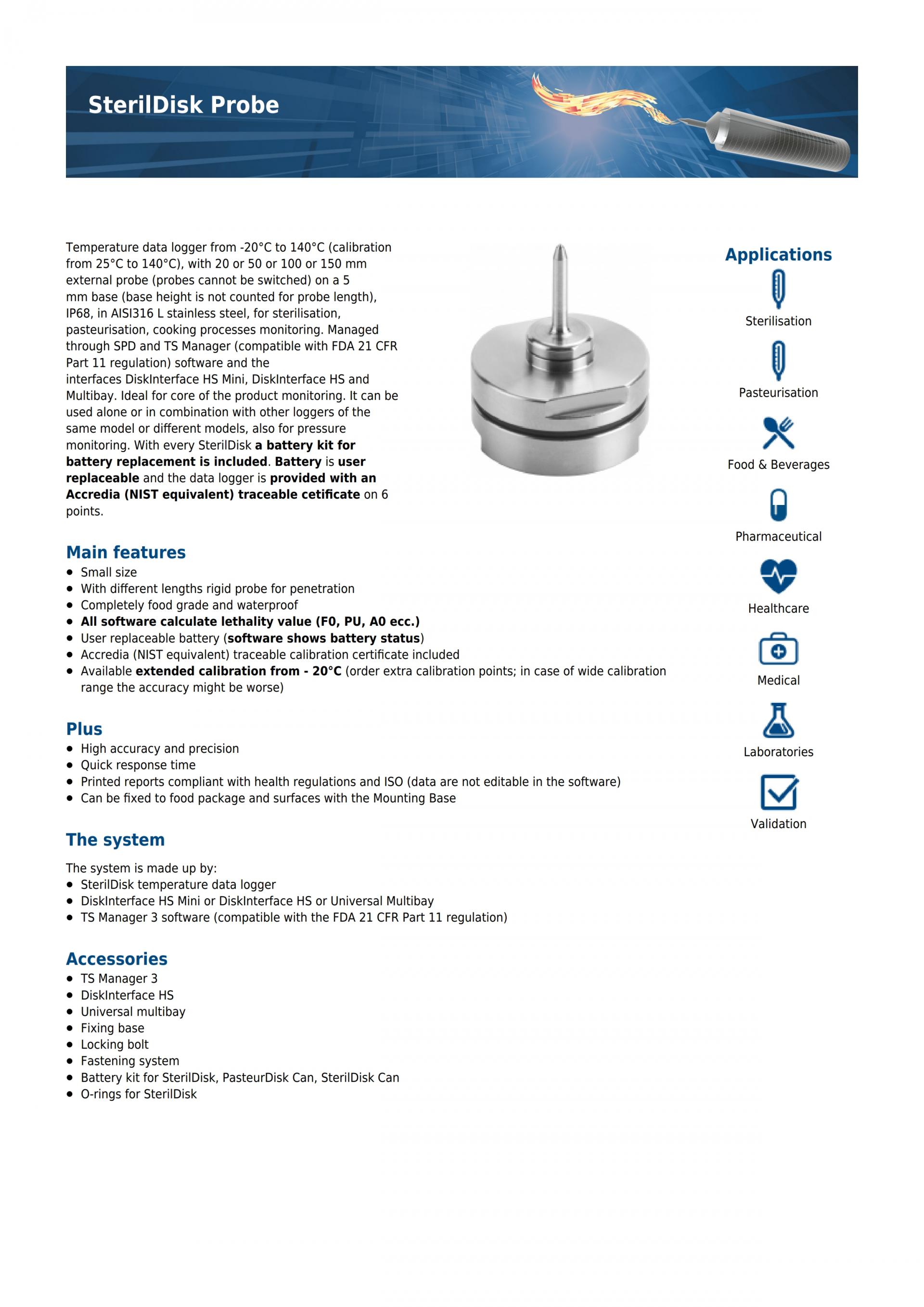 - Sterildisk Probe : 20/50/100/150mm의 다양한 온도프로브의 무선데이터로거
