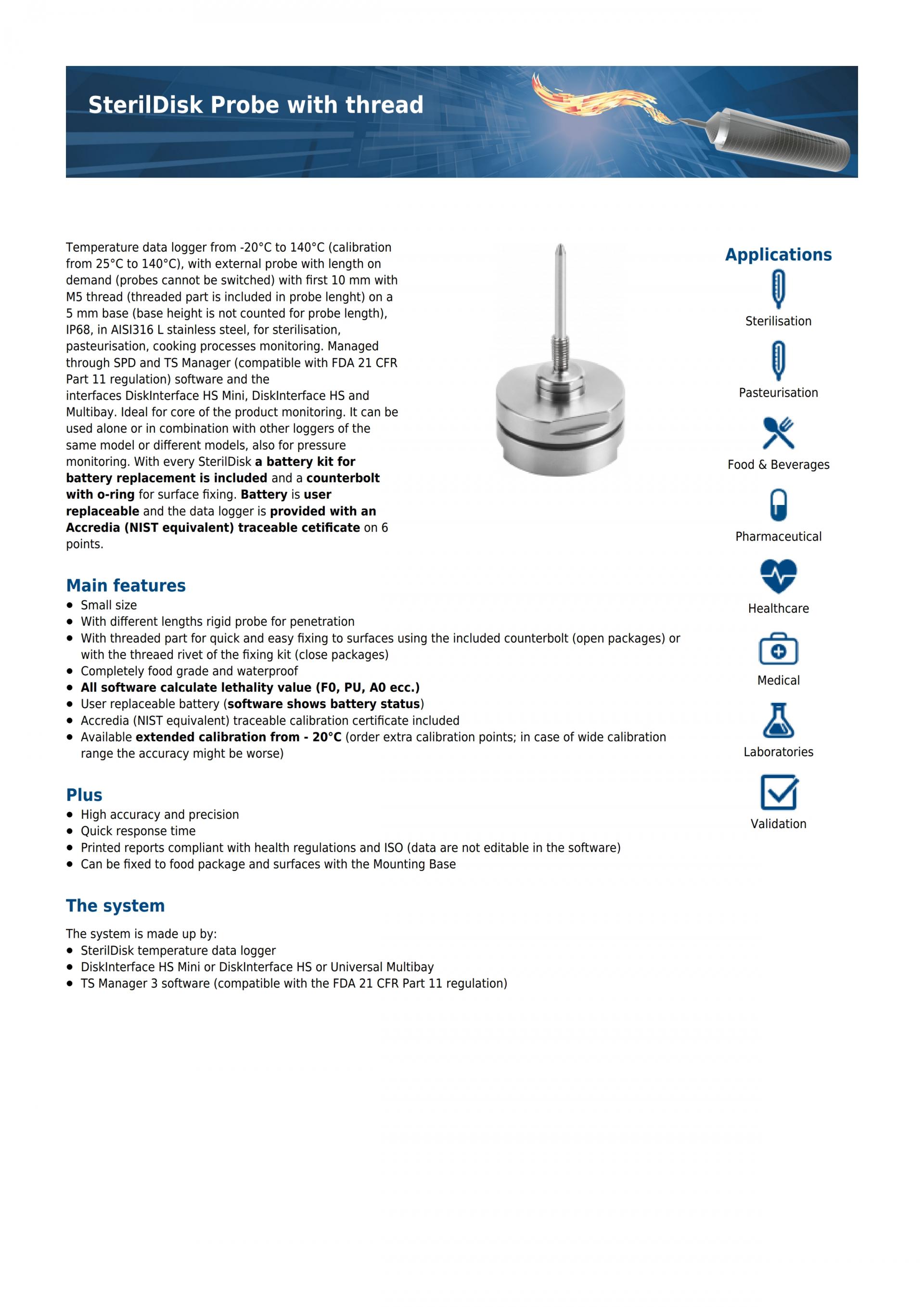 - Sterildisk Probe with Thread : 다양한 프로브와 나사선의 무선데이터로거