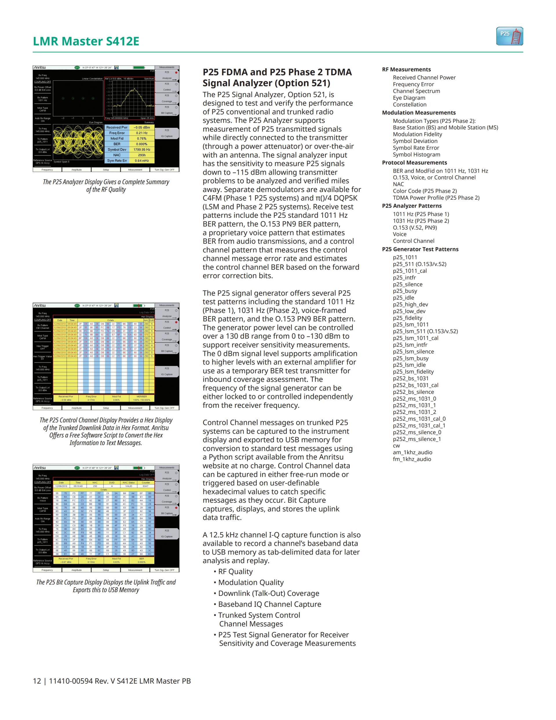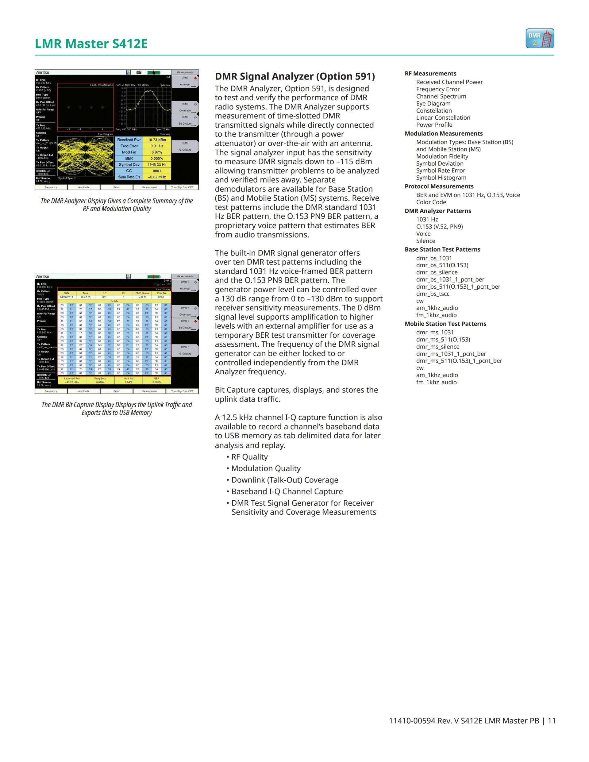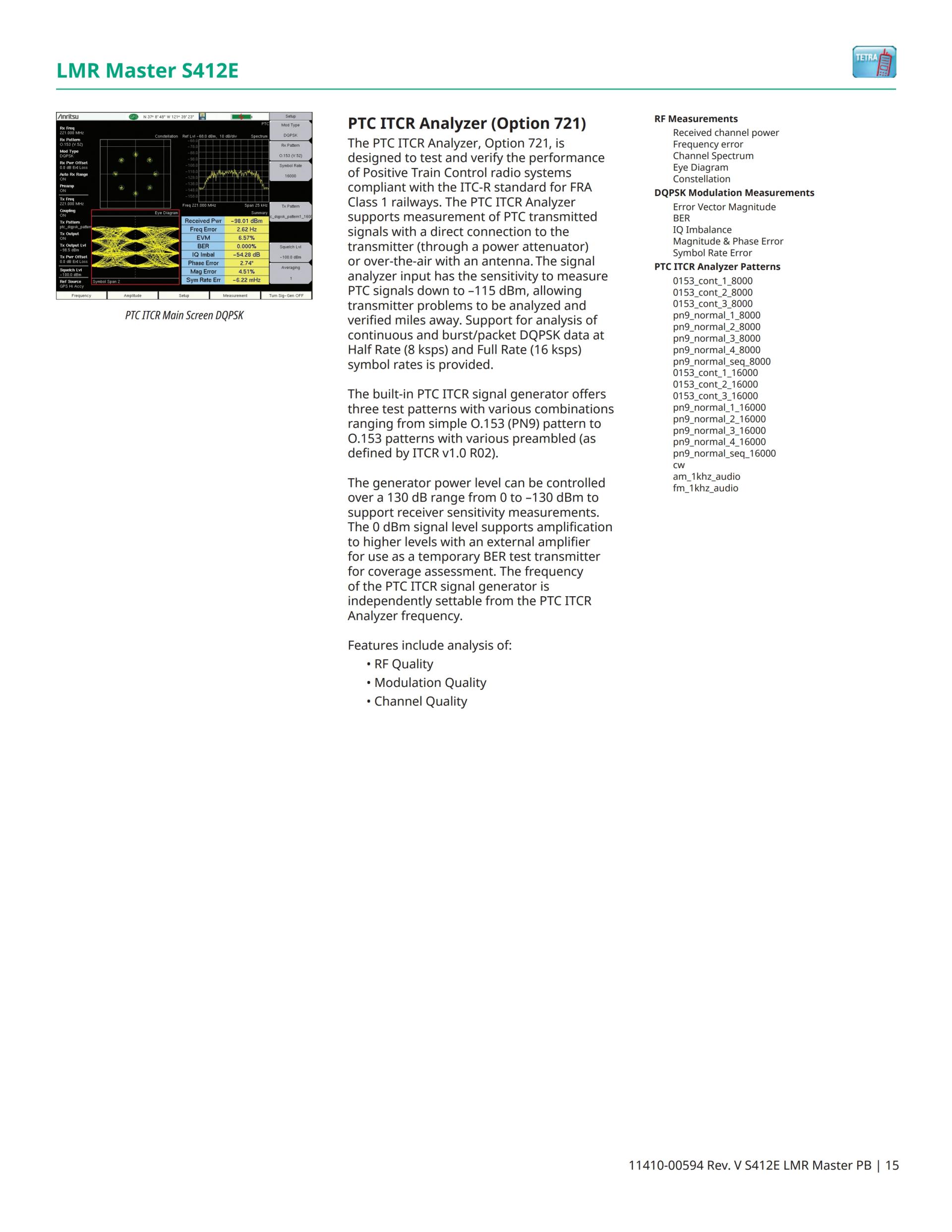 LMR Master S412E는 상업, 공공 안전, 해상 및 중요 인프라 라디오 시스템용으로 P25, P25 Phase 2 (TDMA), NXDN™, ETSI DMR, MotoTRBO™, ETSI TETRA, 및 LTE의 RF 성능의 현장 시험에 참여하는 LMR(Land Mobile Radio), PMR(Professional Mobile Radio) 전문가 및 엔지니어들에게 이상적인 기기입니다. 또한 LMR Master는 미국의 1급 철도 PTC(Positive Train Control) 시스템에 대한 지원을 제공합니다.