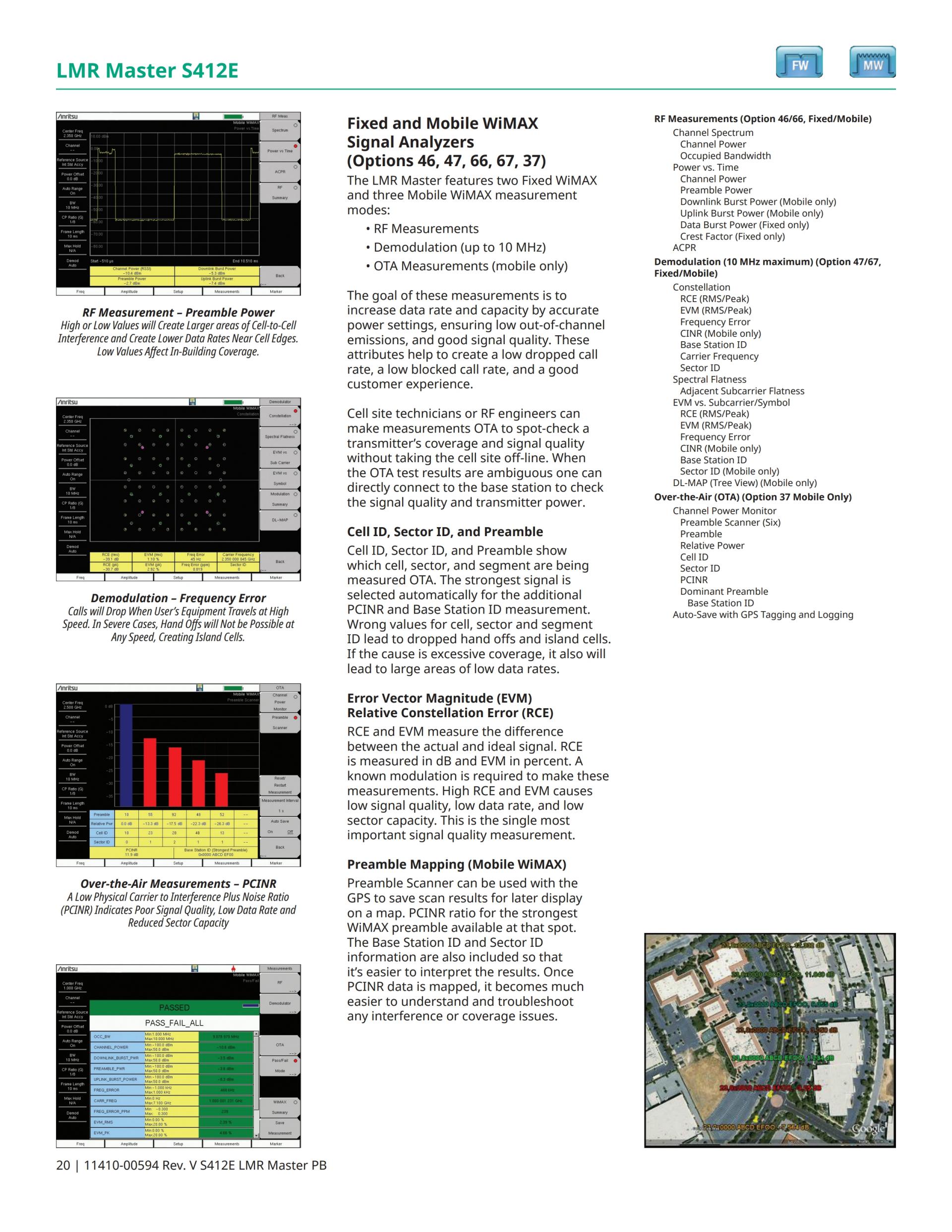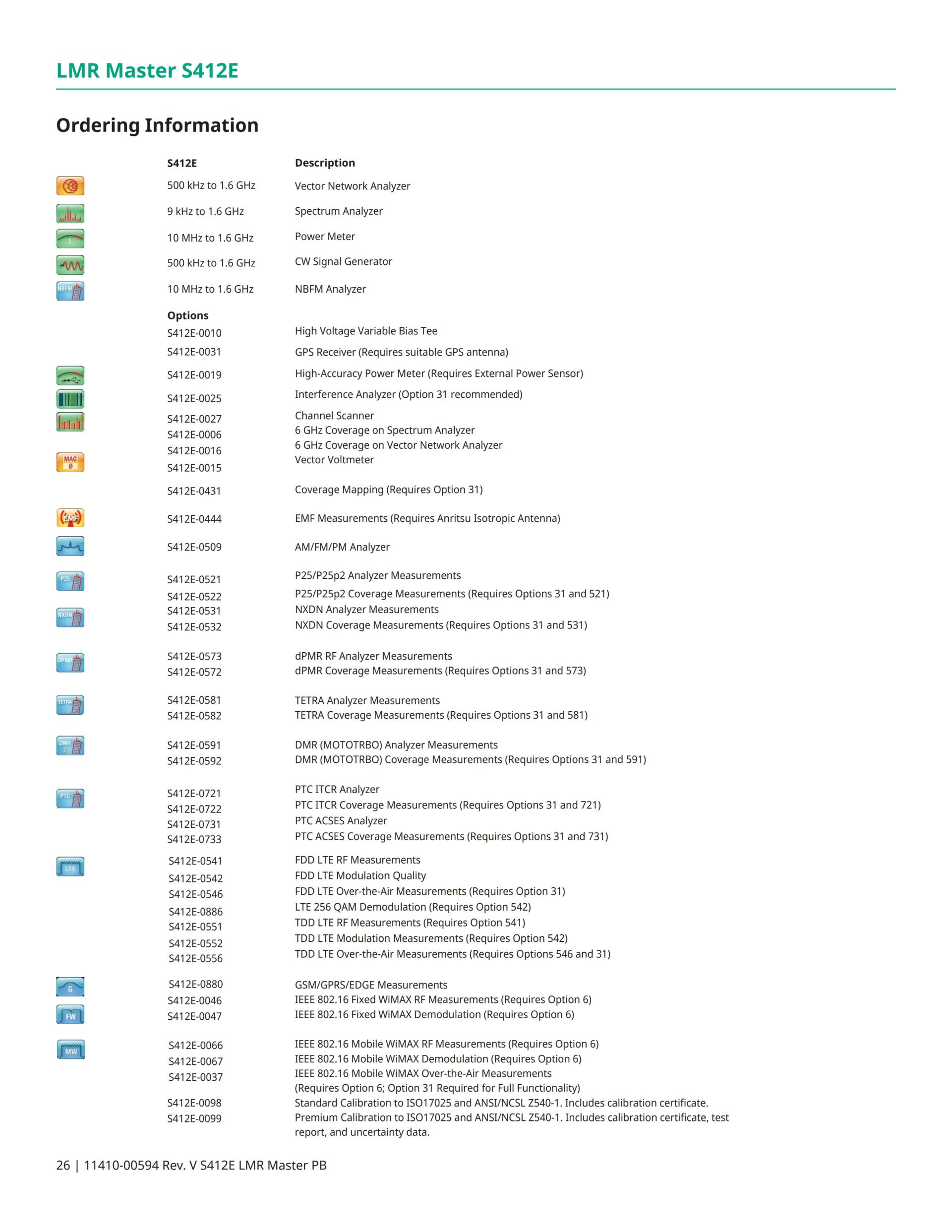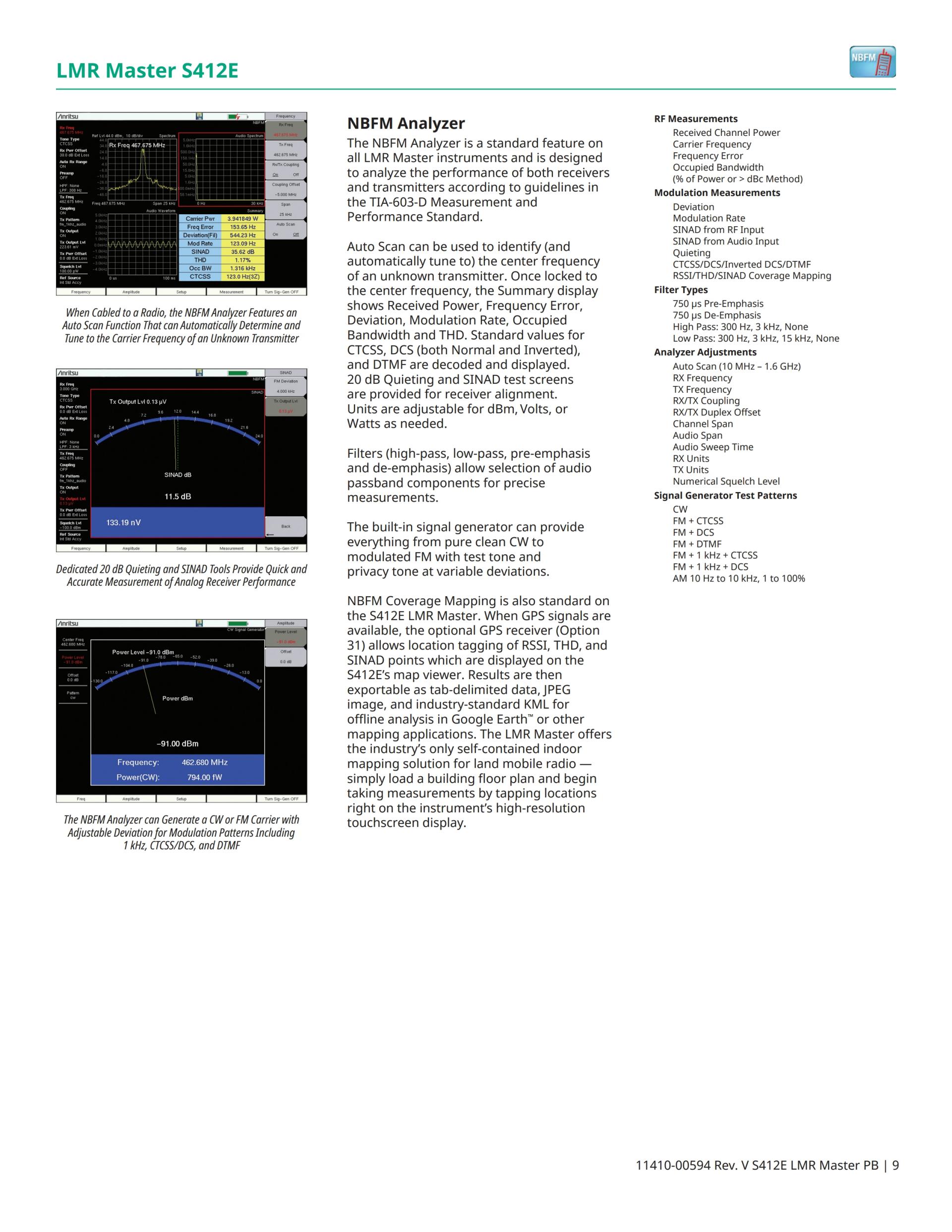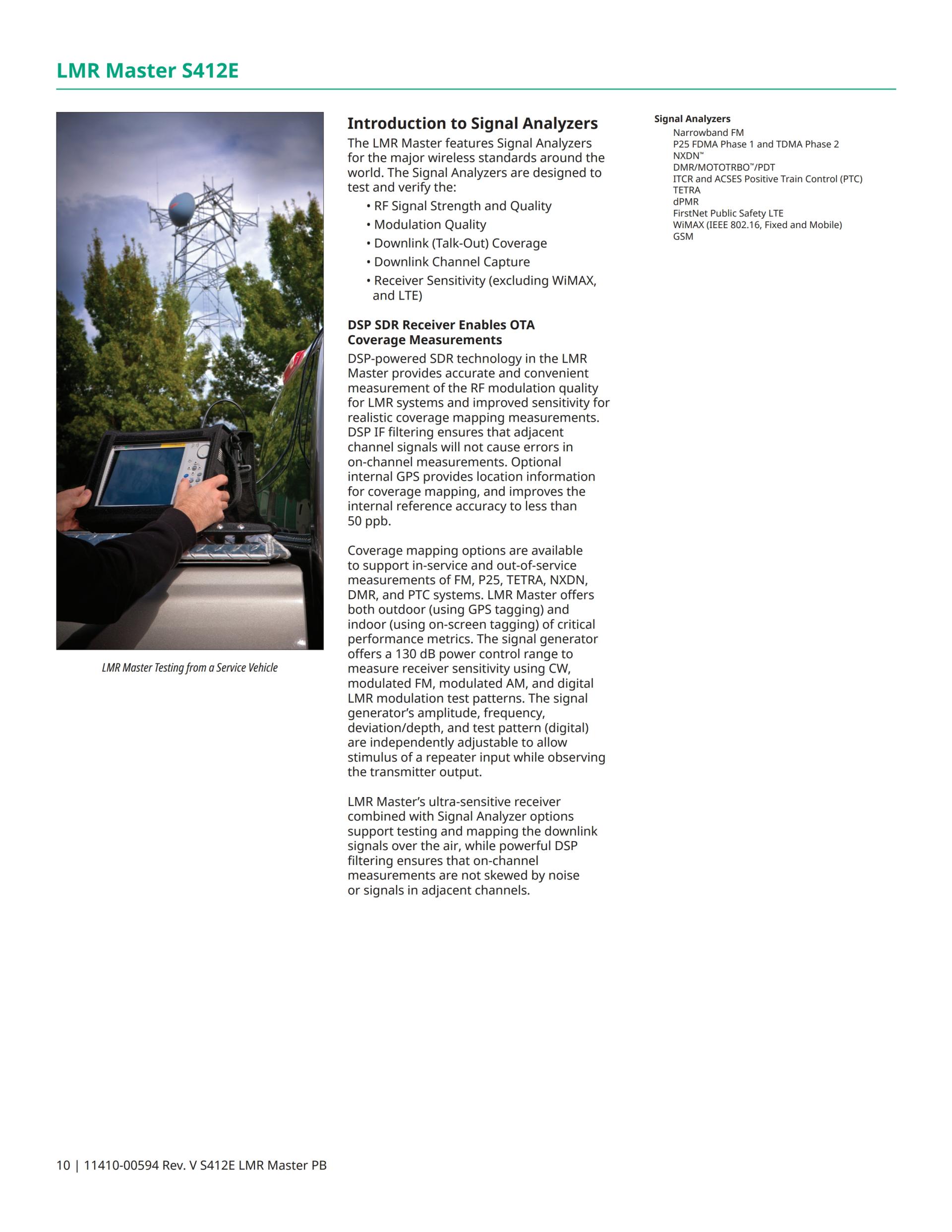 기본 모델 LMR Master는 VNA(Vector Network Analyzer) 및 스펙트럼 애널라이저(Spectrum Analyzer)가 장착되어 있으며 RSSI, 송신기 SINAD, 및 송신기 THD의 커버리지 매핑 등 협대역 FM 라디오 시스템의 분석 및 시험을 위해 지원합니다. P25 (TIA-102.CAAA-C), P25 Phase 2 (TIA-102.CCAA), NXDN™, ETSI DMR Tier 2, MotoTRBO™, ETSI TETRA, 및 PTC 등 디지털 LMR(Land Mobile Radio) 표준에 대한 옵션 지원도 이용 가능합니다. 옵션인 GPS 수신기를 통해 아날로그 및 디지털 LMR 시스템의 커버리지 매핑(실내에서는 터치스크린 태그되며 실외에서는 GPS 태그됨)을 지원할 수 있습니다. LMR Master는 광대역 공공 안전 시스템용으로 FDD & TDD LTE의 방송 중 분석과 지역 간 백홀(backhaul) 시스템용으로 WiMAX (Fixed IEEE 802.16d 및 Mobile IEEE 802.16e)의 분석에 대한 옵션도 제공합니다. LMR Master에는 스펙트럼 사진 레코더(Spectrogram Recorder), 간섭 분석기(Interference Analyzer), 프로그램 가능 채널 스캐너(Programmable Channel Scanner), 외장형 고정밀 RF 파워 미터(High-Accuracy RF Power Meter)(종단 센서 및 인라인 센서 등), 케이블 분석용 Distance Domain, 및 벡터 전압계(Vector Voltmeter)도 장착되어 있습니다. For railway operators that use GSM-R systems, the LMR Master can be configured with GSM/GPRS/EDGE measurements.