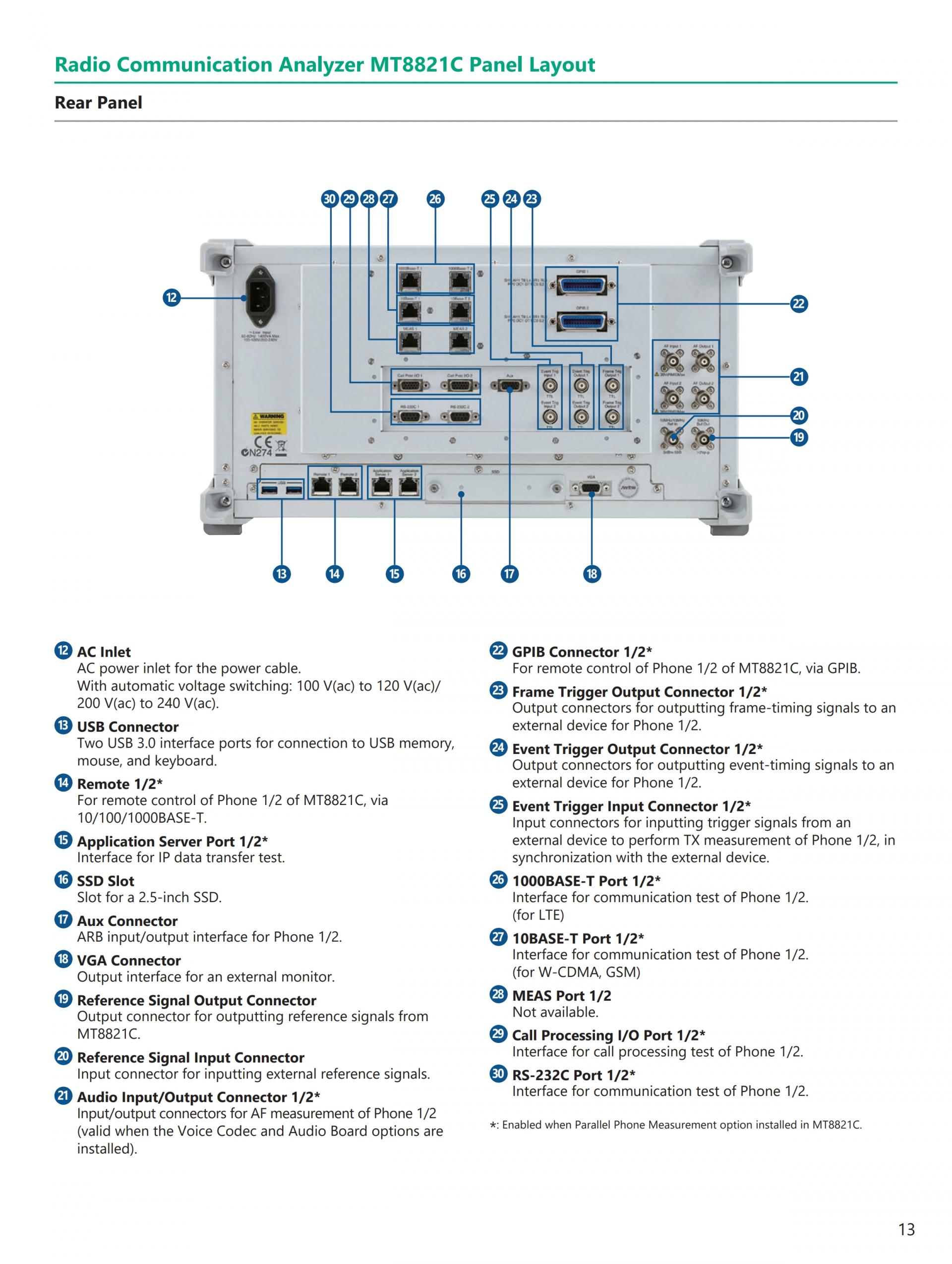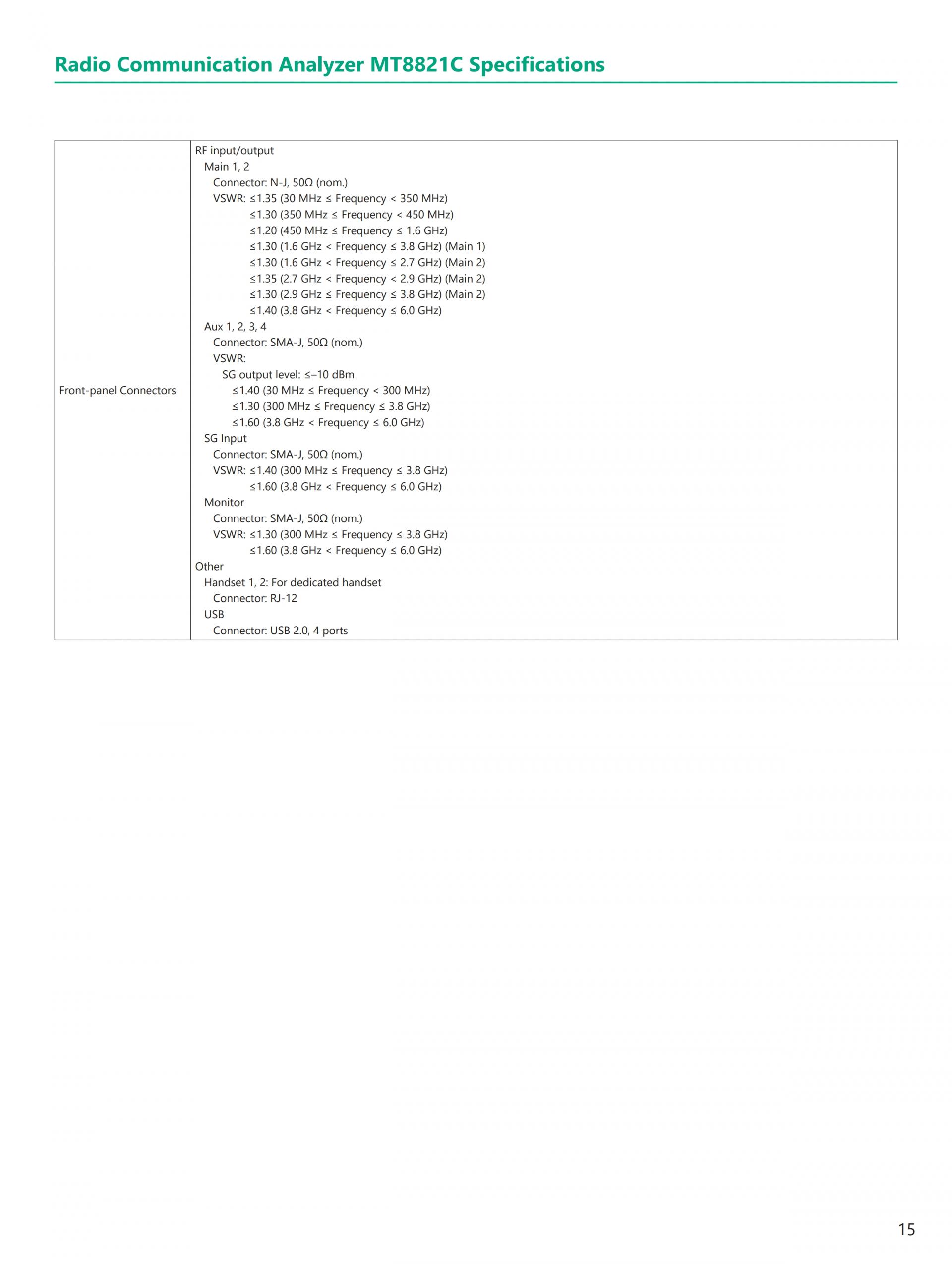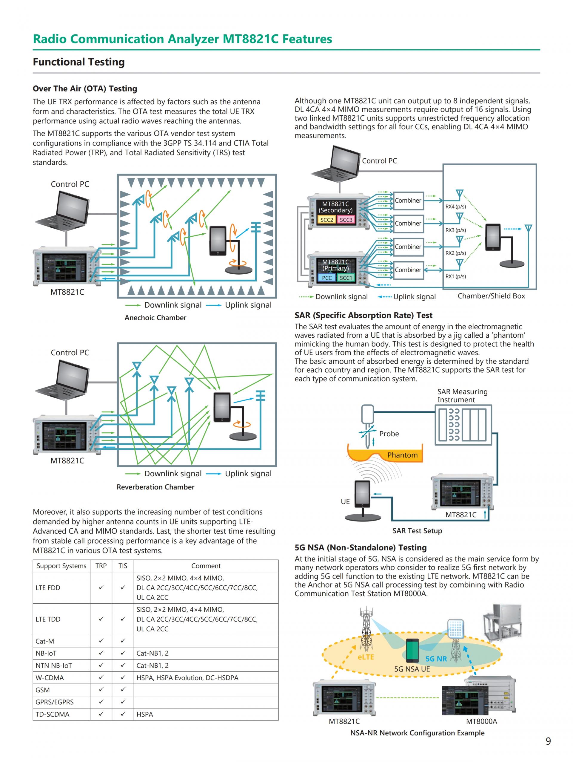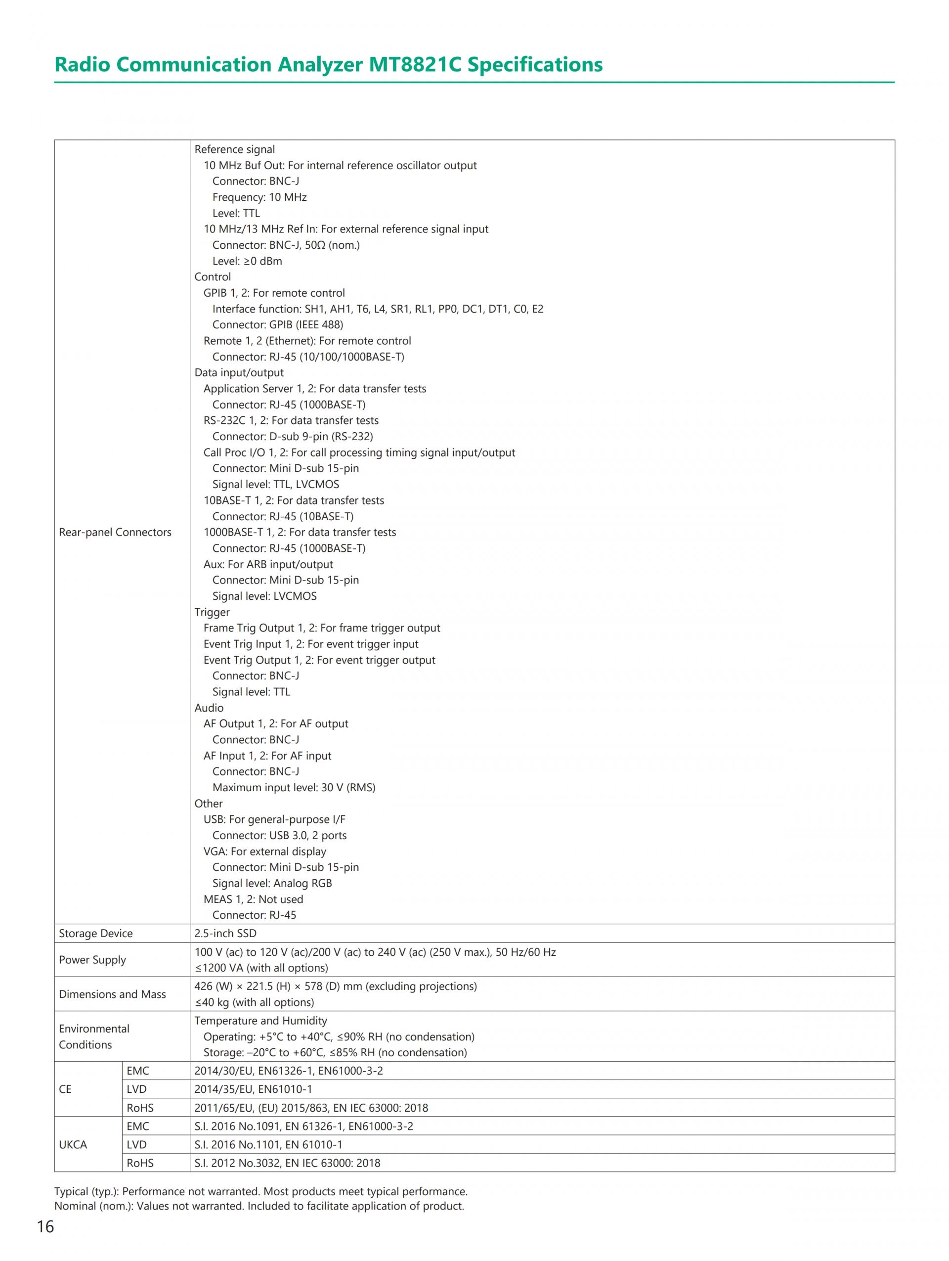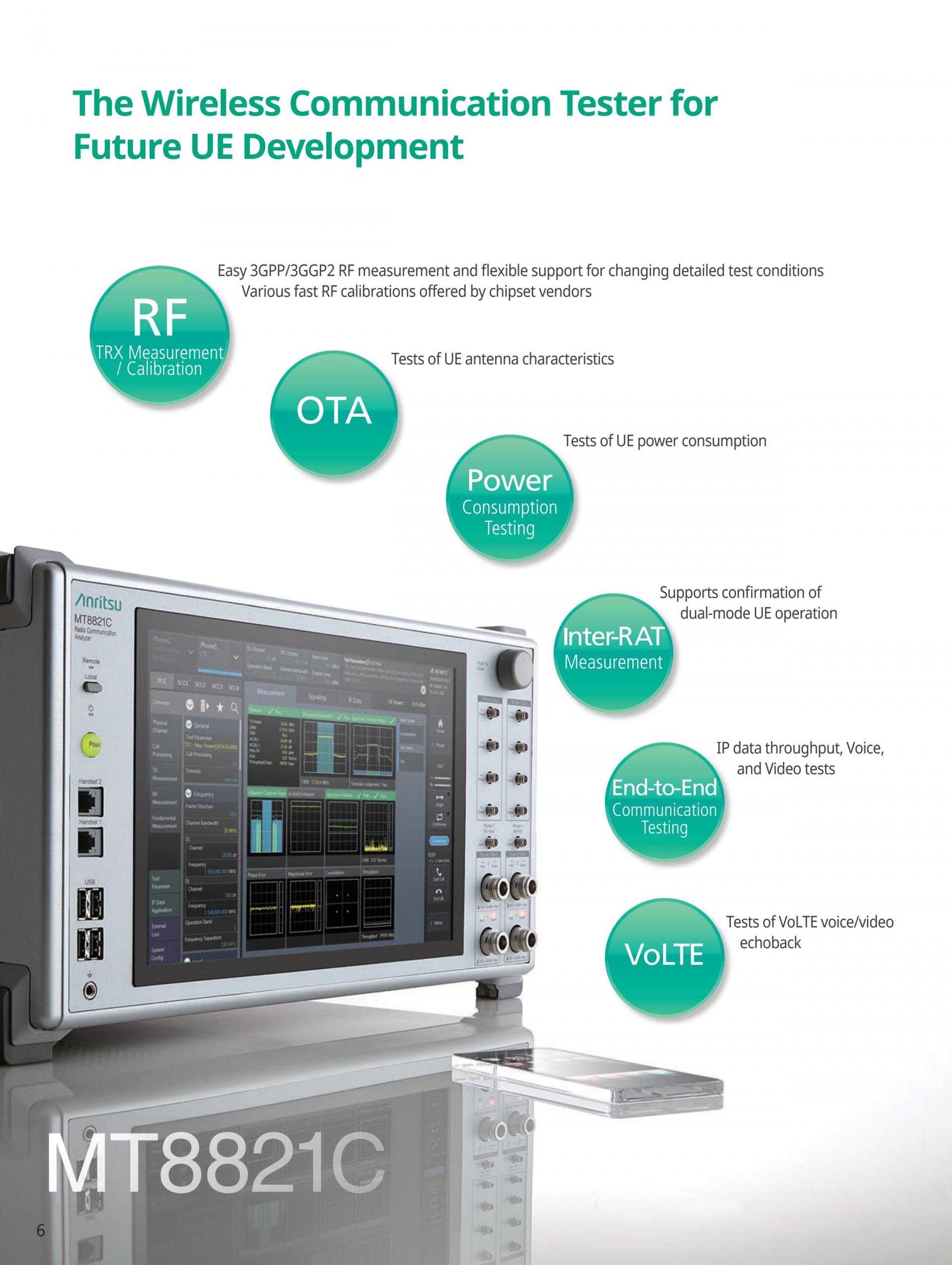 5 GHz 비인가 대역 등과 같은 다양한 통신 표준을 만족하는 UE RF TRX 테스트를 지원함으로써 MT8821C는 어떤 측정 상황에서도 이상적인 테스트 솔루션을 제공합니다.