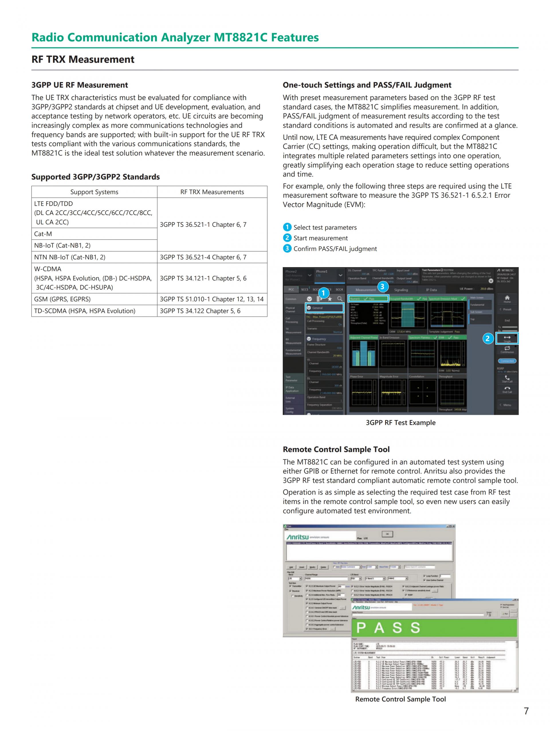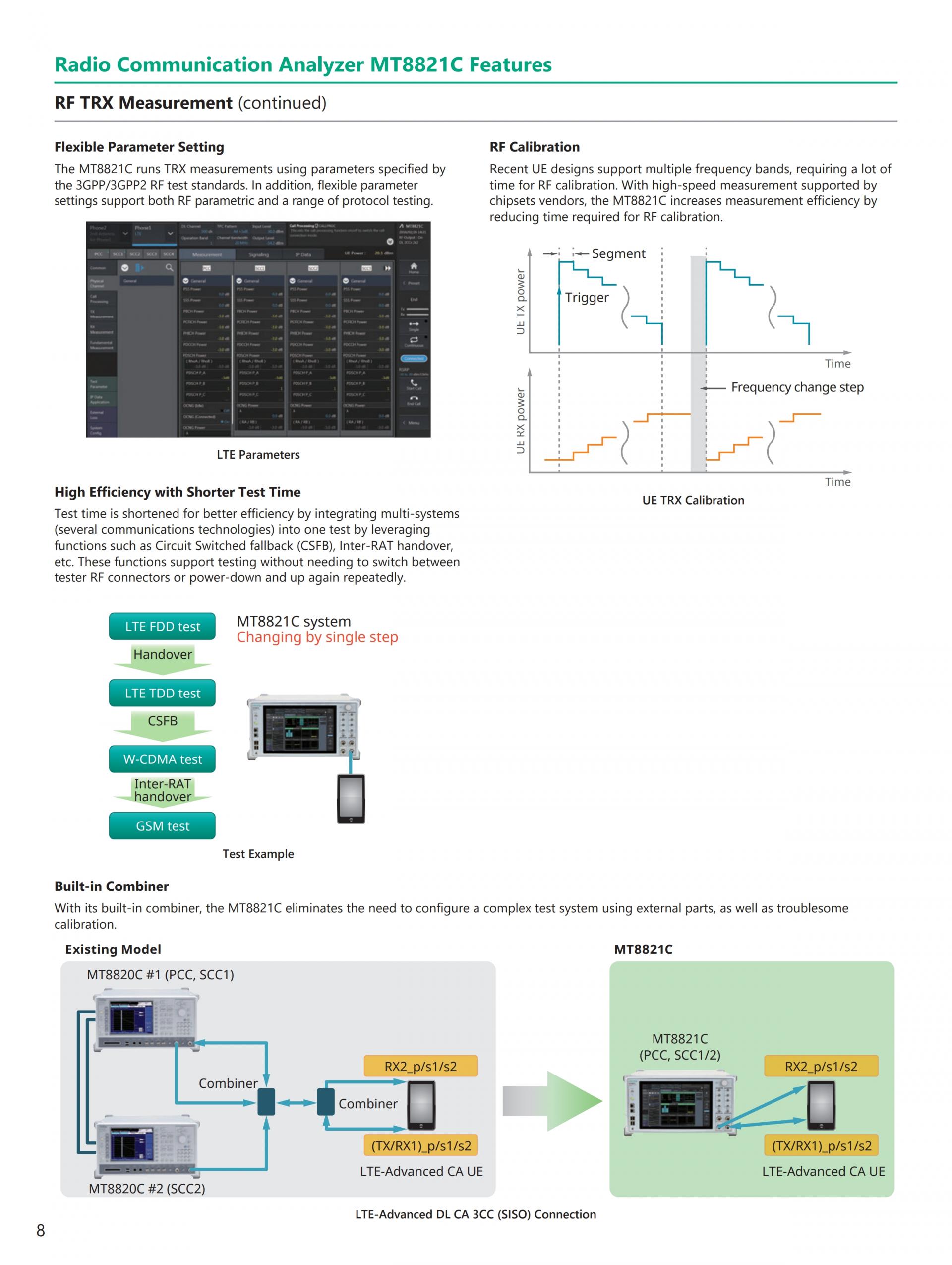MT8821C는 3GPP/3GPP2 RF 테스트 표준으로 지정된 파라미터를 사용해서 TRX를 측정합니다. 또 유연한 파라미터 설정으로RF 파라미터 및 단순한 프로토콜 테스트를 모두 지원합니다.