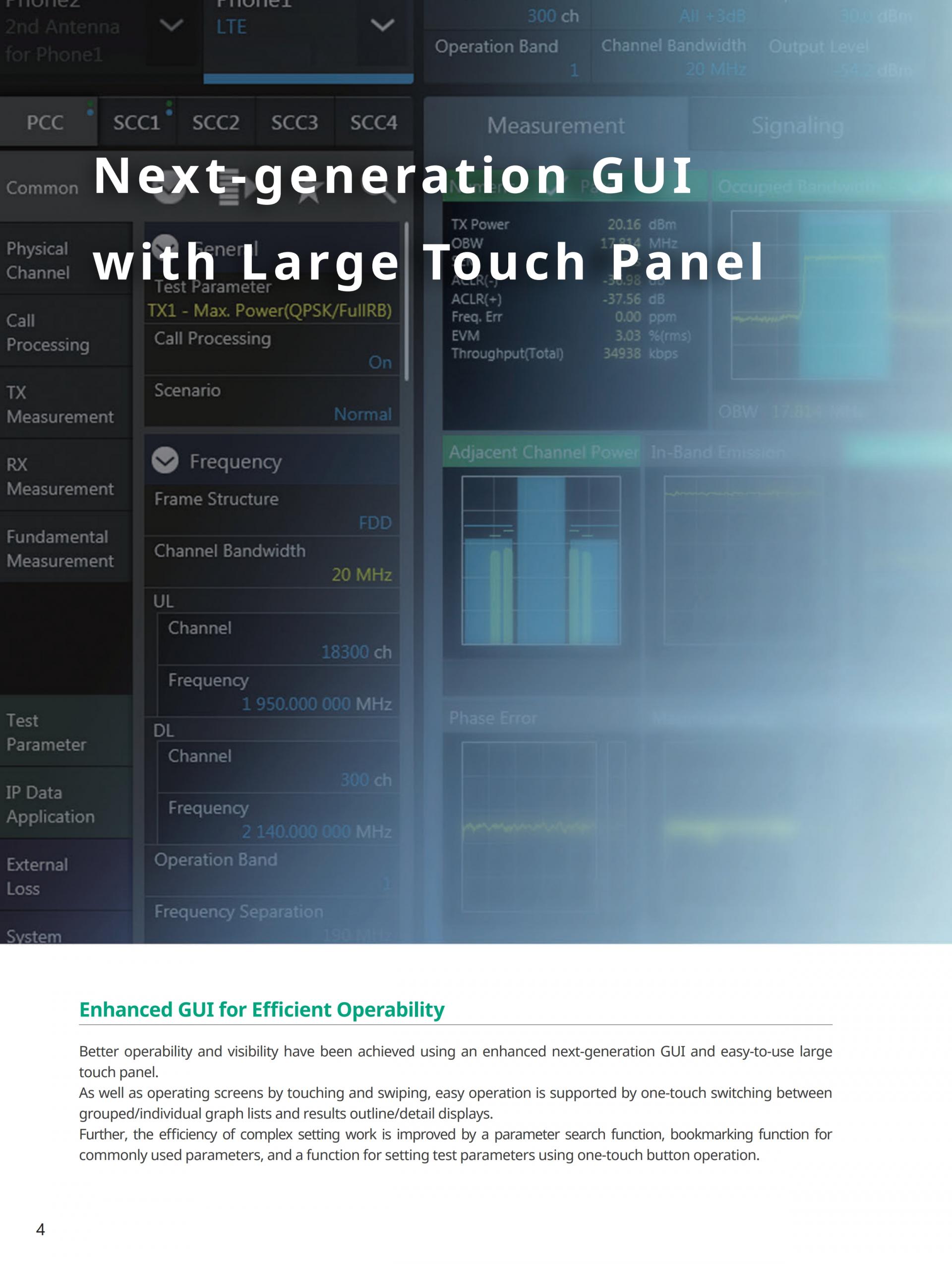 개선된 차세대 GUI 및 사용이 간편한 넓은 터치 패널을 사용해서 조작성 및 가시성이 향상되었습니다.또 터치와 스와이프로 화면을 조작하는 간편한 조작은 그룹/단일 그래프 목록과 결과 개요/상세 표시 간의 변환을 원터치로 가능하게 합니다.또한, 파라미터 검색 기능, 널리 사용되는 파라미터를 위한 북마크 기능 및 원터치 버튼 조작을 이용하는 테스트 파라미터를 설정하기 위한 기능에 의해 복잡한 설정 작업의 효율이 개선됩니다.